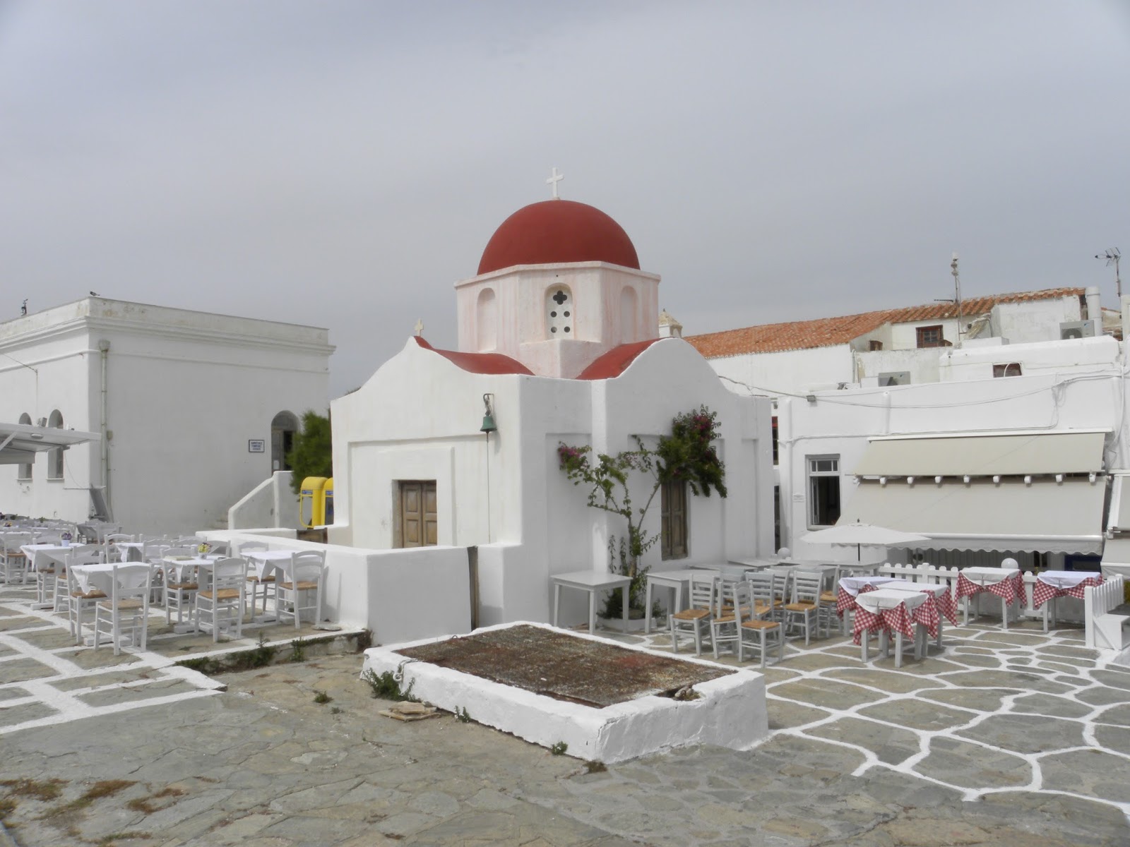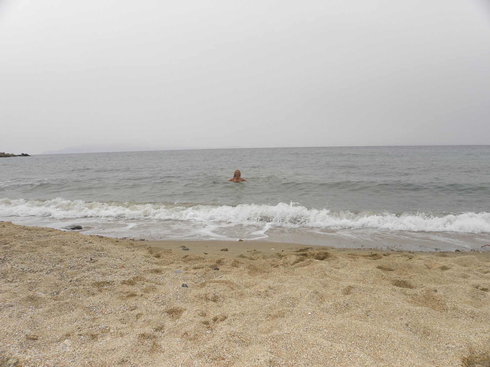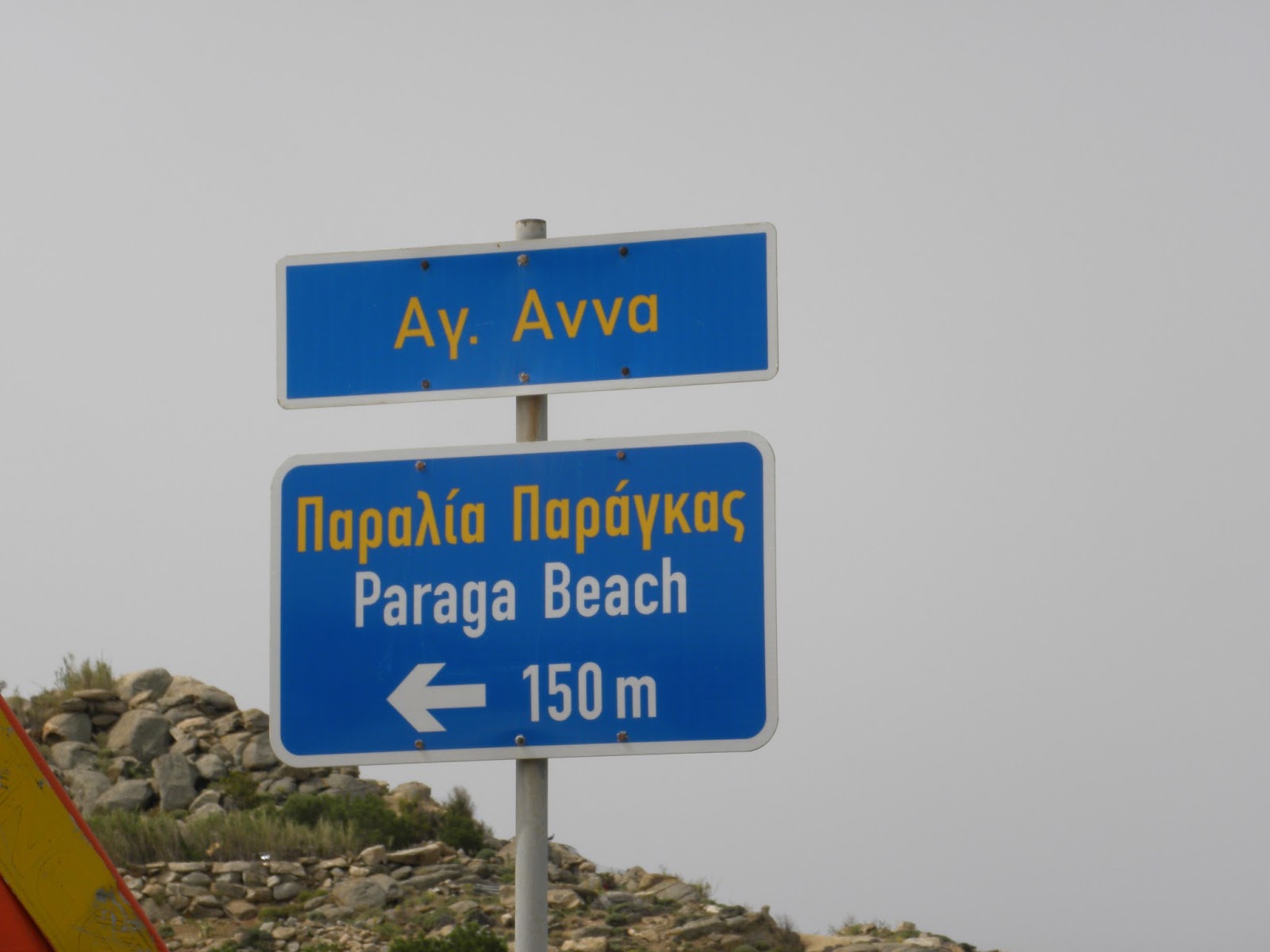 Olhei o mapa e decidi caminhar de Platis Gialos até Paraga com apenas 5 minutos de caminhada. As praias são muito pequenas. Imagino que as praias realmente fiquem muito cheias no verão, pois você pode correr de uma ponta a outra em 2 minutos. Novamente segui num caminho na estrada até Paradise Beach, mais uns 6 minutos. Assim que chegamos nos assustamos com os nudistas no início da praia, mas logo nos acostumamos. Em Paradise Beach, apesar de não utilizarmos os serviços dos clubes de praia (Tropicana Beach Club, Paradise Club e Paradise Lounge), o wi-fi estava aberto. O tempo começou a fechar. Só eu entrei na água, que estava geladíssima!