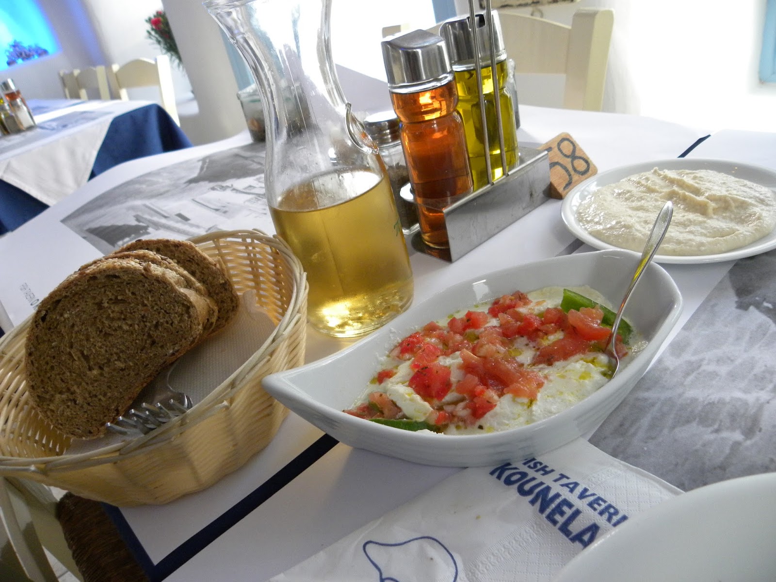 Naquele dia ventava bastante (entendi porque Mykonos é conhecida como “a ilha dos ventos”), mas estava quente. Seguindo a dica recebida no hotel, entramos no restaurante “Fish Tavern Kounelas“, que deixa o cliente escolher o peixe que vai ser assado, mas o serviço ainda não tinha começado. Comemos alguns petiscos, como o queijo feta assado, que estava delicioso.