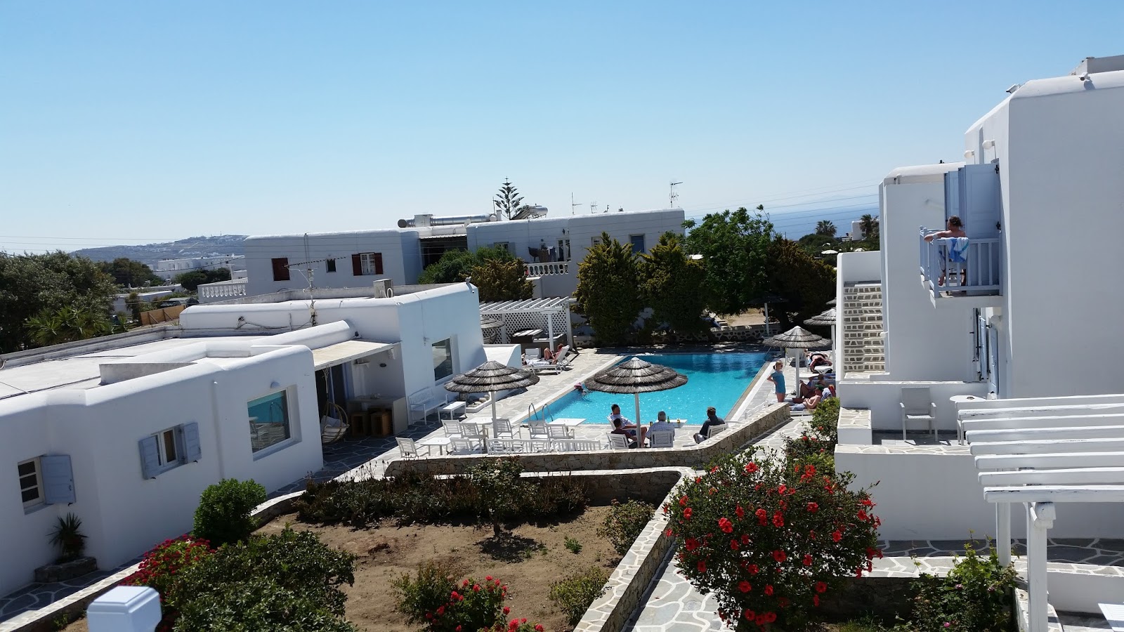 Ao contrário de Santorini, Mykonos tinha uma oferta menor de hotéis. E os preços eram mais caros. Recorri novamente ao tripadvisor e decidi pelo Aeolos Hotel, o segundo na classificação. No booking não tinha a opção de quarto com duas camas. Entrei no site do hotel e fiz uma consulta, no dia seguinte, me responderam dizendo que a opção buscada estava disponível, então a reserva foi feita na hora: 60 euros a diária. Há um campo para preencher os dados da chegada e horário previsto, já que no preço está incluído o transfer de ida e volta.