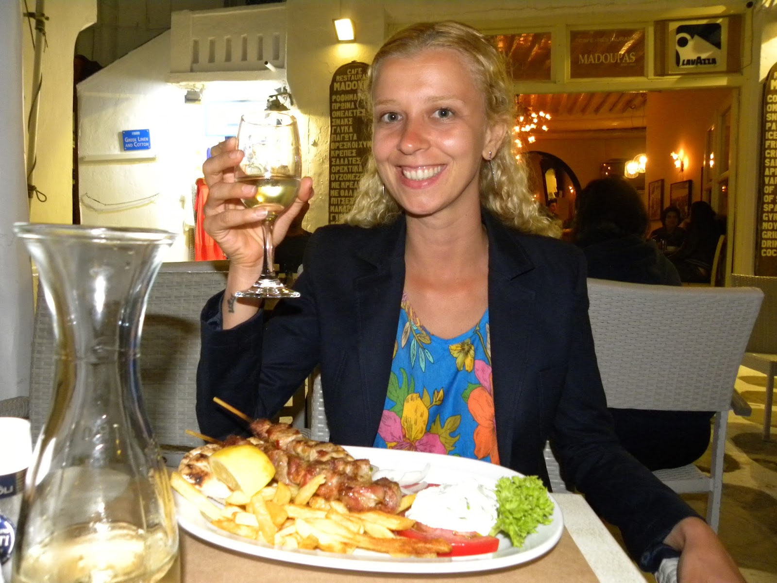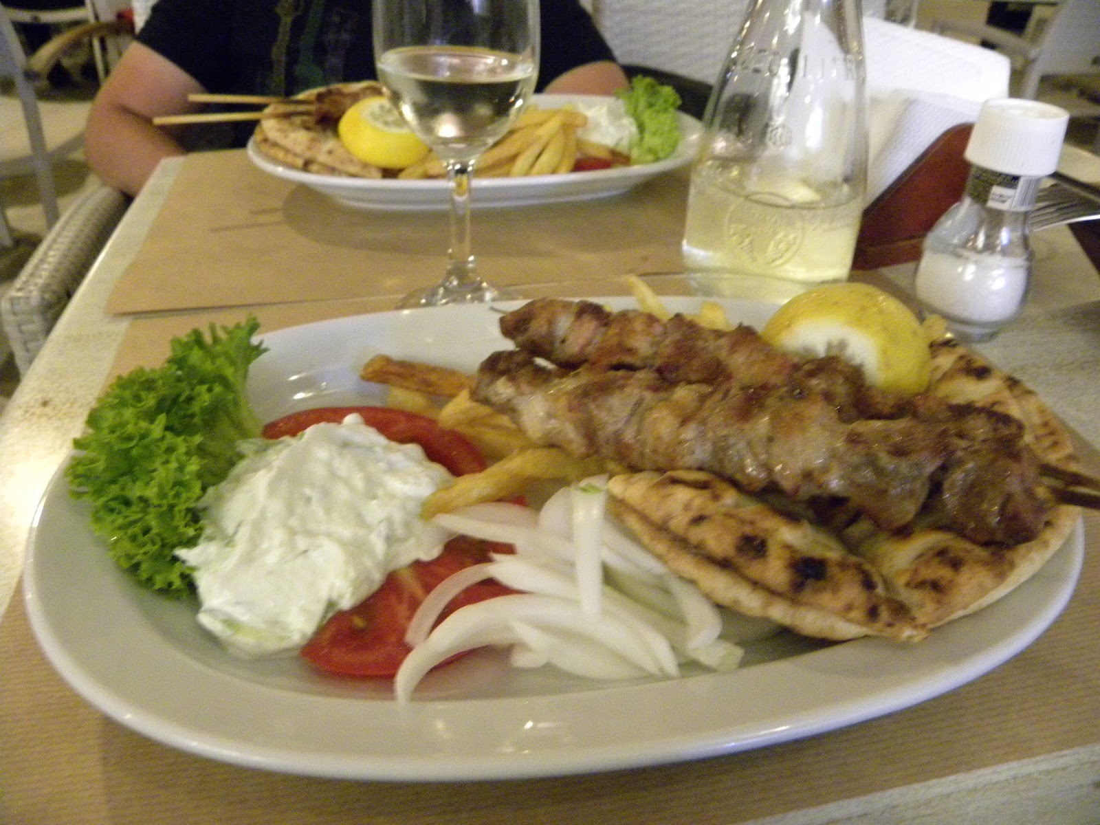No terceiro dia, decidi sair para jantar. Admito que subir a ladeira me desestimulou muito a sair a noite nos dias anteriores. A comida escolhida foi o Souvlaki, 10 euros, que é um pita gyros desconstruído. Dois espetinhos de carne de porco, batata frita, salada, tzatziki e pão pita. O restaurante Madoupas tem vista para o antigo porto e o preço é bom.