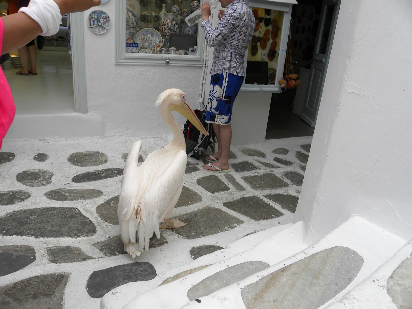 No retorno de Delos, ficamos em Chora, para evitar o sobe e desce de ladeira até o hotel. Caminhamos pelo centro (que é minúsculo) cheio de ruas estreitas e, por sorte, um encontro com o símbolo e mascote da cidade: o pelicano Petros. O animal caminhava tranquilamente entre os turistas, embora sofresse uma perseguição implacável, com direito a selfies de alguns.