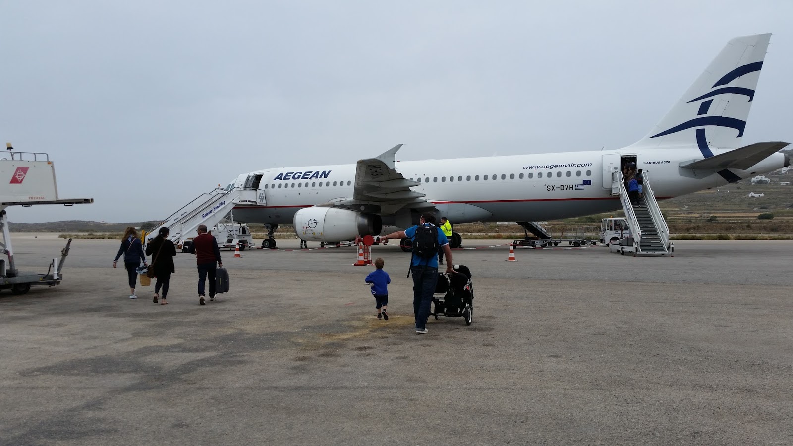 No quinto dia, acordei cedo, tomei café e vi que o dia estava chuvoso. Avisei ao gerente sobre o horário do voo, que prontamente organizou o transfer. O aeroporto é minúsculo. Os próprios passageiros despacham as malas. Só tem um raio-x e um policial para fazer toda a checagem. O voo de Mykonos para Atenas foi barato, custou 25 euros e foi comprado no site da própria companhia aérea grega. Em apenas 45 minutos estaria em Atenas!