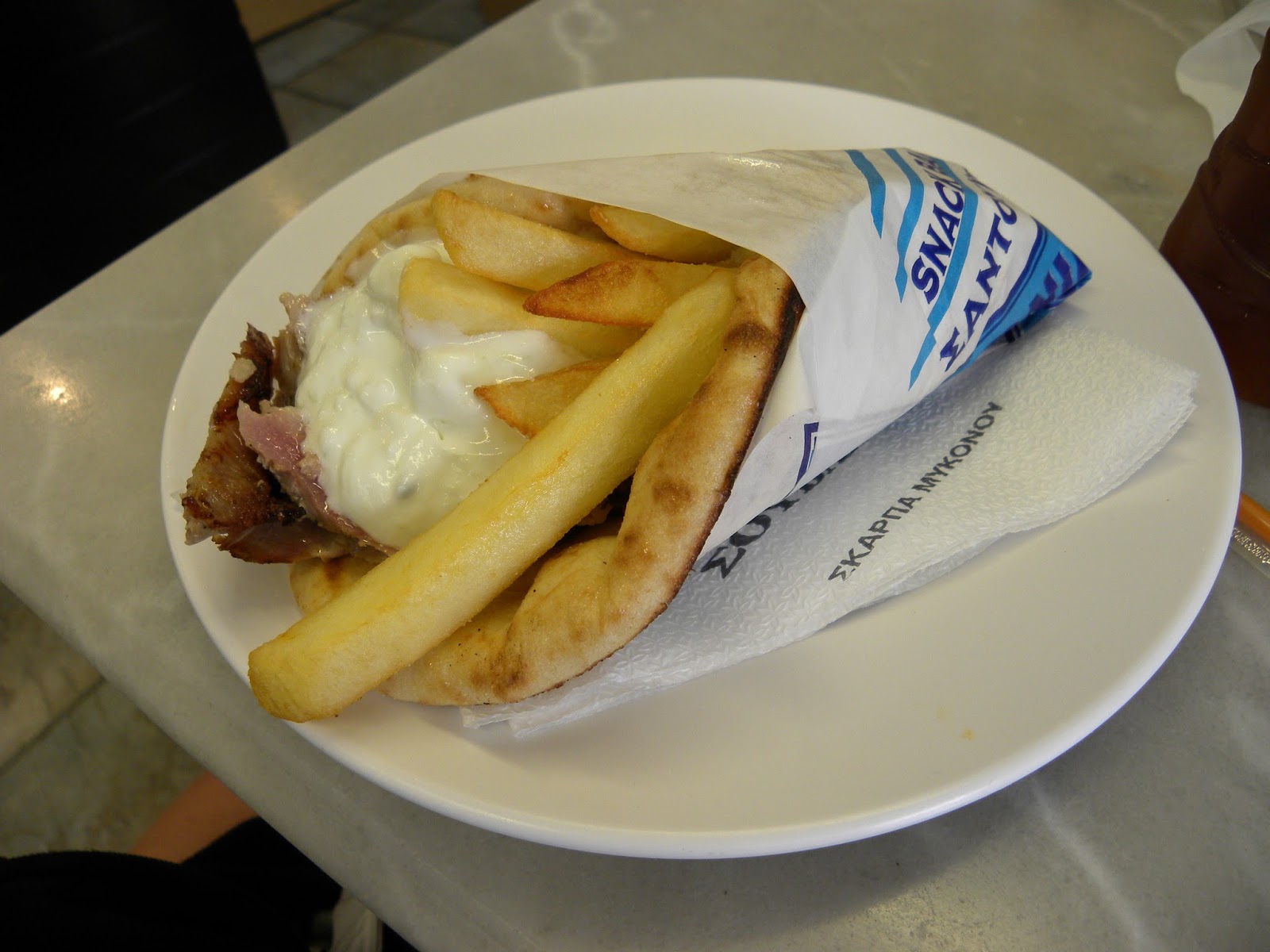 Depois foi necessário fazer uma parada estratégica para comer um delicioso pita gyros no “Snack Bar”. O lanche, além de delicioso, tem a melhor relação custo-benefício para os turistas econômicos, custa 2,80 euros. Um pão pita com batata frita, tzatziki, carne de porco e salada.