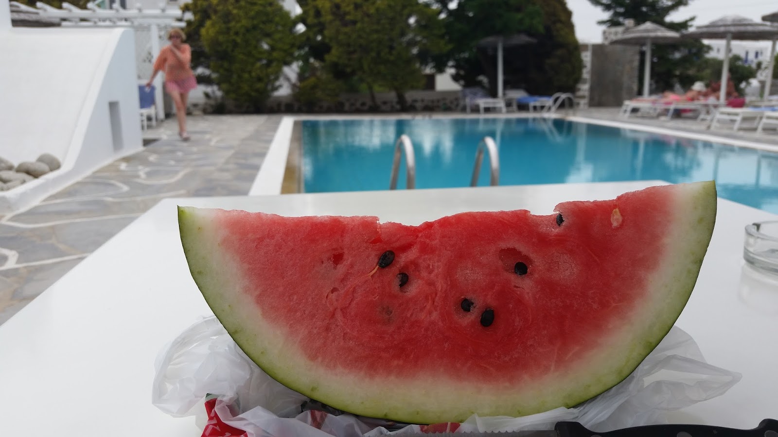Ao lado do hotel tem um mercadinho e uma quitanda de frutas, mas preferimos caminhar uns 800 metros até um supermercado para comprar algumas coisas. Comprei suco de romã, azeitona, tzatziki, biscoito. Decidi que Mykonos seria um lugar para meu merecido repouso, já que tinha mais tempo na ilha que nas demais cidades visitadas.