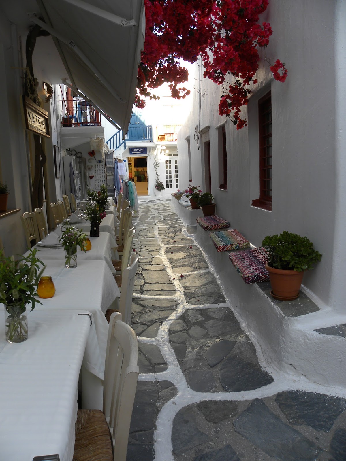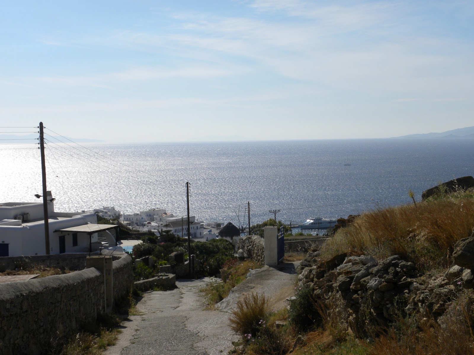No segundo dia, desci para o café da manhã às 8h e pude provar um delicioso iogurte grego com mel de Creta. O iogurte era feito lá mesmo e tinha uma textura de chantilly. O café da manhã era farto, com opção de queijo feta com azeitonas, croissants, café, bolo. Depois descemos a ladeira rumo ao antigo porto para comprar um passeio a Delos, que contarei em post apartado.