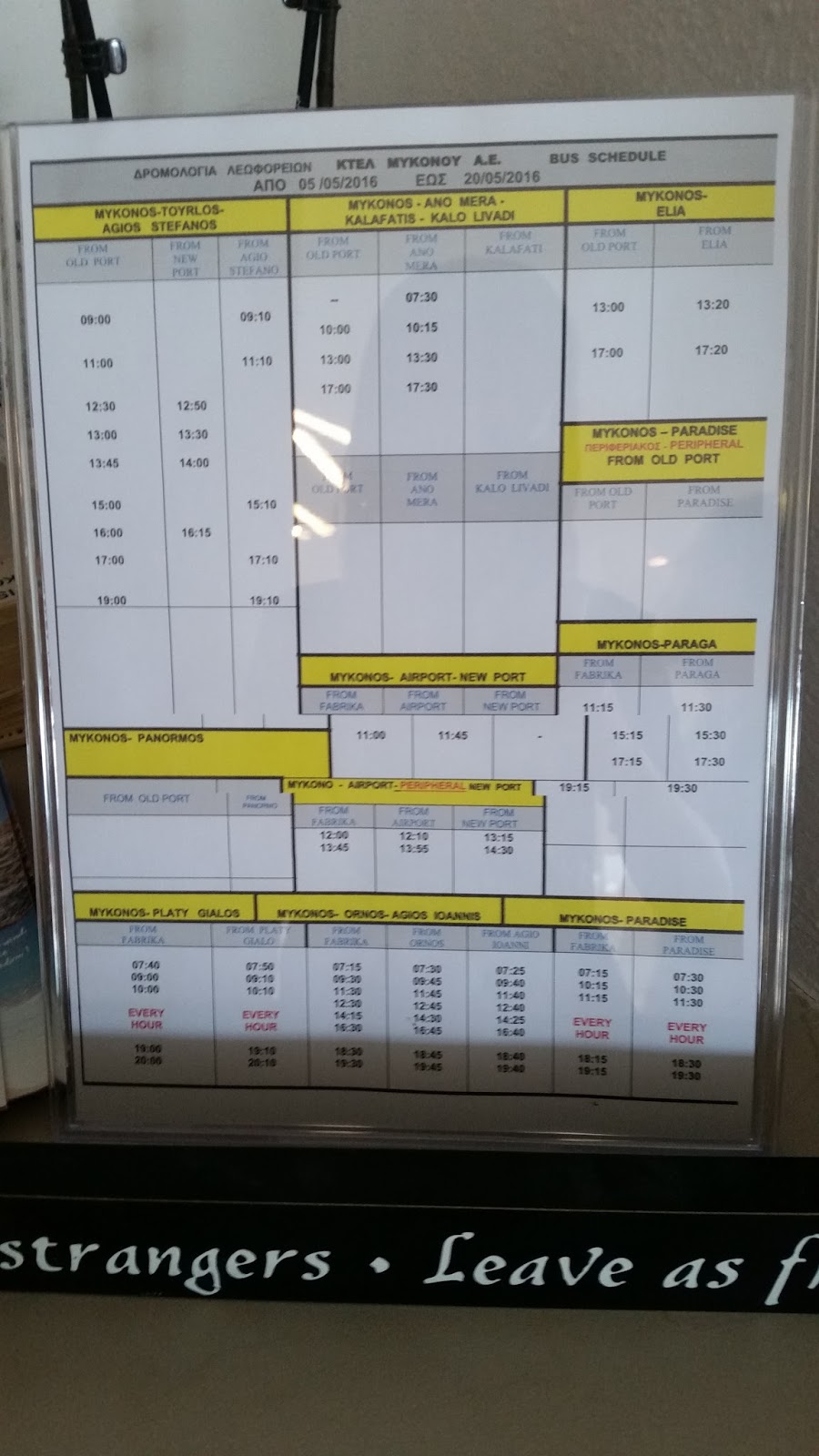 Caminhei até a rodoviária (os ônibus ficam estacionados na rua, num local denominado “fabrika”) para pegar o transporte público até Platis Gialos. Os ônibus da KTEL saem de 3 localidades distintas. A passagem custa 1,80. É necessário olhar diariamente a tabela com os horários de saída e retorno dos ônibus. De “Fabrika” saem ônibus para Platis Yalos, Psarou, Ornos, Ai Yannis, Paradise.