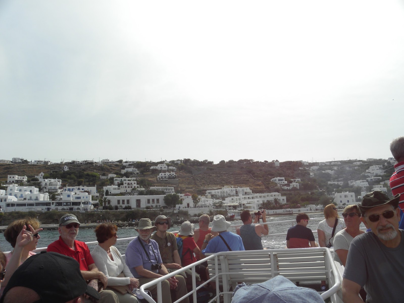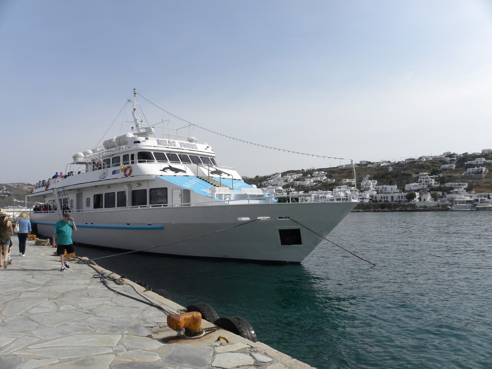 No dia em que chegamos em Mykonos, passamos pelo Antigo Porto e verificamos a hora de partida do passeio (10h) e o valor (20 euros). No dia seguinte, acordamos, tomamos café no hotel e quando olhamos o relógio já passava das 9:30. Descemos as vielas esbaforidos e corremos até o porto. O relógio marcava 2 minutos para as 10h. Compramos o ingresso e entramos no barco.