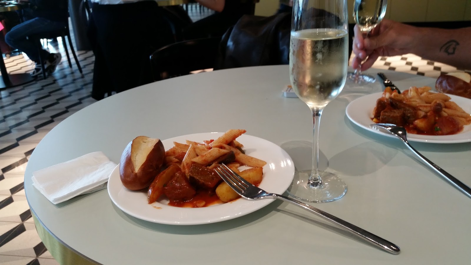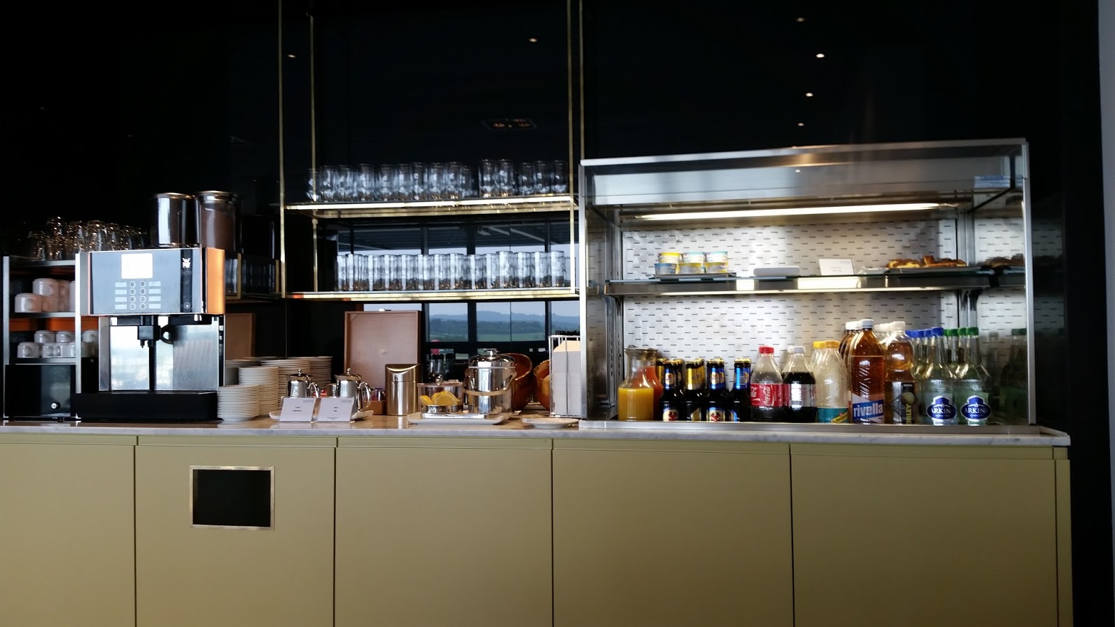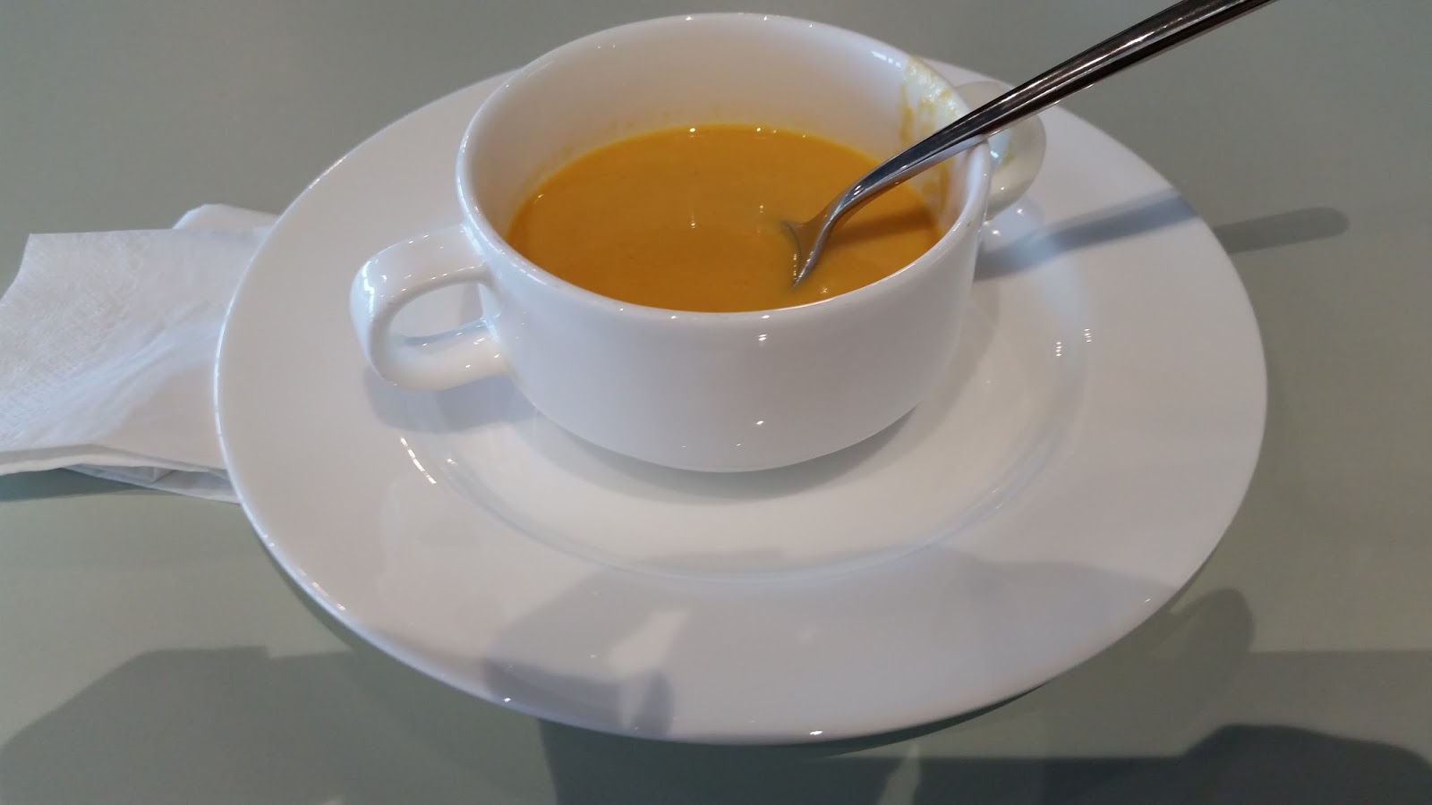Teríamos longas horas na sala. Chegamos ainda no período de café da manhã com opção de pães e queijos. Máquina de café e frutas. Pouco depois o cenário mudou para o almoço. E todas as opções eram excelentes! Tinha uma sopa maravilhosa de abóbora com gengibre. Tinha penne ao ratatouille, hambúrguer. Para beber encontramos diversas opções: água, refrigerante, suco natural, máquina de café, cerveja, vinho, etc.