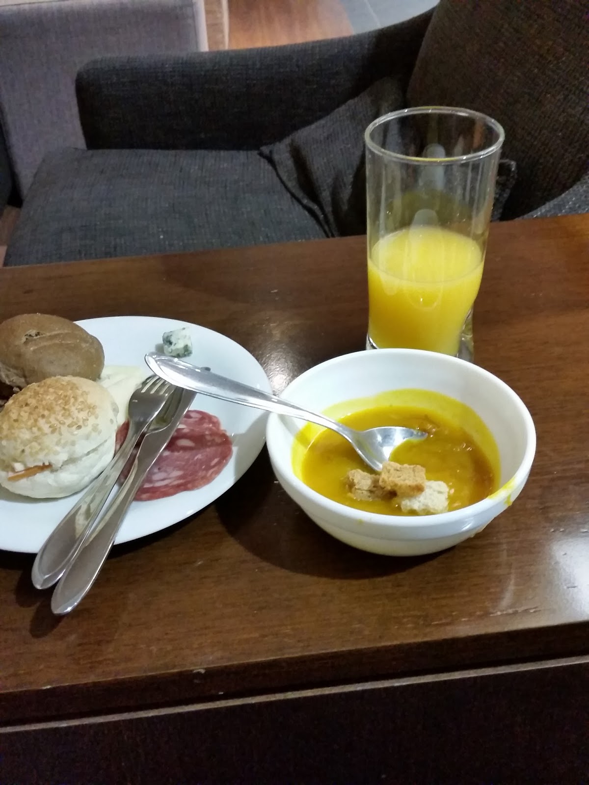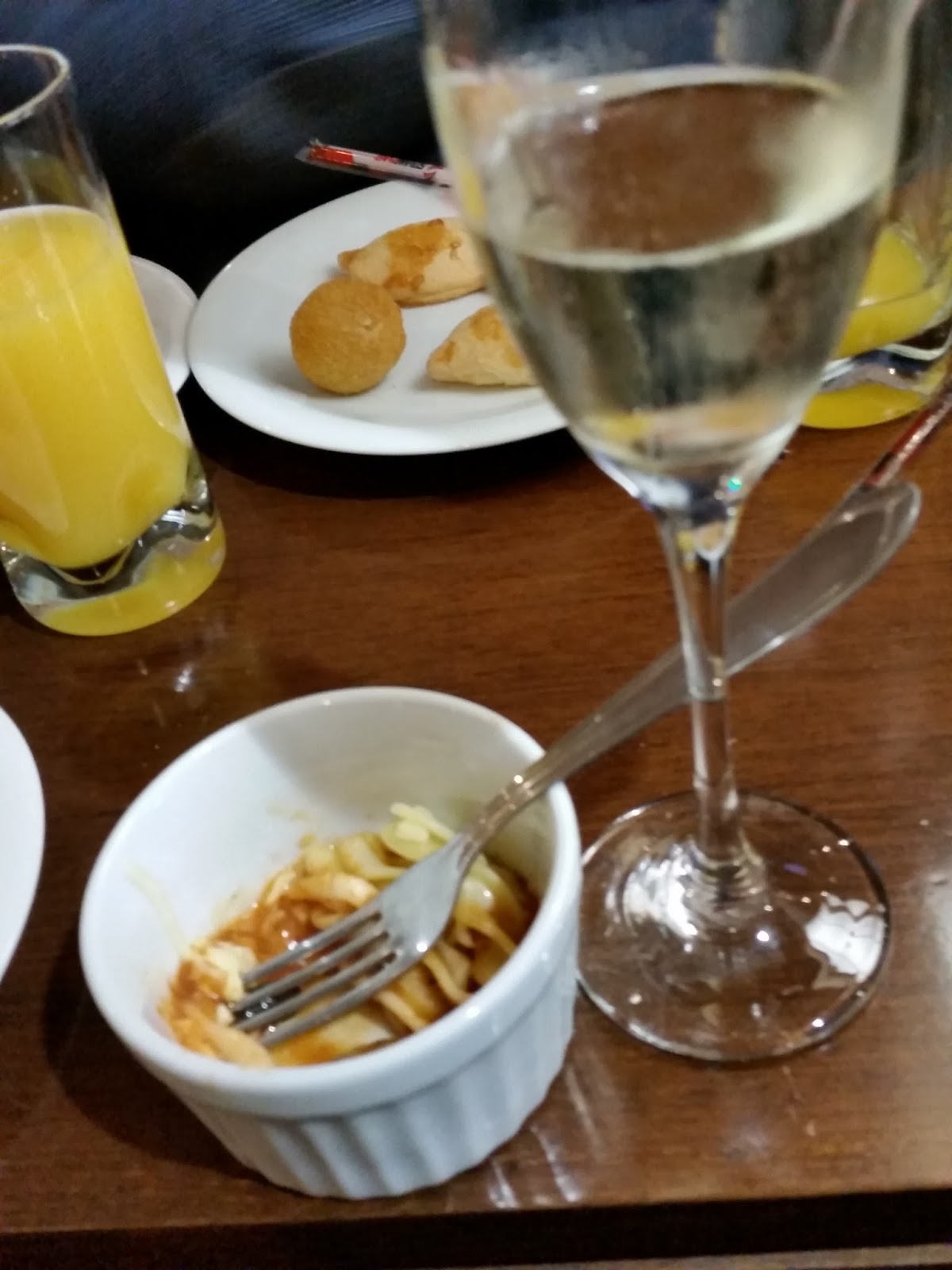 Provei uma sopa incrível de abóbora com gengibre, depois provei um macarrão à putanesca, salgadinhos e sanduíches. Bebi espumante, vinho branco e cappuccino. Experimento quase tudo!