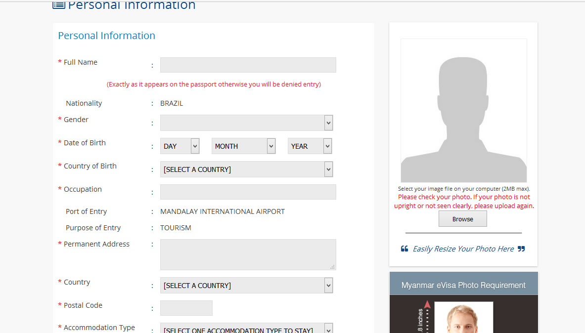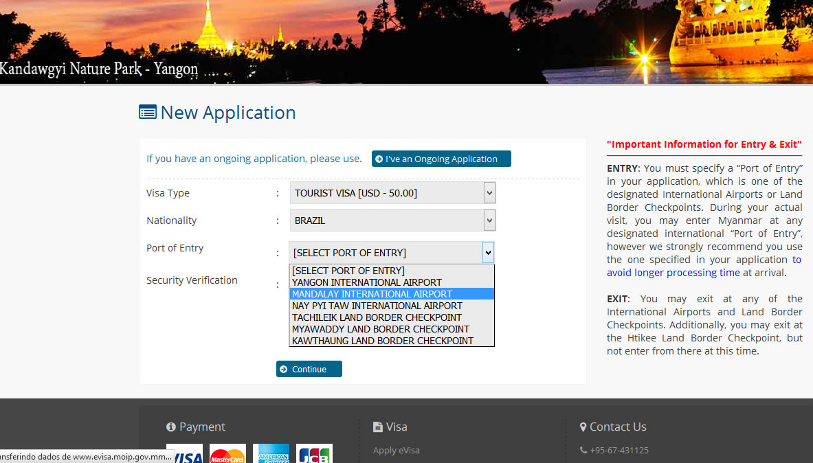 O primeiro passo é acessar o site http://www.evisa.moip.gov.mm/NewApplication.aspx#. Na primeira página você vai preencher o tipo de visto – o de turista custa 50 dólares, depois a nacionalidade e o mais importante: a cidade que será sua porta de entrada no país. É bom ter uma ideia do que quer visitar antes de escolher. Não sei se antigamente só entrava pela capital, Yangon, mas encontrei essa informação em alguns blogs. Hoje o site disponibiliza 6 opções (3 aeroportos). Meu objetivo era conhecer Bagan, logo, optei por Mandalay, por ser a cidade mais próxima (4/6 horas de van), mas Yangon tem mais opções de voos, por exemplo, e tem ônibus noturno (10 horas) até Bagan. Antecipo que a Airsia tem um voo diário de Bangkok para Mandalay, mas para Yangon existem mais opções em outras companhias aéreas.