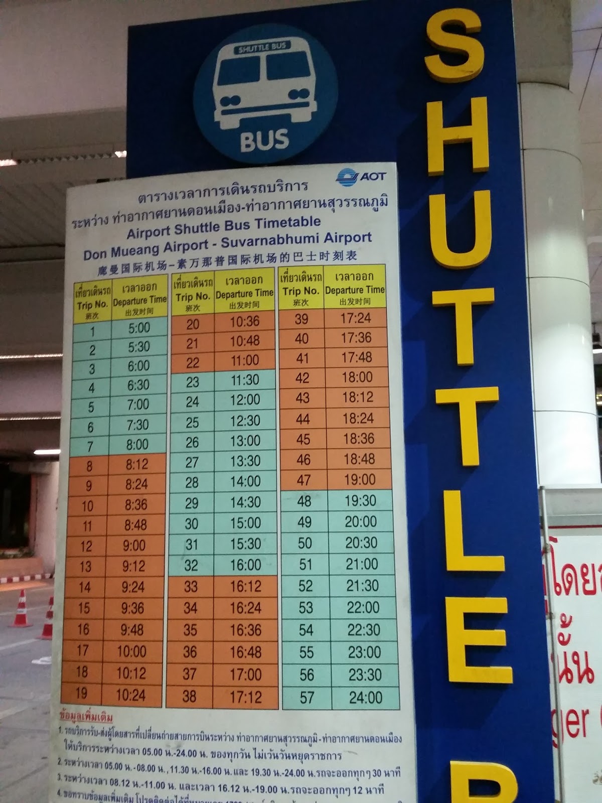 Existe o serviço gratuito de transfer entre os dois aeroportos chamado “Airport Shuttle Bus”. Até pensei em comprar passagem no mesmo dia para Mianmar e aproveitar o serviço, mas se houvesse um atraso, perderia a passagem. Em Don Muang, a parada do ônibus fica no portão 6 do desembarque. É preciso mostrar a passagem do voo partindo do outro aeroporto para se beneficiar do serviço. O primeiro ônibus sai 5 da manhã e o último parte meia-noite. Em alguns horários funciona de 30 em 30 minutos e nos períodos de pico de 12 em 12.