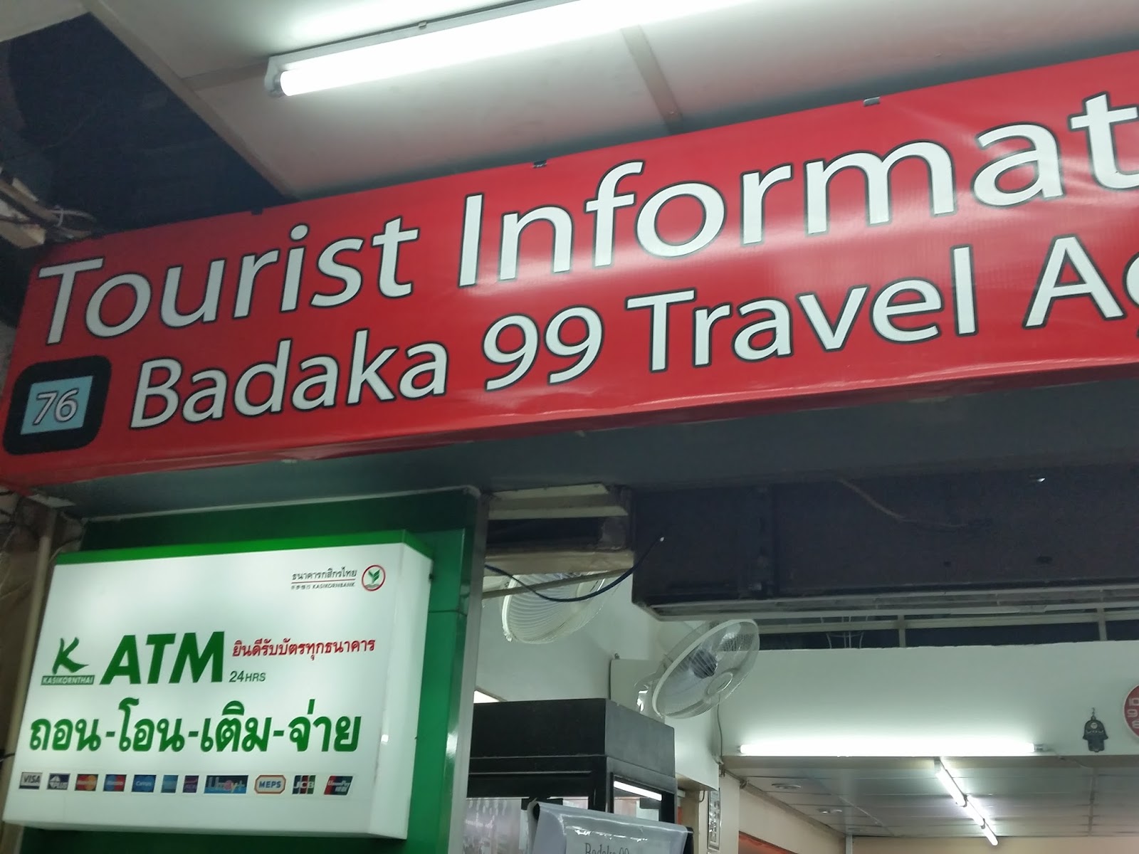 Já estava contando com um gasto de 1.000 baht para ir para o aeroporto pela manhã, mas de repente vi várias barracas e placas vendendo passagem de van para os dois aeroportos. Observei que só tinha saída de 2 em 2 horas para o Don Muang, de onde partiria meu voo para Mandalay. Começando 6 da manhã. O melhor horário para mim seria 7, já que o café da manhã começava 6. Resolvi andar para ver se existia outras vans com outros valores. Quando voltei na barraca em frente ao hotel, não tinha mais disponibilidade, a vendedora nem ligou para saber. Já passava de meia-noite e saí da Rambuttri em direção a Khao San, quando entrei numa agência turística (Badaka 99, que funciona 24 horas) e tinha disponibilidade, por 150 baht = 15 reais!