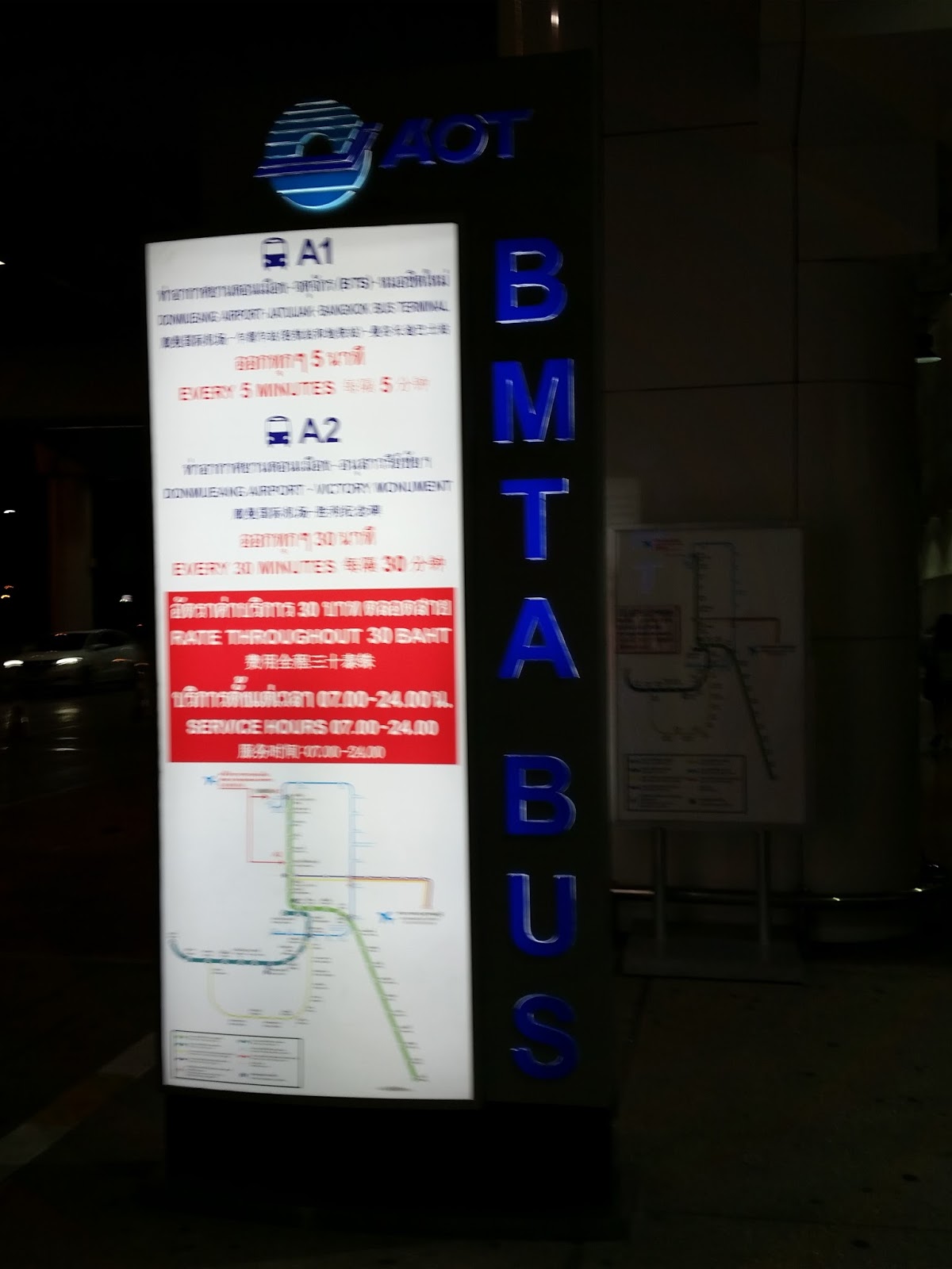 Seguindo a dica de uma amiga tailandesa, que conheci no Laos, saí no portão 6 do desembarque e peguei o serviço “BMTA BUS“, mais precisamente a linha de ônibus A1, que passa a cada 5 minutos. Custa 30 baht. Pedi à cobradora para me avisar quando estivéssemos chegando na estação “Mo Chit” – última estação do BTS. Desceria em Asok e a passagem custou 42 baht. Meu hotel ficava a 200 metros da estação (gastei 7 reais do aeroporto ao hotel!). Se a pessoa quiser descer perto de uma estação de metrô, sugiro descer em Asok, pois tem uma passarela para a estação Sukhumvit de metrô.