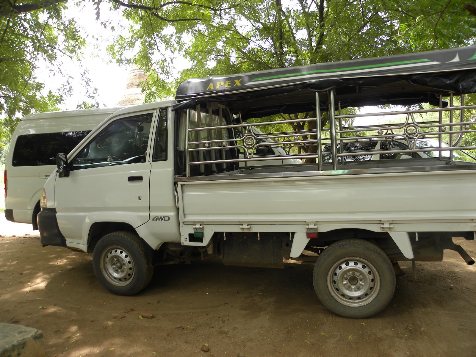 A estrada é péssima e estava chovendo, portanto, o percurso durou 6 horas, quando o comum é chegar em 4. Nunca sofri tanto, mas passou. A van vai parando e deixando as pessoas. Parou na rodoviária e depois só ficaram os 3 turistas. Seguimos até o escritório da Ok Express em Bagan. O chinês foi perguntar se não nos levariam até os hotéis (eles buscam e deixam nos hotéis). O motorista disse para o casal “Vocês vão de táxi. 10 mil kyats”. Já estava revoltada e perguntei “E eu”. Ele mandou esperar. Veio um transporte típico do país: um caminhonete que aqui é conhecida por “pau-de-arara”. Perguntei quanto era e disse que não custaria nada. Os locais me ajudaram com a mala. Estava absolutamente escuro, já que Bagan não tem iluminação pública. Minha condição física e psicológica não era das melhores.