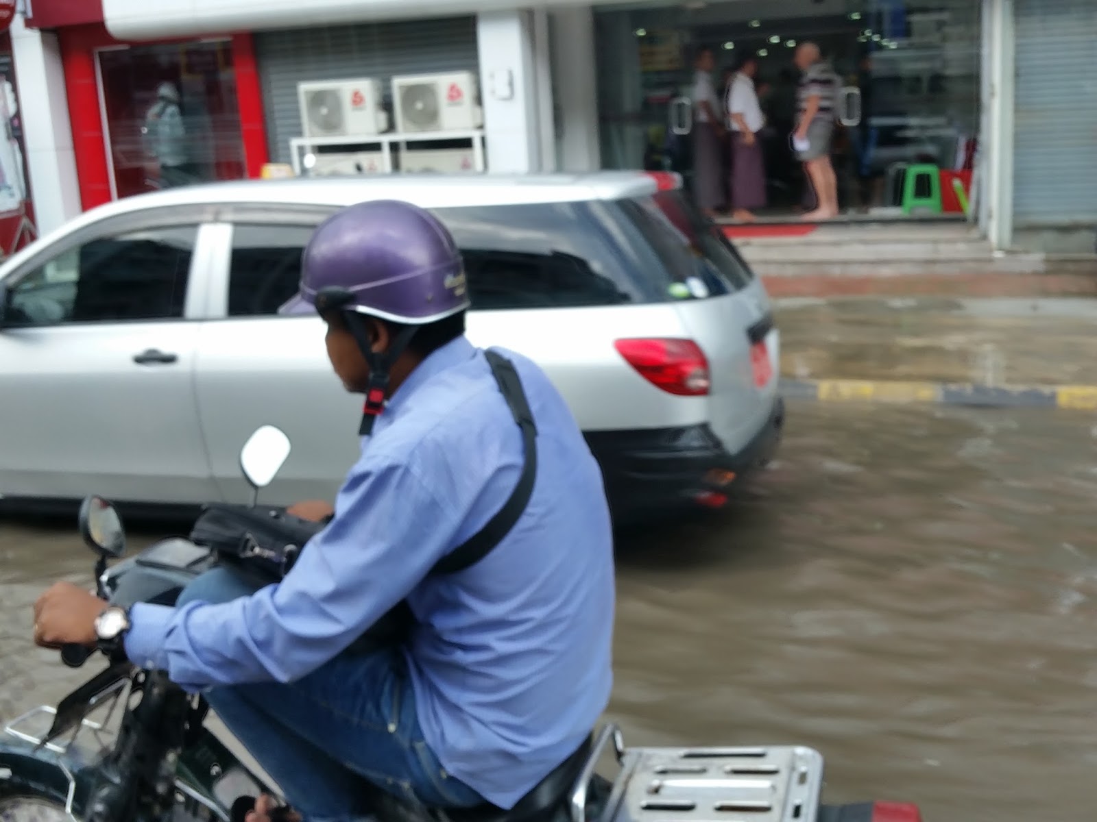 O aeroporto de Mandalay fica a 35 km da cidade, ou seja, distante da cidade. O percurso levou cerca de 1 hora e choveu torrencialmente. As ruas estavam alagadas. Assim que chegou no centro senti um choque cultural. Fui a primeira pessoa a ser deixada. Ajudaram-me a pegar a mala e pulei sobre o rio que se formava.
