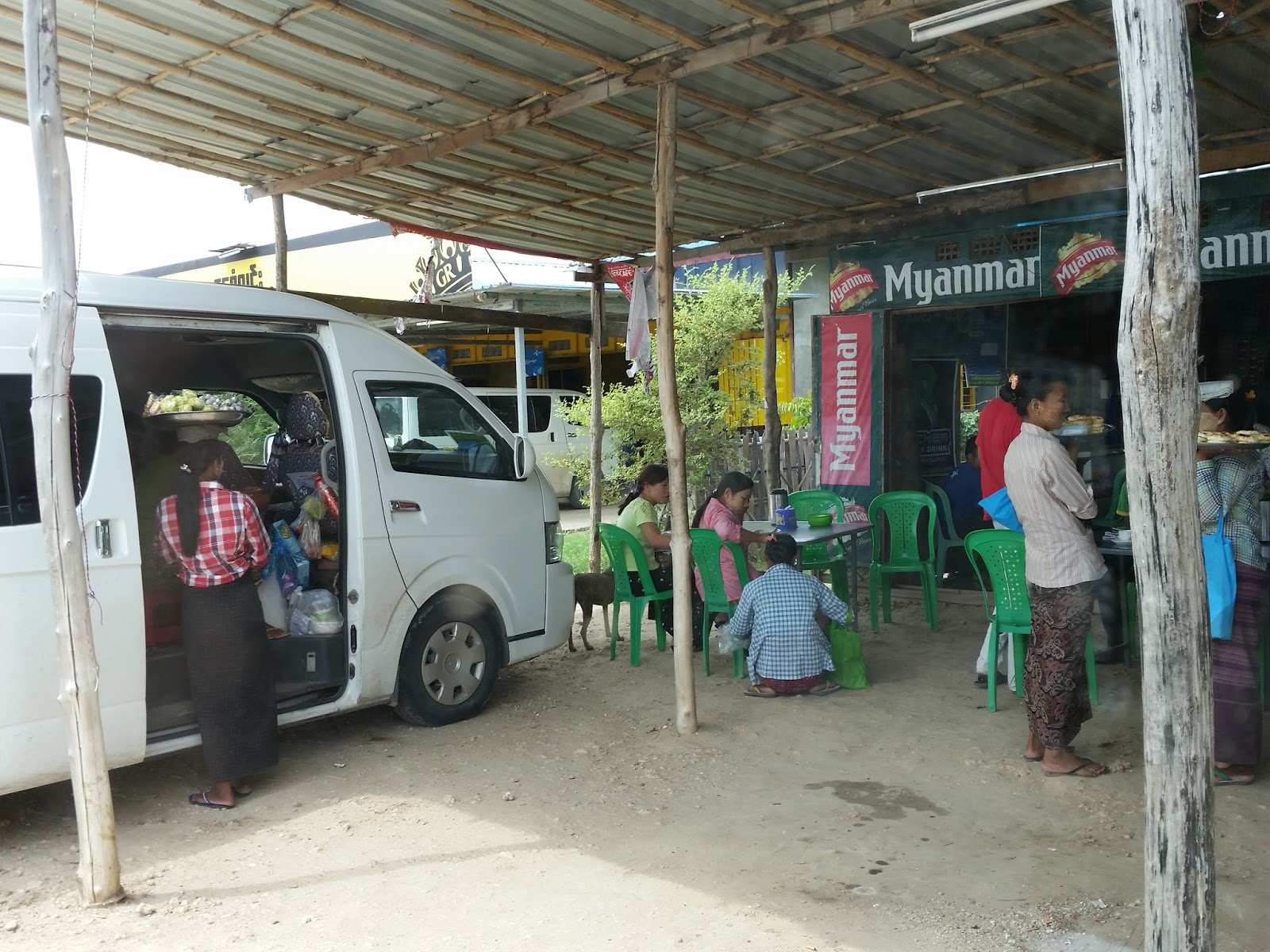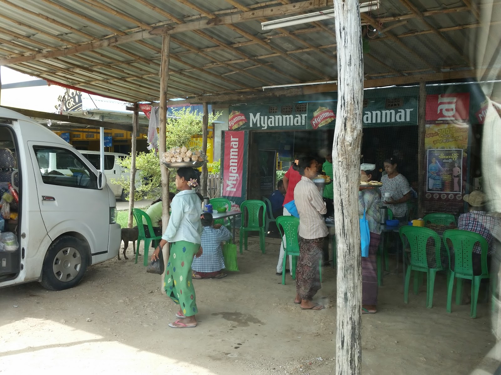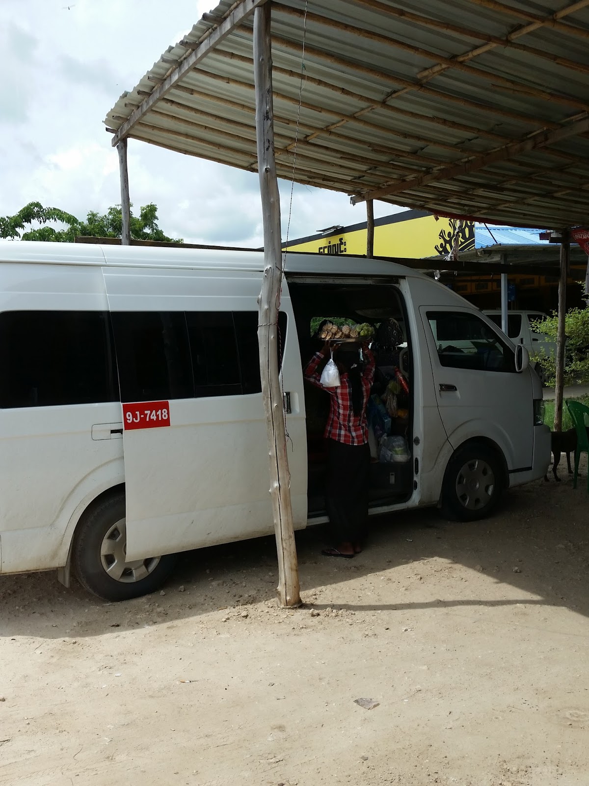 A van chegou e só tinha pessoas locais aguardando. Além de mim, vi que tinha um casal de turistas chineses no interior do automóvel. O assento 16 era individual, mas sem lugar pra colocar as pernas, pois fica sobre a roda. A viagem foi surreal. Um homem que estava atrás de mim pegou um saco de plástico preto e começou a cuspir e vomitar por todo o caminho, queria pensar que era folha de betel com noz de areca (costume dos homens daquele país), mas fiquei tensa e cogitei que poderia ser tuberculose. Não tive sossego e não queria respirar. Suava sem sentir calor.