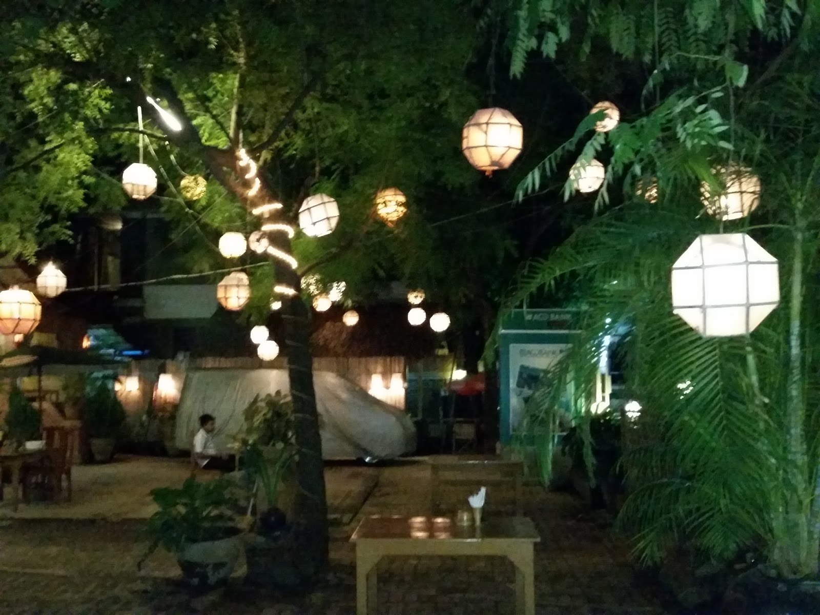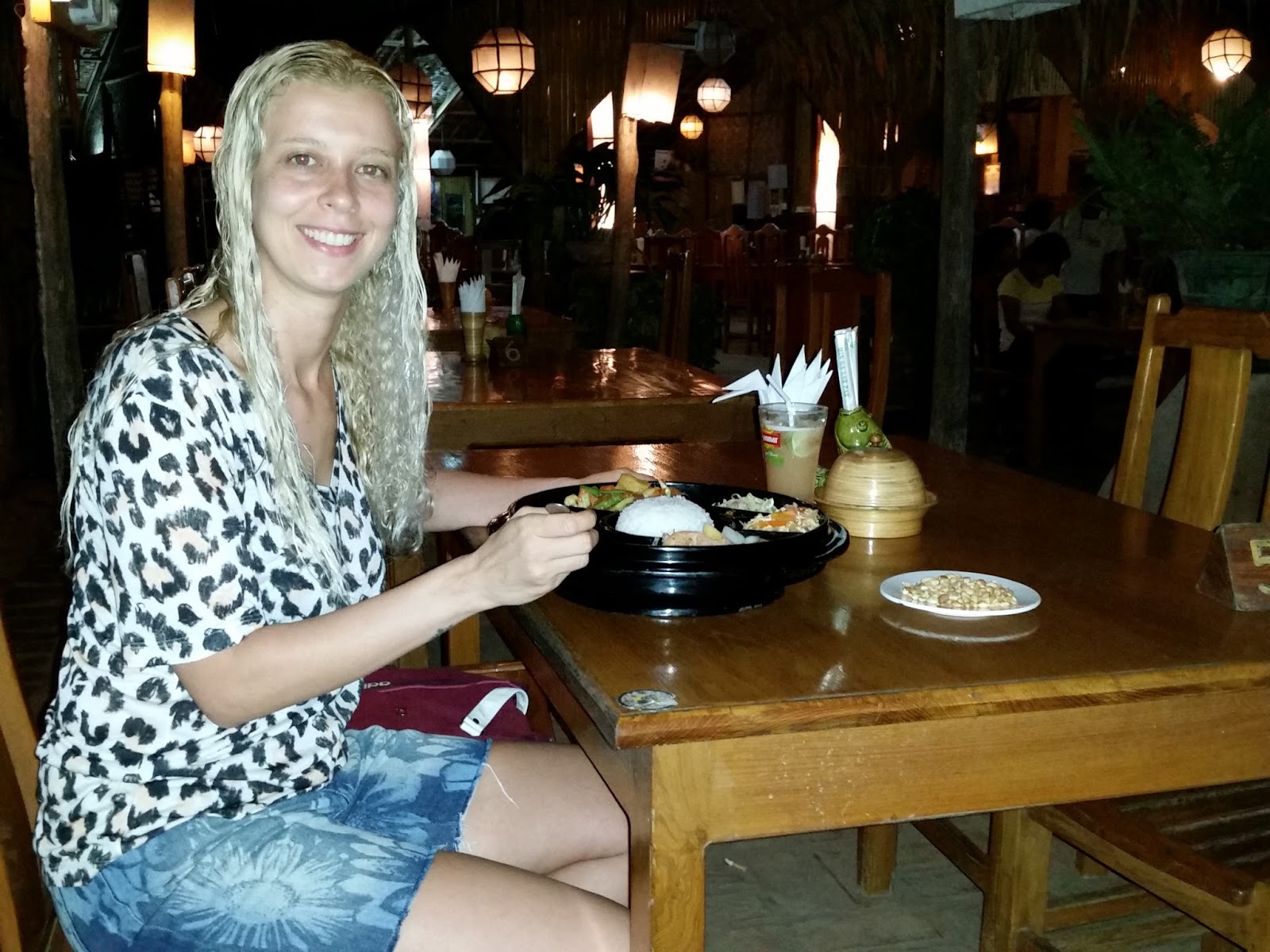 Me trouxeram amendoins (é um petisco da região) e rapidamente a comida foi entregue. O curry era gostoso. O arroz estava quente. Tinha tomate com amendoim, vegetais bastante apimentados, uma verdura com cebola. Um turista sentou na mesa ao lado e pedi para tirar uma foto minha. Depois ele perguntou o que achei do curry. Começamos a conversar. Era um israelense que tem uma empresa de turismo. Levaria um grupo grande para Myanmar no mês seguinte e viajou antes para fechar os passeios e hoteis. Perguntou onde estava hospedada e voltamos juntos. Perguntou se queria conversar perto da piscina e disse que estava cansada. Caminhei para o meu quarto e desabei na cama para me recompor com um sono profundo.