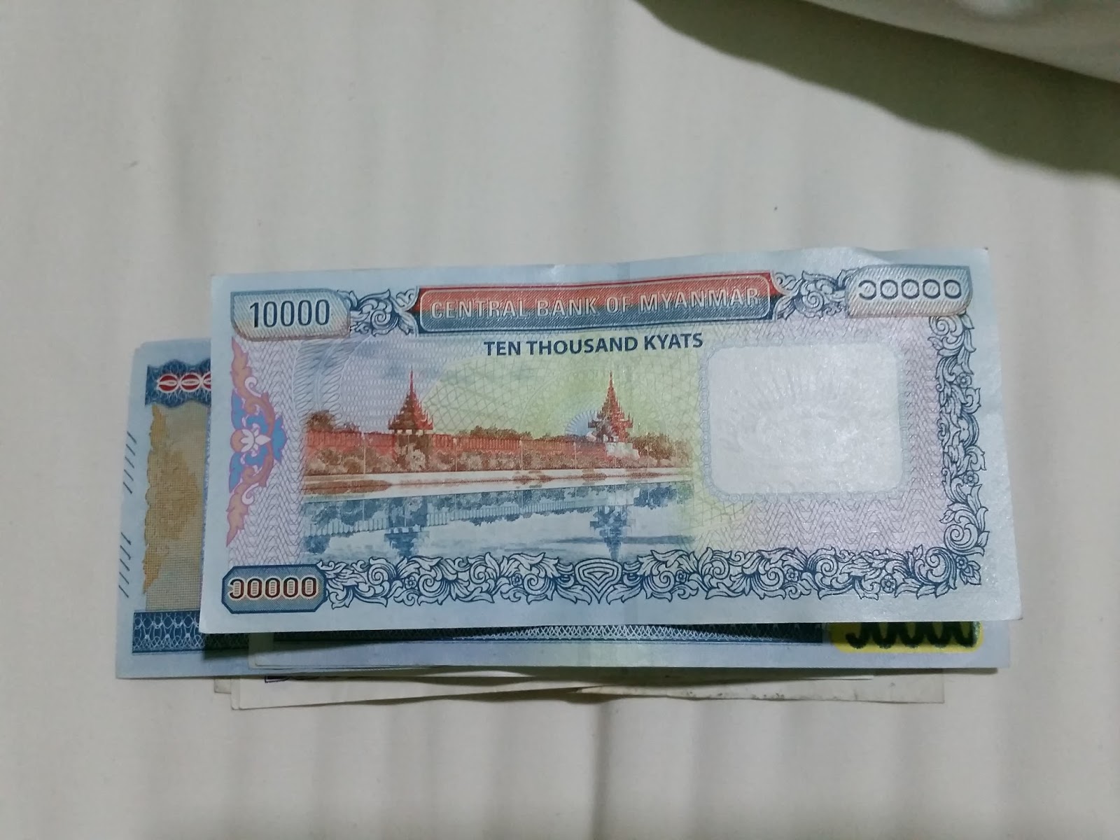 Assim que o avião aterrissou, passei pela imigração, que não fez qualquer pergunta. Apenas mostrei o visto. Tiraram uma fotografia com a webcam e carimbaram o passaporte. Na área para pegar a bagagem tinha uma casa de câmbio. Em tese, pagam menos dentro do aeroporto, mas não queria correr risco de sair sem a moeda local. A conversão ficou 1 dólar = 1.250 kyats. Troquei 100 dólares, que foi o suficiente para 5 dias em Myanmar.