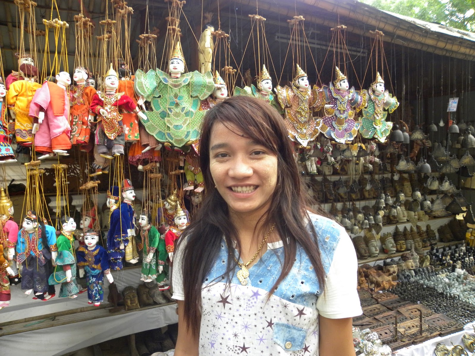 Parei para olhar algumas bonecas e acabei comprando uma para minha mãe e outra para minha sobrinha. Giovana tem bonecas de Bali, Camboja, Hungria, Tailândia, etc. Os preços não são tão atraentes como na vizinha Tailândia, mas negociei duas bonecas por 7.000 kyats (6,50 dólares), afinal eram feitas de madeira e tecido. Deve dar trabalho para confeccioná-las. No Brasil jamais encontraria algo pelo mesmo valor.