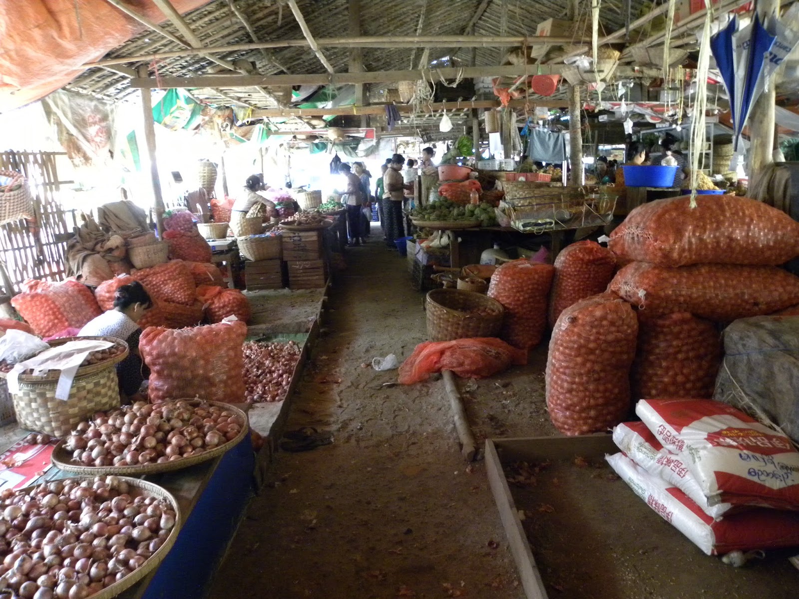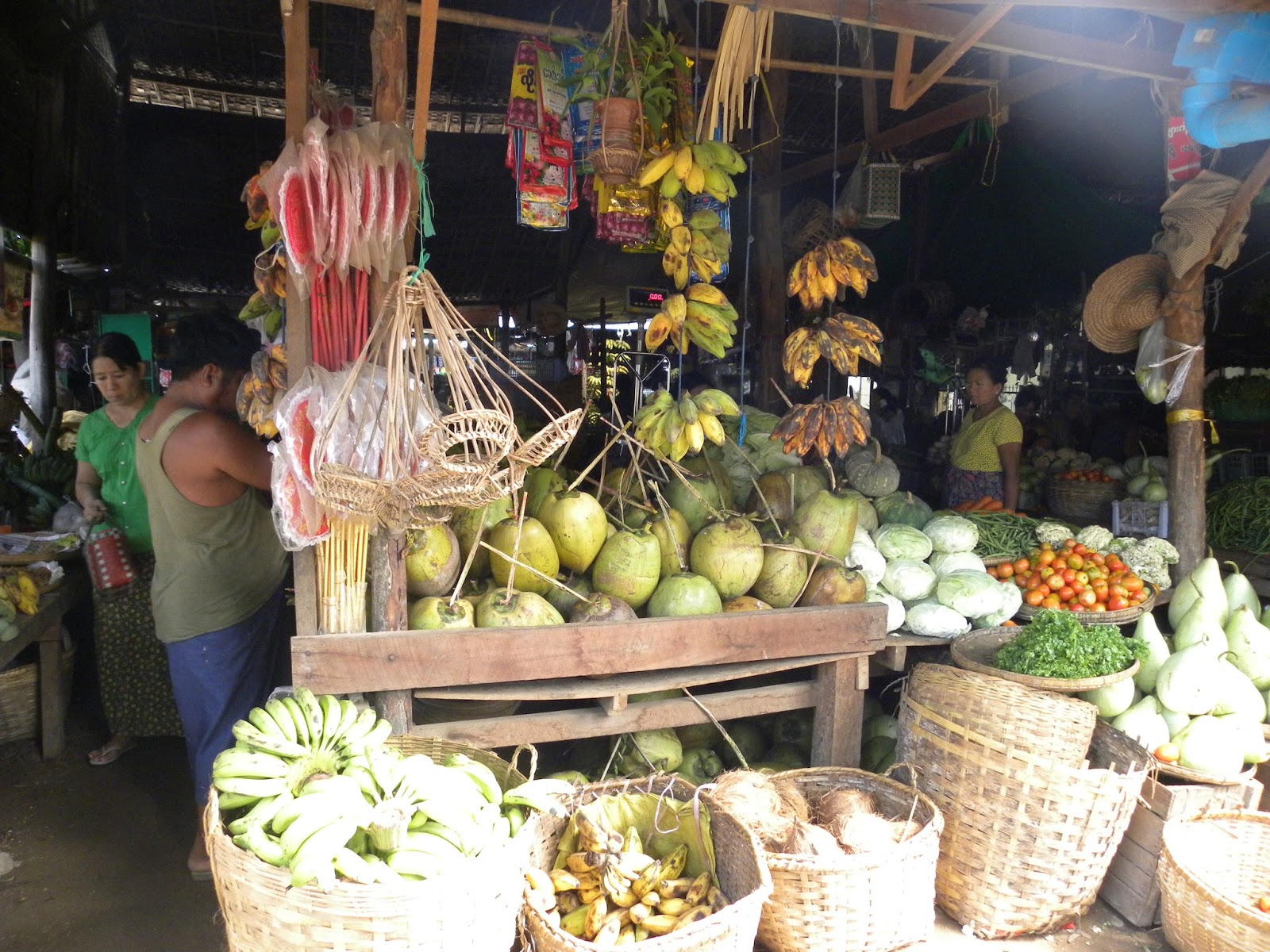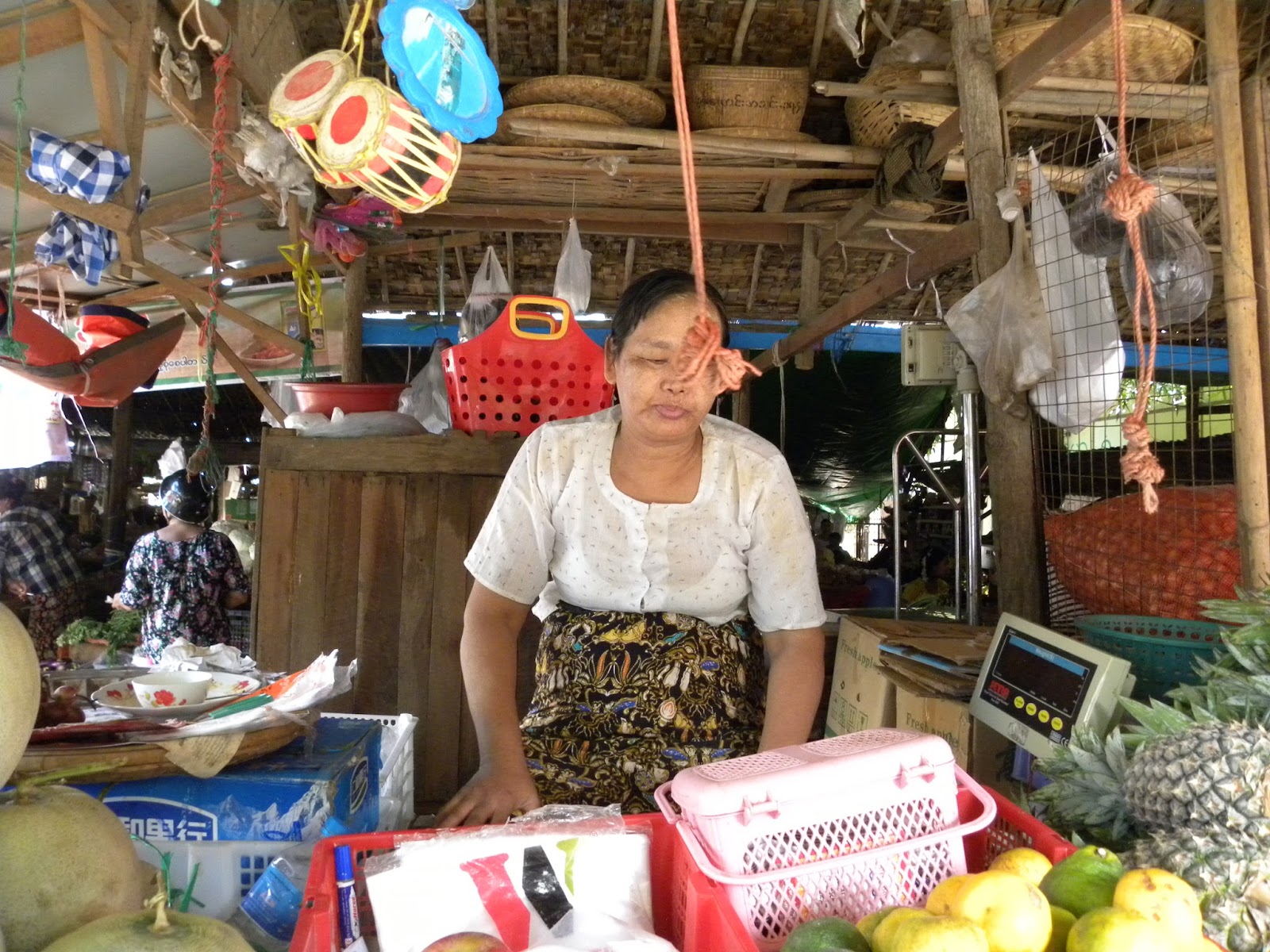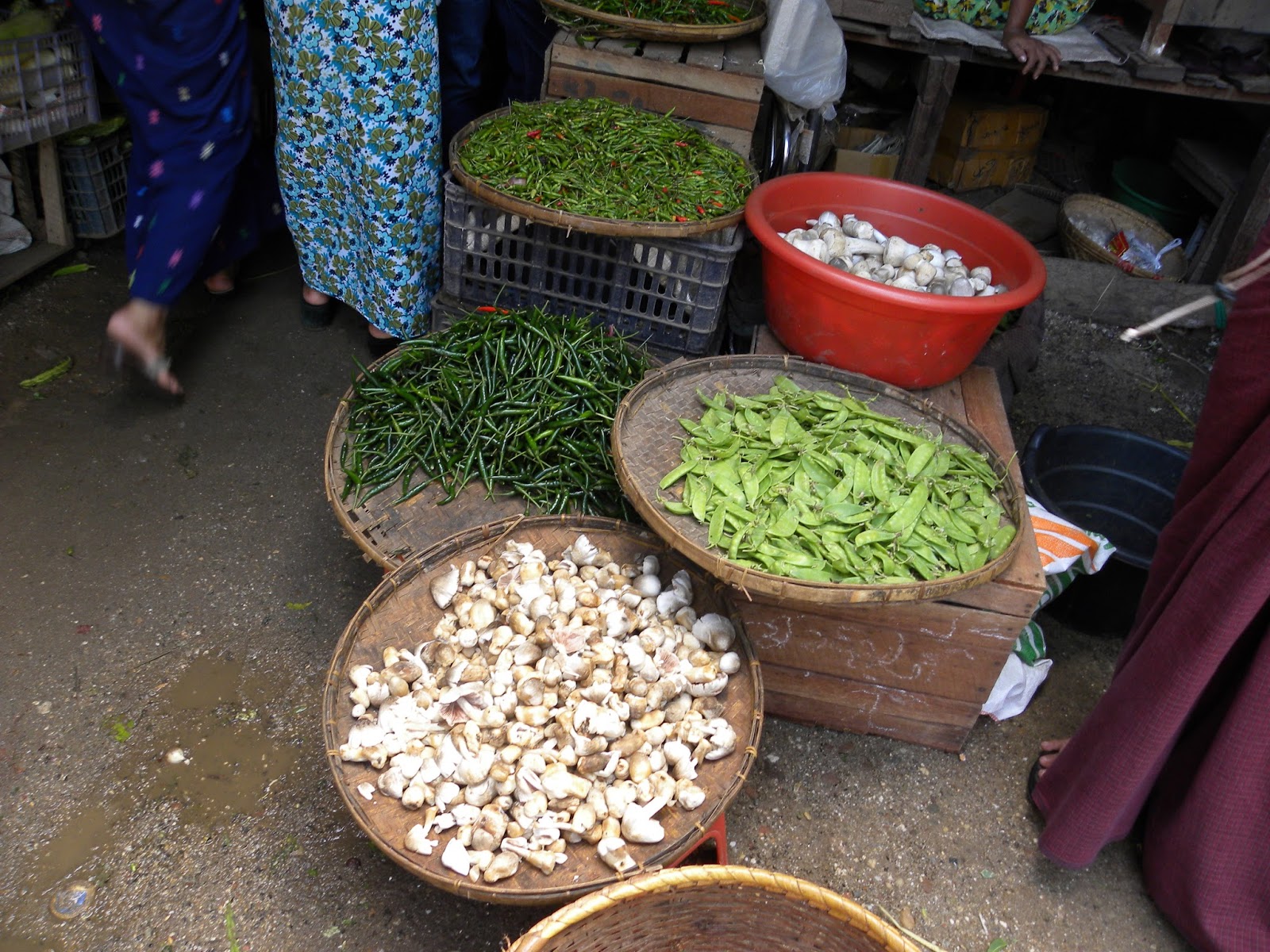 Tinha chovido de manhã e o chão do mercado continha muita lama. Os chineses do tour fotográfico estavam por lá com sacos plásticos até os joelhos. Parei para conversar com o guia deles – um rapaz muito simpático. Entrei na feira, que vende legumes, frutas, carnes, ovos. Não quis ligar o flash e as fotos ficaram escuras, pois o ambiente é coberto. No fim, comprei algumas frutas-de-conde, mas acho que a senhora me cobrou caro, 5 frutas por 1 mil kyats (menos de 1 dólar).