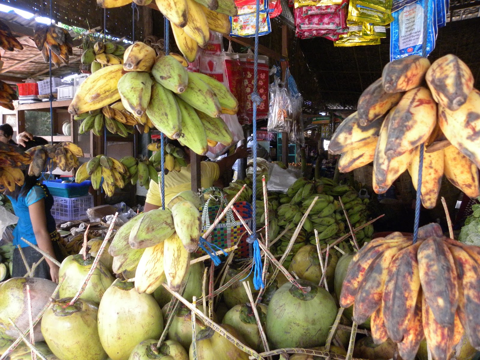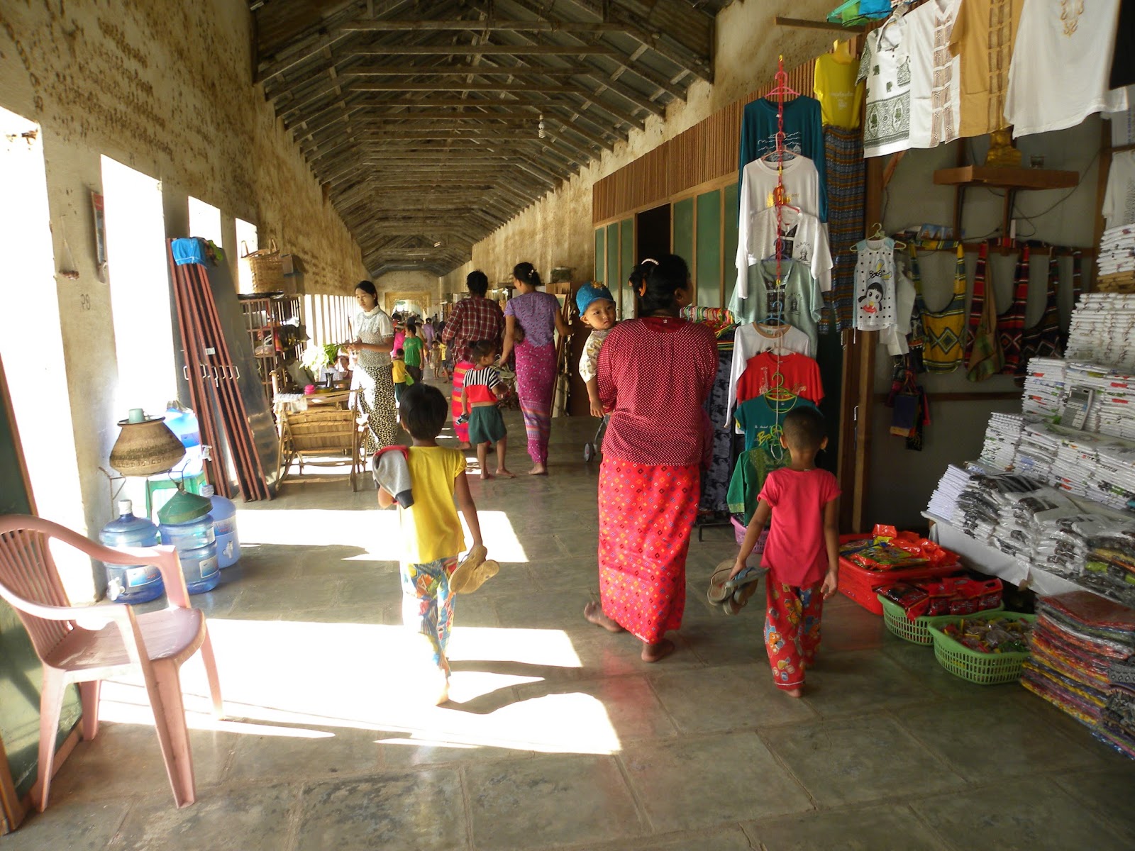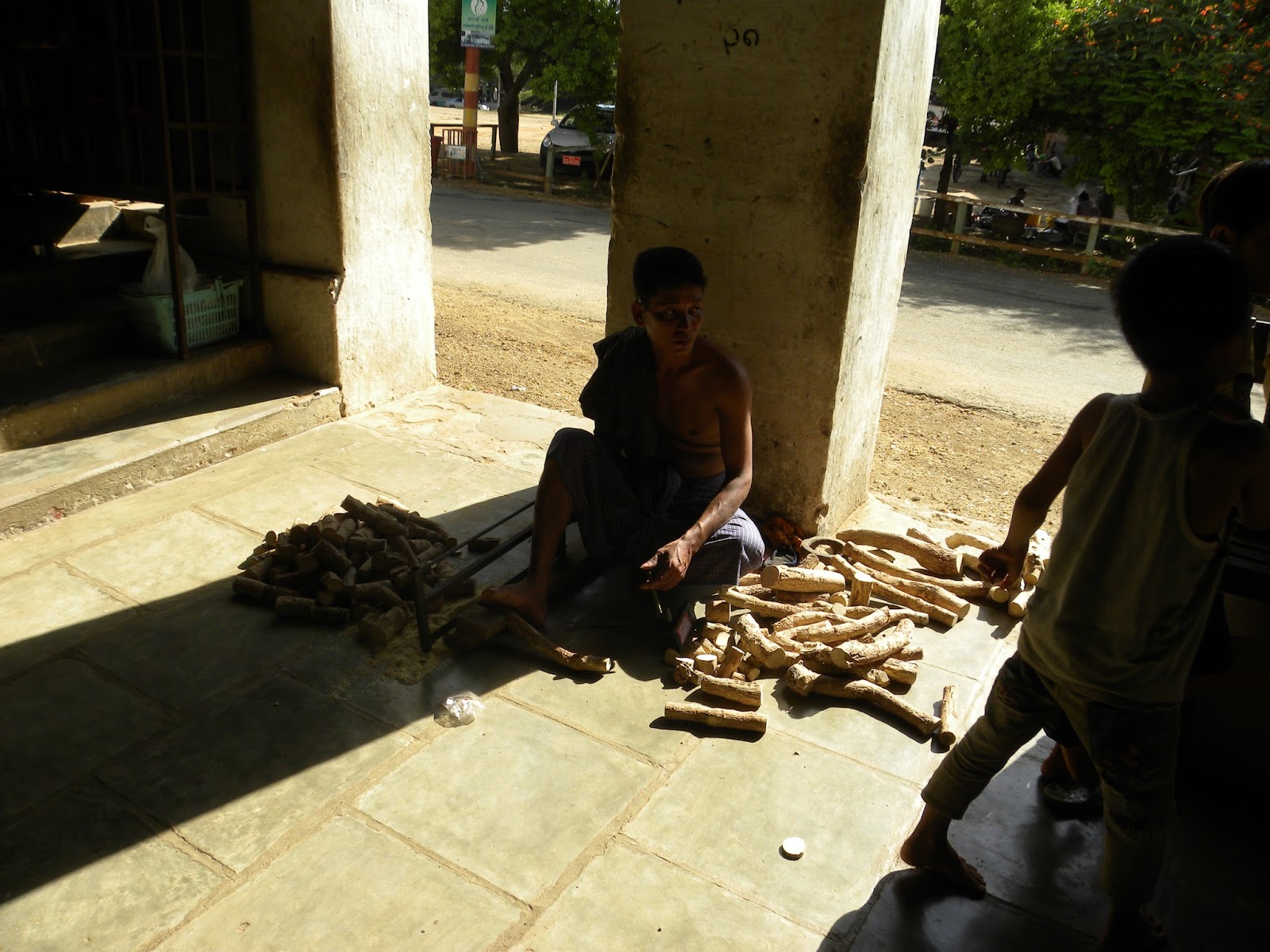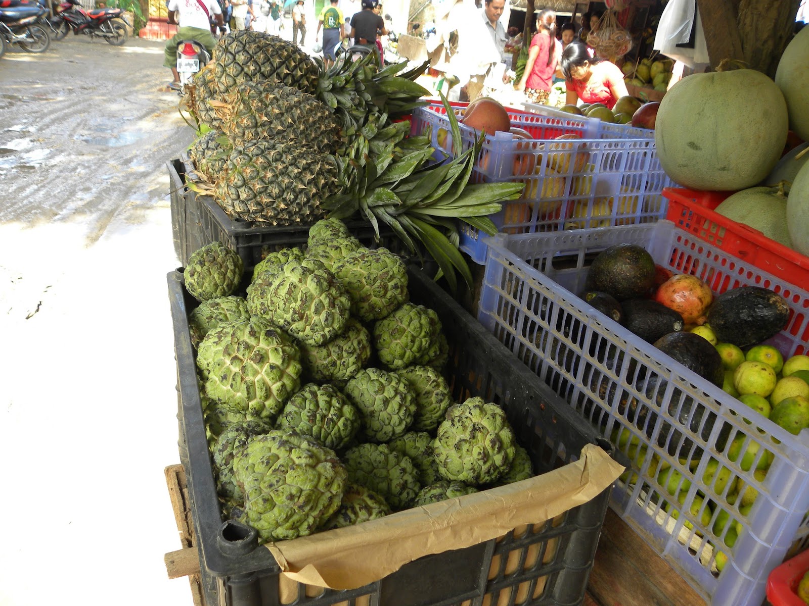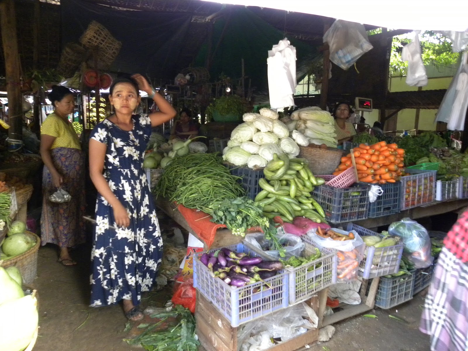 Tinha chovido de manhã e o chão do mercado continha muita lama. Os chineses do tour fotográfico estavam por lá com sacos plásticos até os joelhos. Parei para conversar com o guia deles – um rapaz muito simpático. Entrei na feira, que vende legumes, frutas, carnes, ovos. Não quis ligar o flash e as fotos ficaram escuras, pois o ambiente é coberto. No fim, comprei algumas frutas-de-conde, mas acho que a senhora me cobrou caro, 5 frutas por 1 mil kyats (menos de 1 dólar).