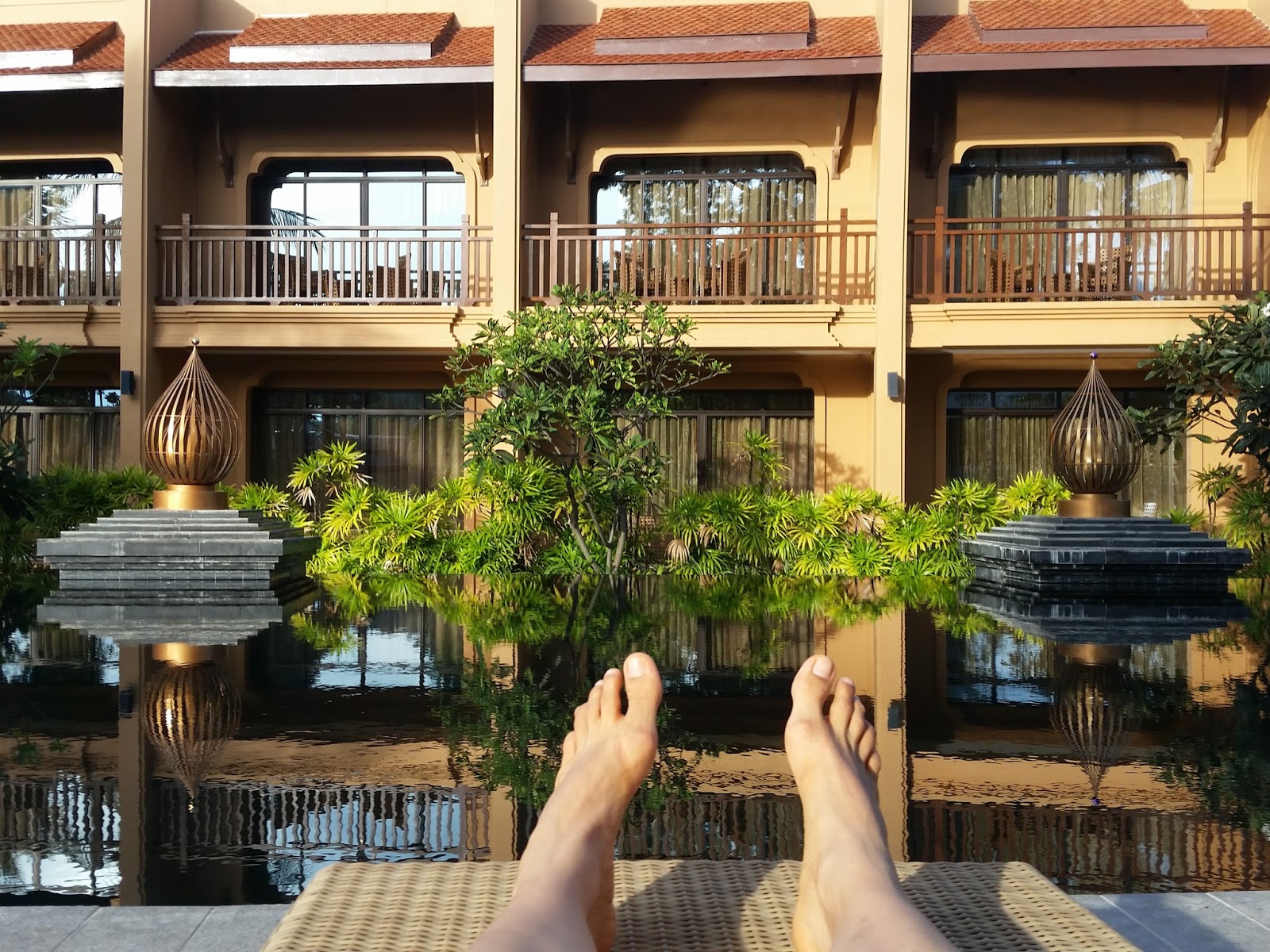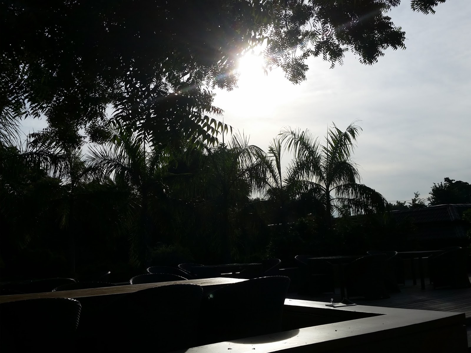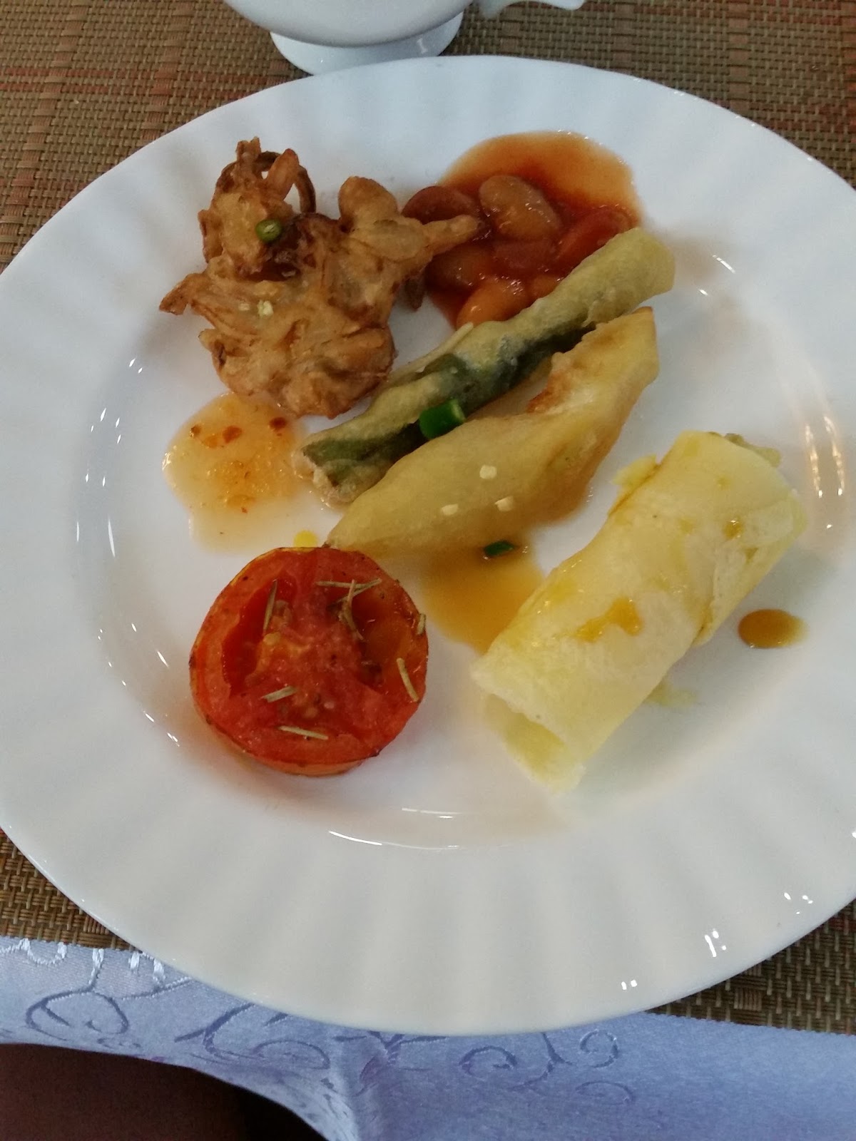 O café da manhã começava a ser servido às 6h. Por volta das 6:30h estava caminhando pelo salão, selecionando o que comeria. Decidi experimentar a culinária oriental no café da manhã, embora adore pães, frutas e café. Um pouco receosa, escolhi tomates assados com alecrim, feijão, tempurá de legumes, e, para meu espanto, tudo estava delicioso.