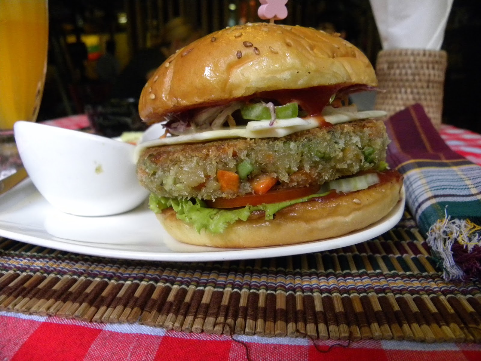 Optei pelo delicioso veg burguer com um suco de laranjas (5 mil kyats). Descansei e retornei para o hotel, mas fui parando em alguns templos pelo caminho. Não entreguei a e-bike de imediato, mas depois concluí que naquele dia já estava sem disposição para explorar a cidade e preferi descansar no hotel.