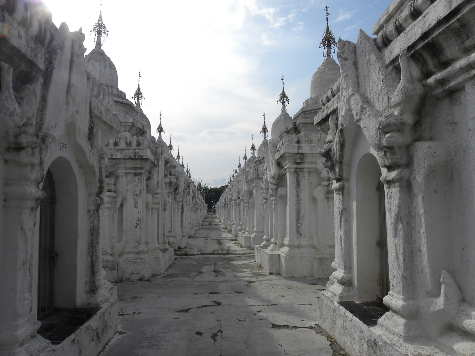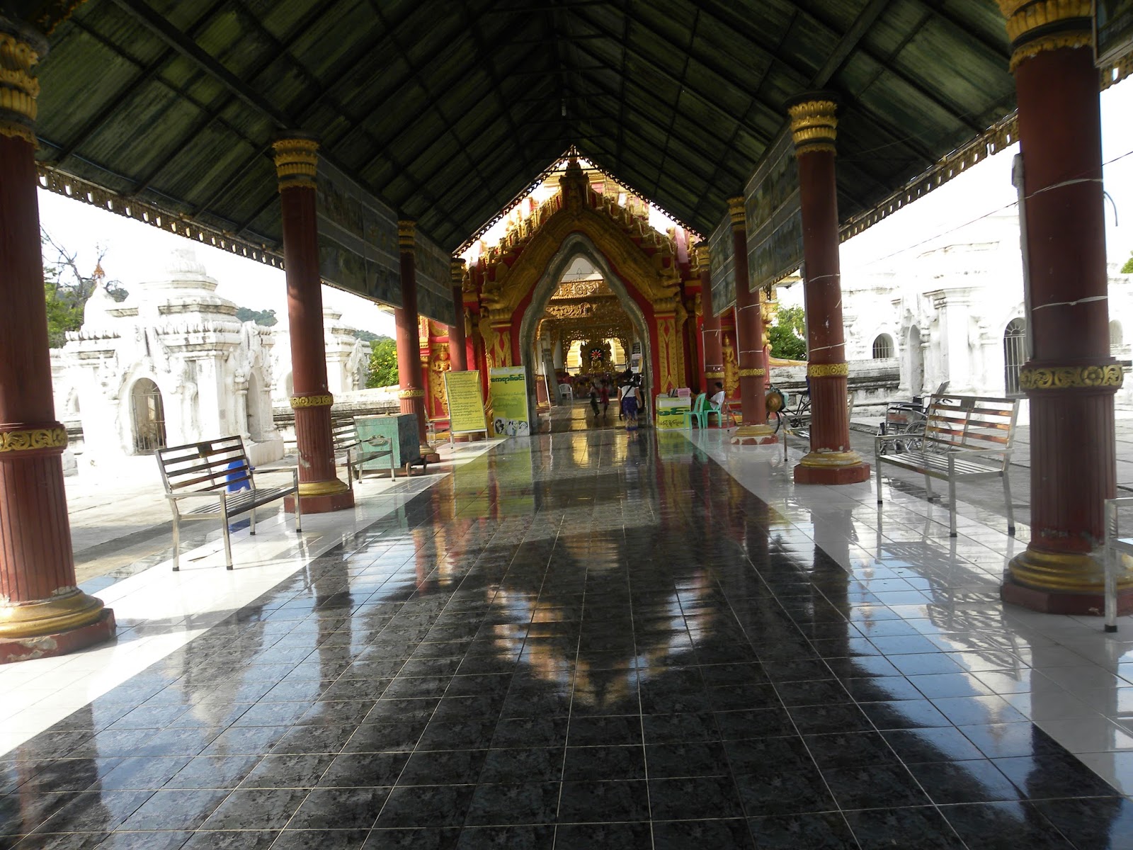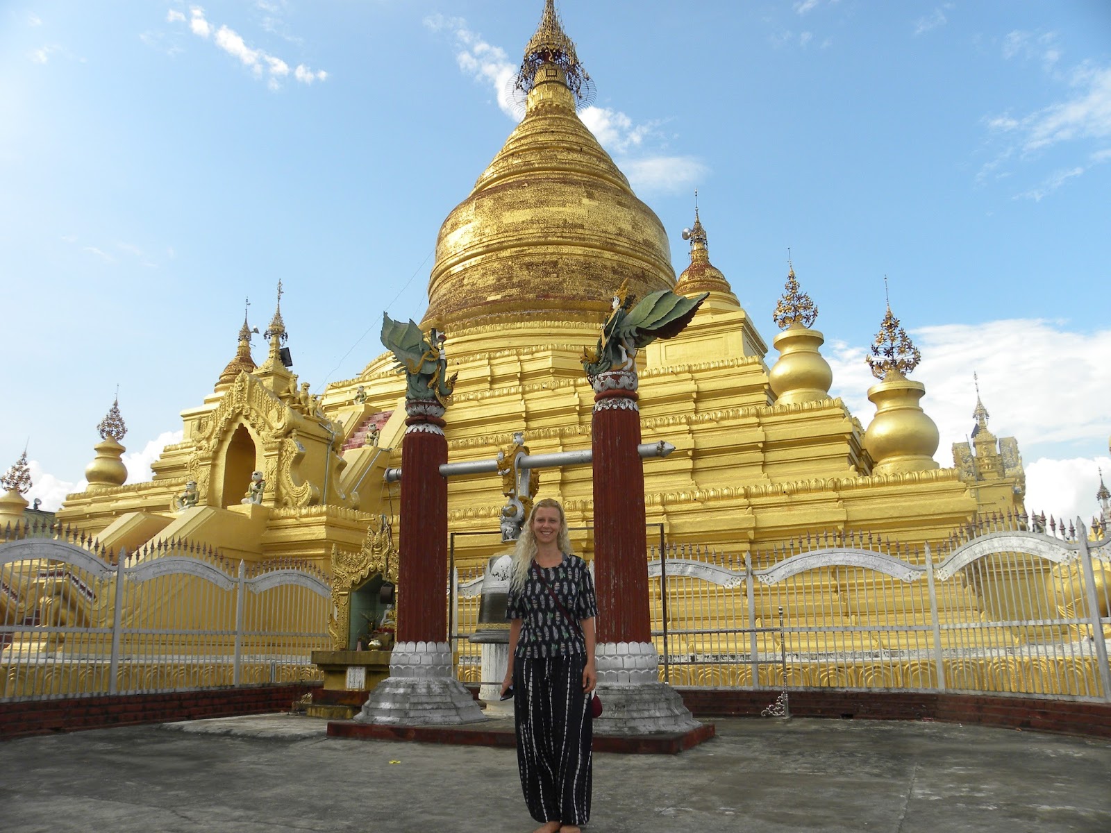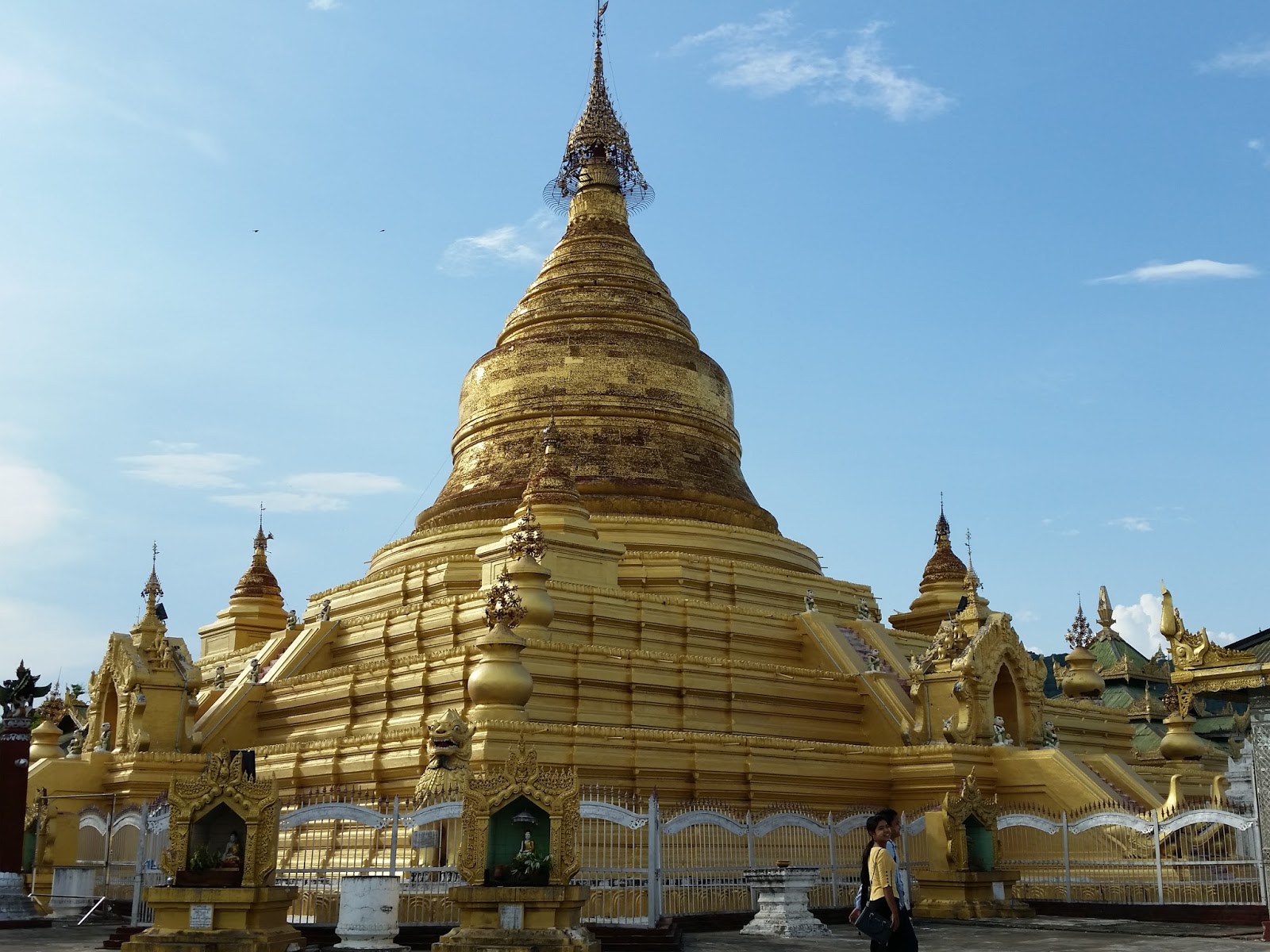 A Kuthodaw Pagoda é uma estupa que contém o maior livro do mundo e fica situada a 274 metros de Mandalay Hill. Tem cerca de 57 metros de altura e foi realizada no mesmo estilo da Shwezigon Pagoda, que fica em Bagan. O lugar estava vazio, mas encontrei um casal de turistas que tirou uma foto para mim.