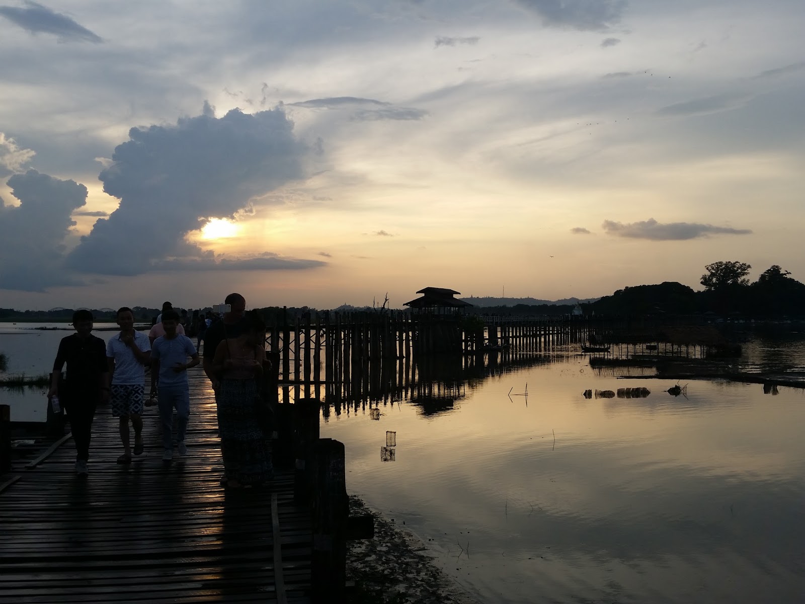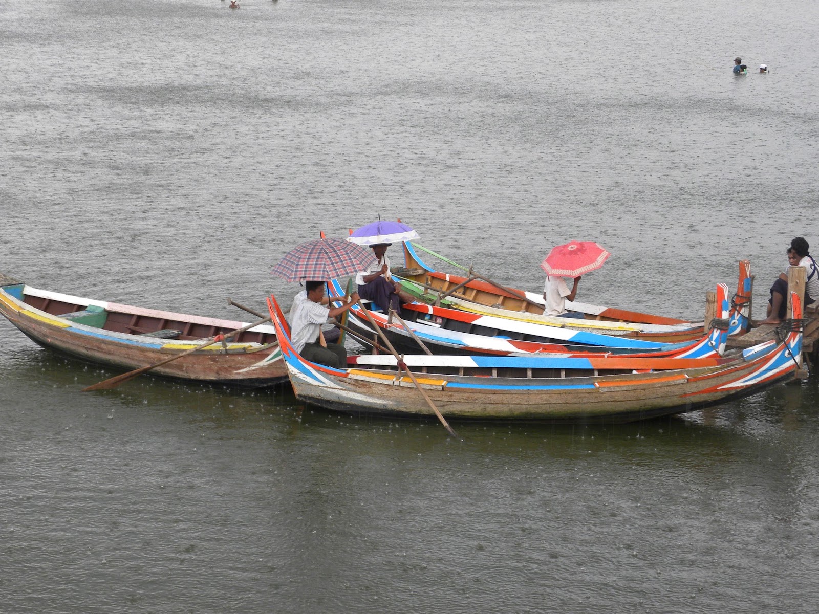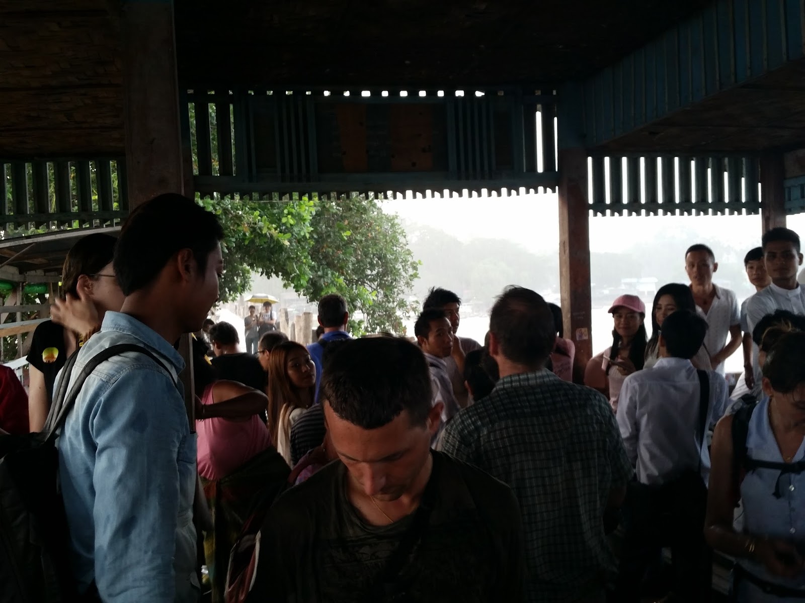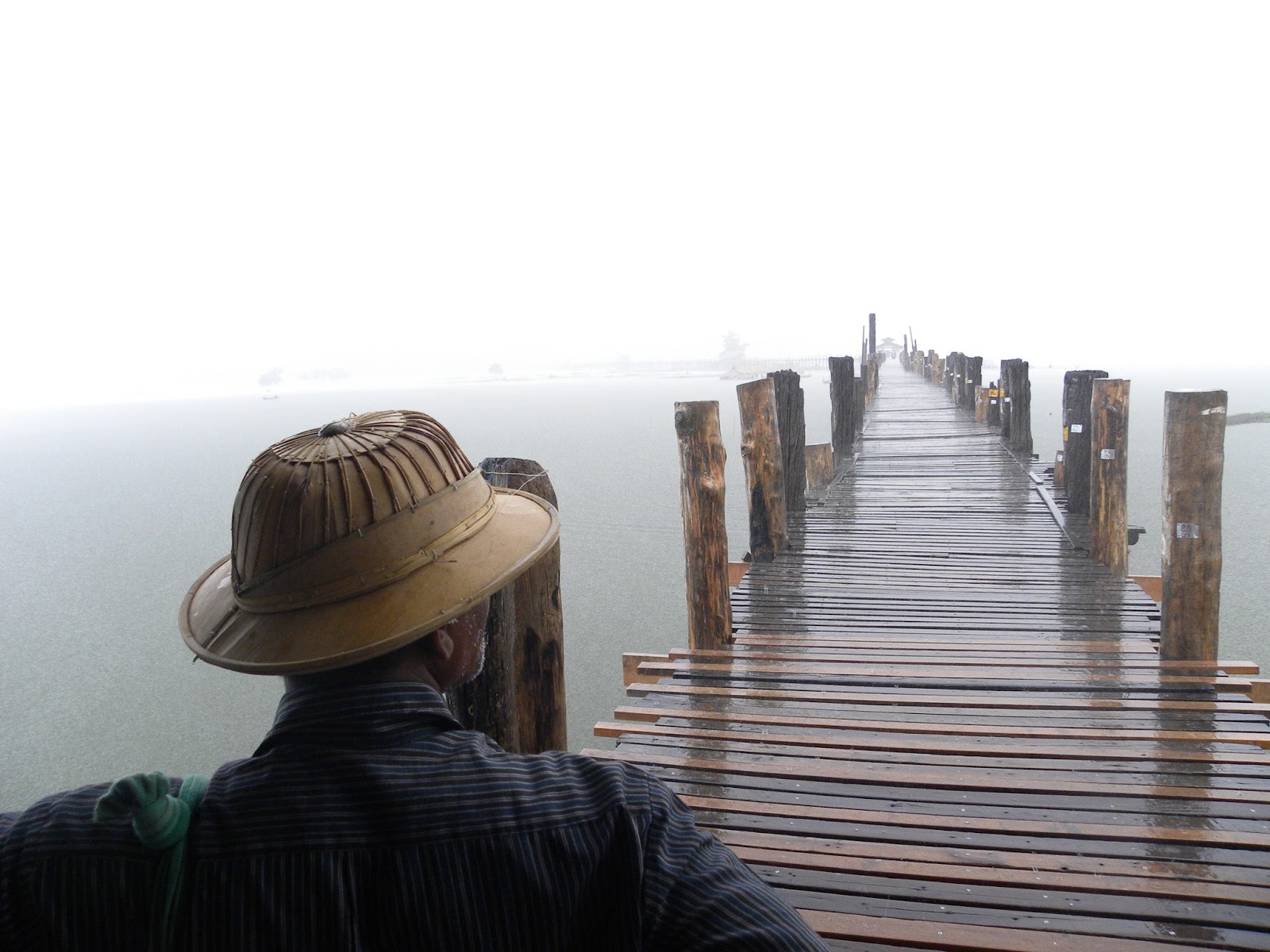 De repente, a chuva começou a cair com intensidade e fui obrigada a correr até um dos abrigos sobre a ponte. Muitas pessoas estavam aglomeradas, aguardando a estiagem. Os turistas eram em grande maioria orientais, além dos próprios birmaneses.
