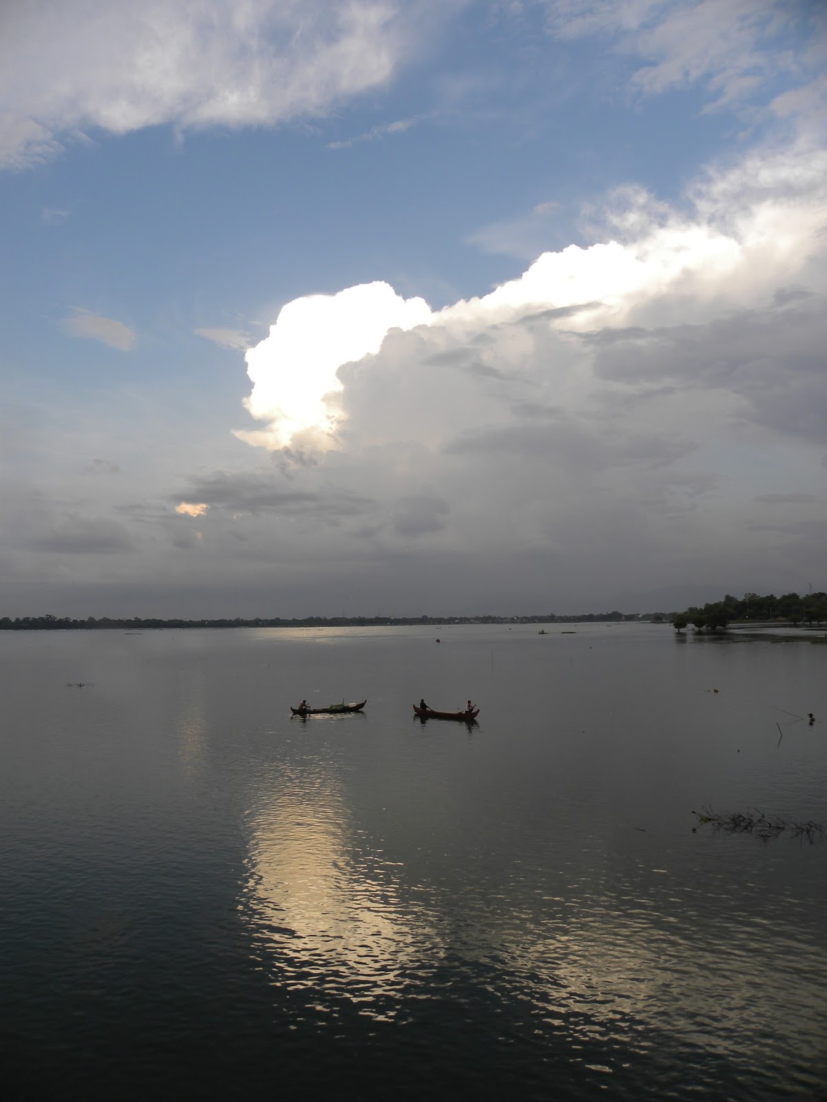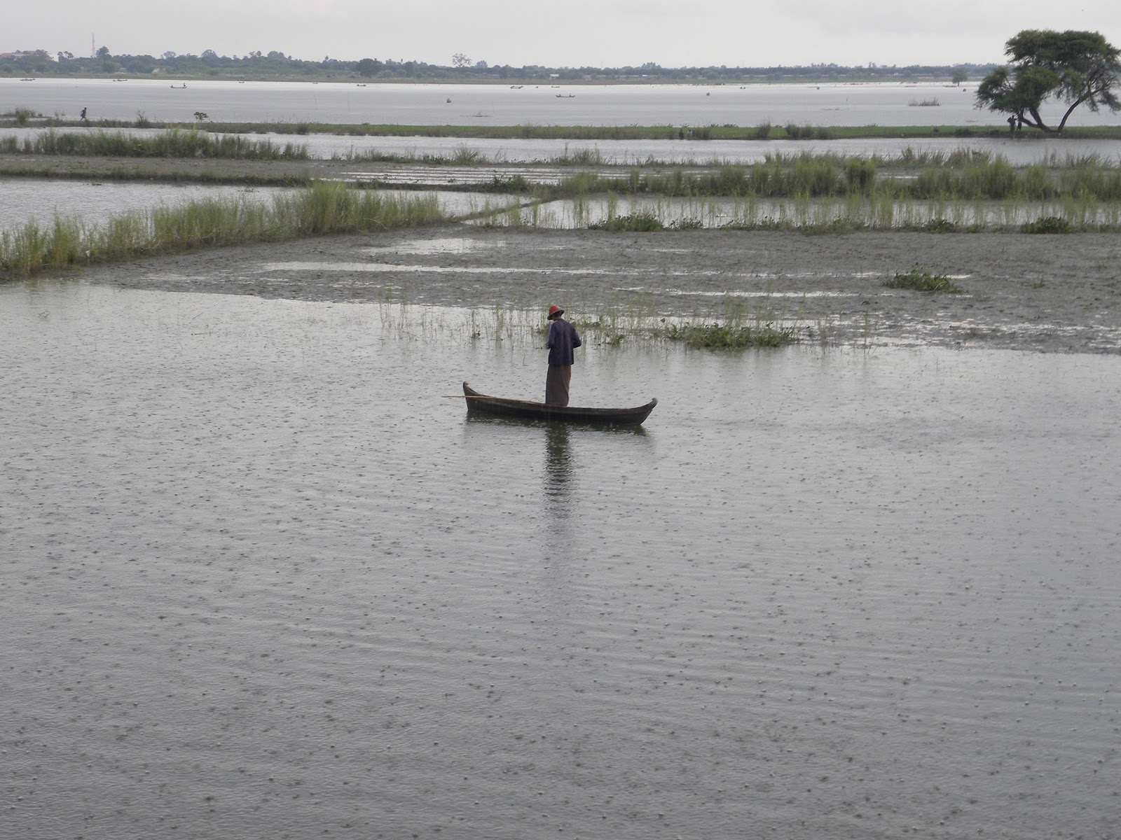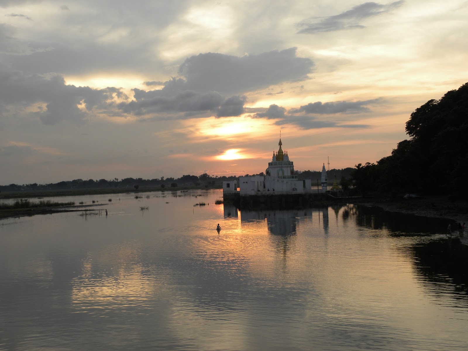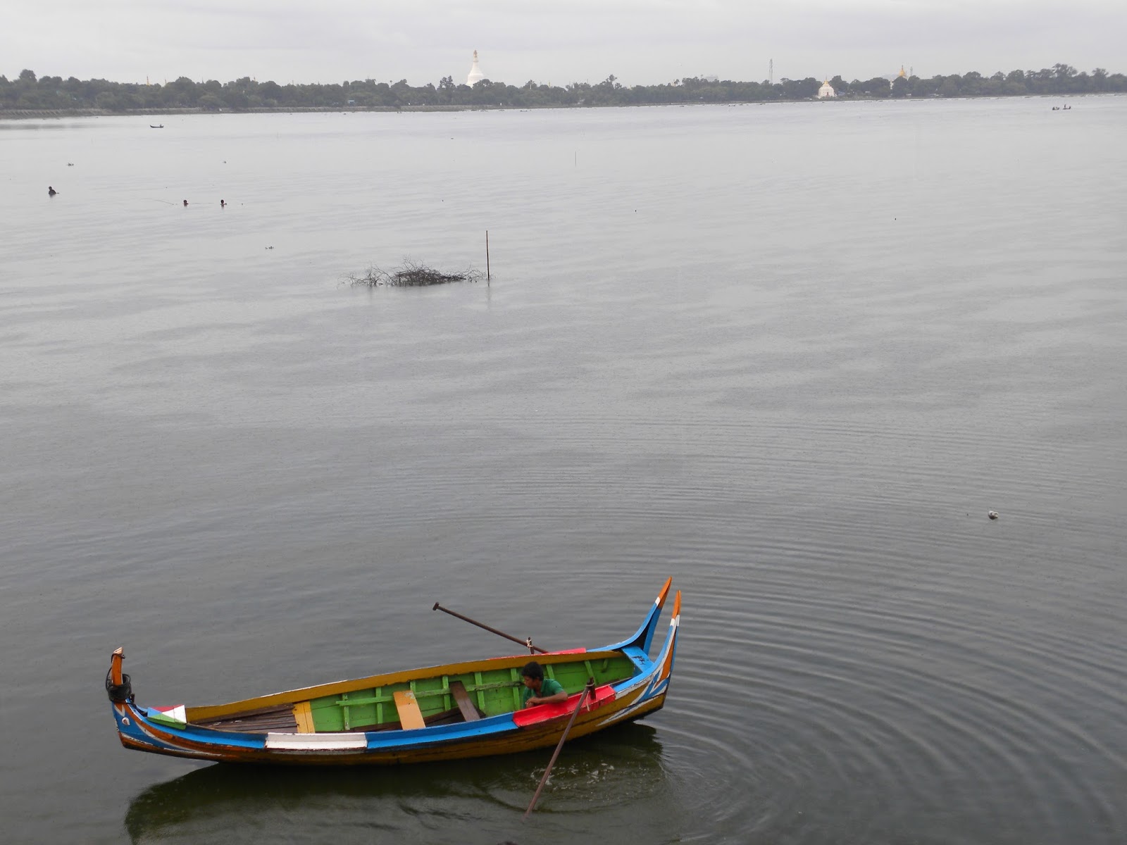 De repente, a chuva começou a cair com intensidade e fui obrigada a correr até um dos abrigos sobre a ponte. Muitas pessoas estavam aglomeradas, aguardando a estiagem. Os turistas eram em grande maioria orientais, além dos próprios birmaneses.
