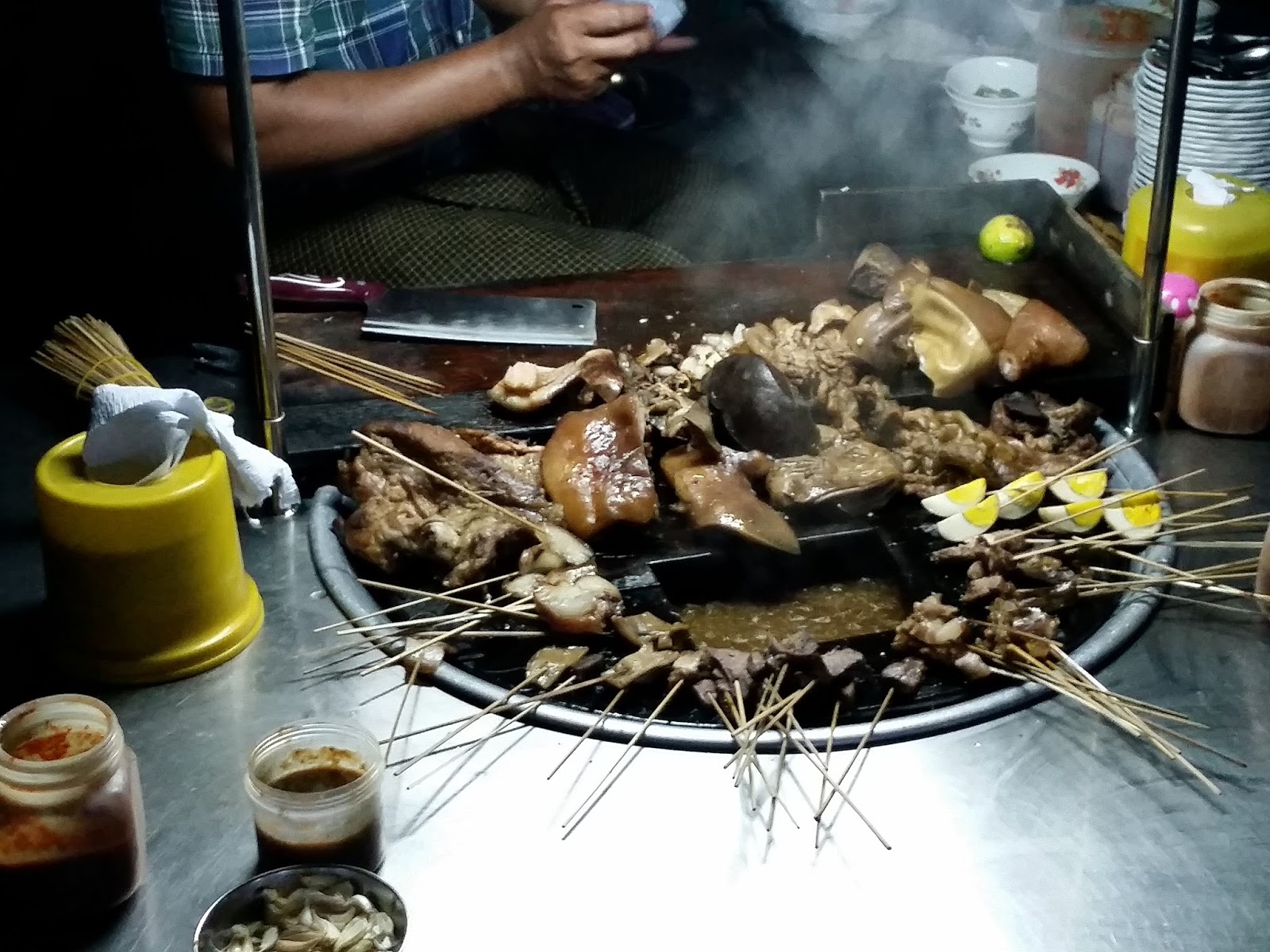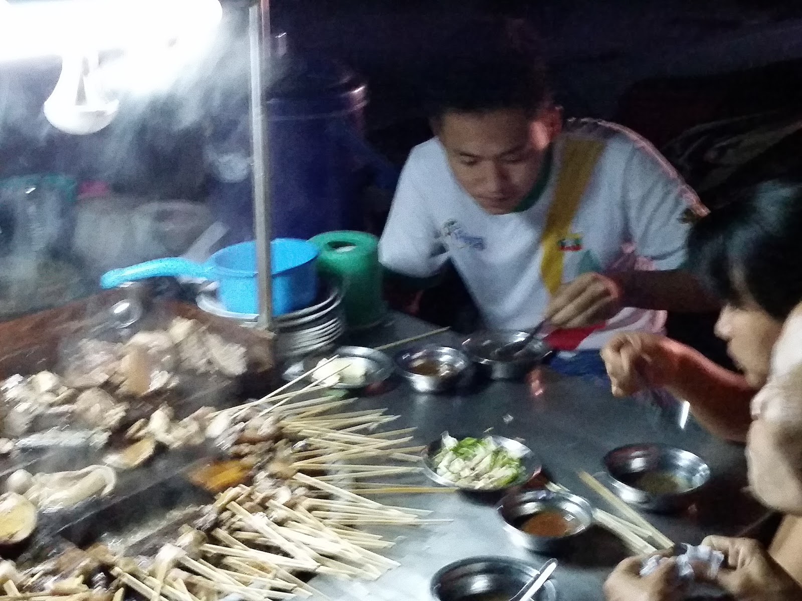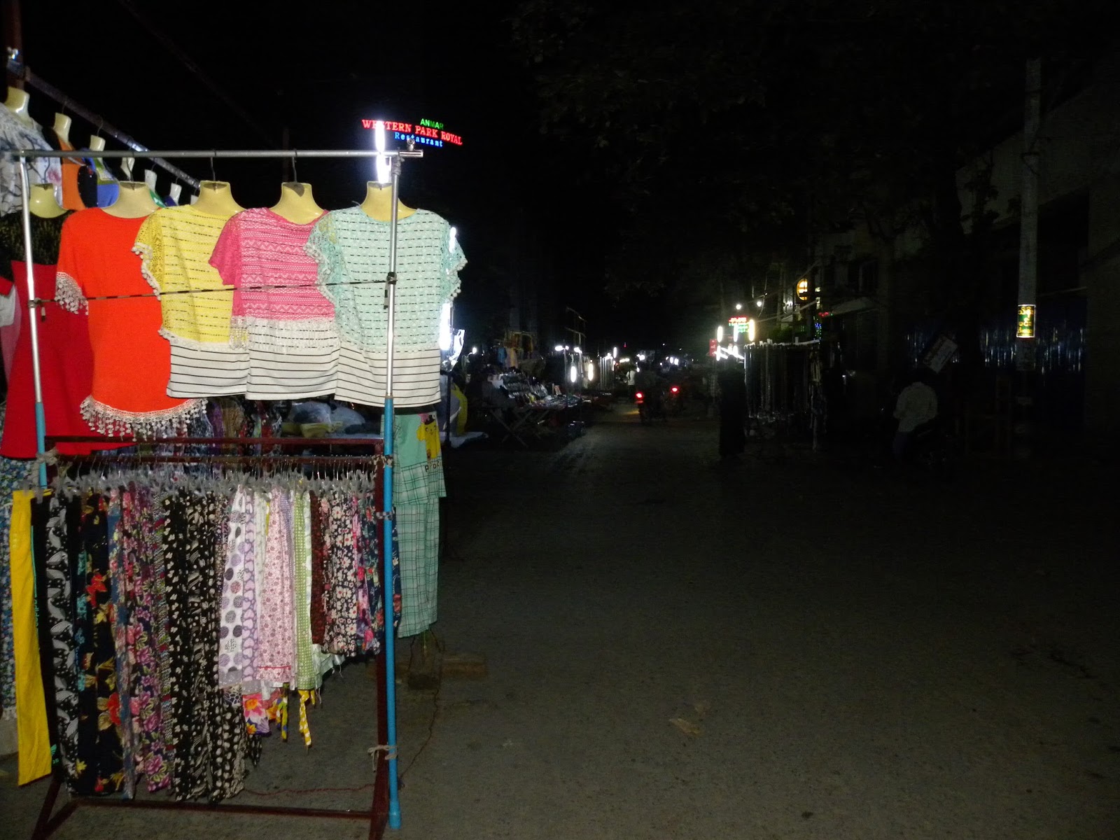 Falou para virar no próximo quarteirão e depois andar mais quatro ao lado direito. Isso já devia ser umas 20h. Mandalay também não tem iluminação pública. As lojas são iluminadas, mas andei boa parte no breu, pois o comércio estava fechando. Aparentemente é bem seguro. O mercado noturno era uma feirinha, mas muito aquém das que já visitei no Sudeste Asiático. Muitas roupas e calçados simples. Rogava por uma fruta. Já estive na Tailândia por duas vezes e sento na rua para apreciar os pratos, mas foi impossível em Myanmar. Parece comum comerem um porco inteiro que é fatiado e regado com um molho, acompanhado por ovos. Todos sentam próximo da barraca. O cheiro era insuportável.