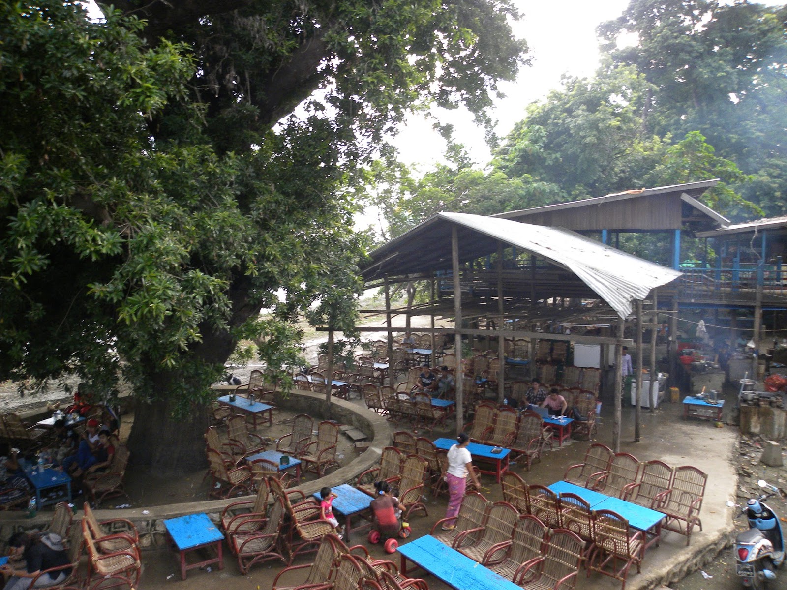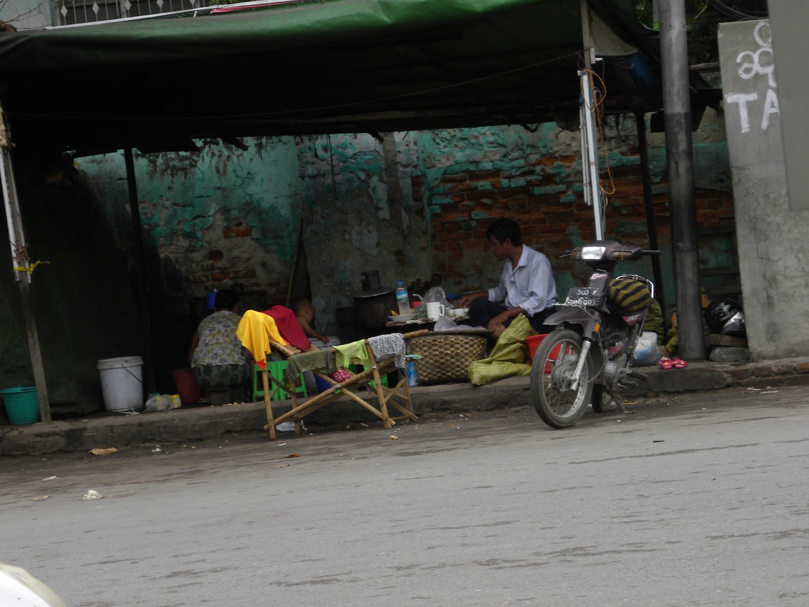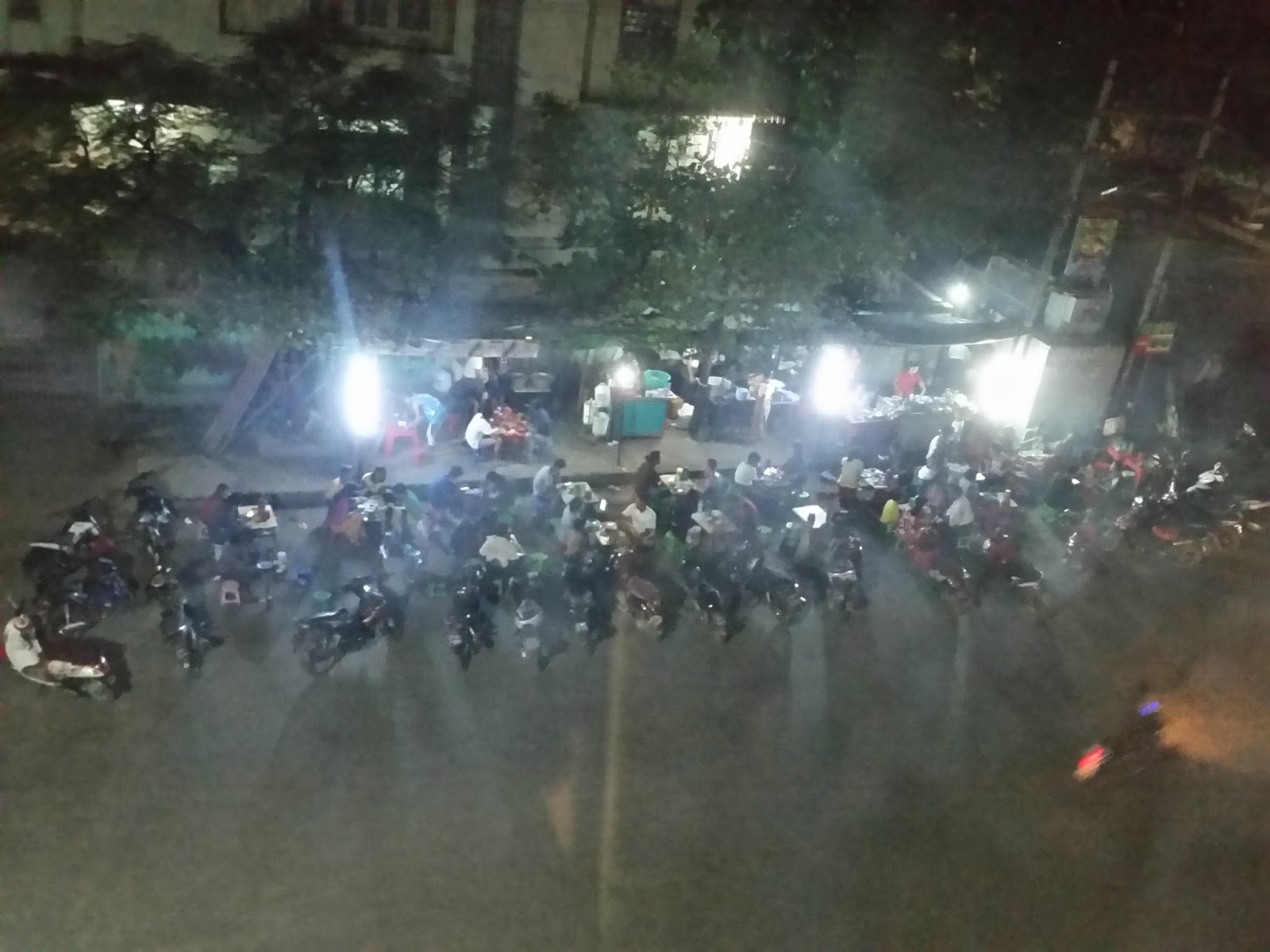 | A foto não está boa porque a janela estava suja, mas é uma barraca na frente do hotel com muitos locais jantando. Observei que os donos dormem ali mesmo com um bebê que deve ter 1 ano. |