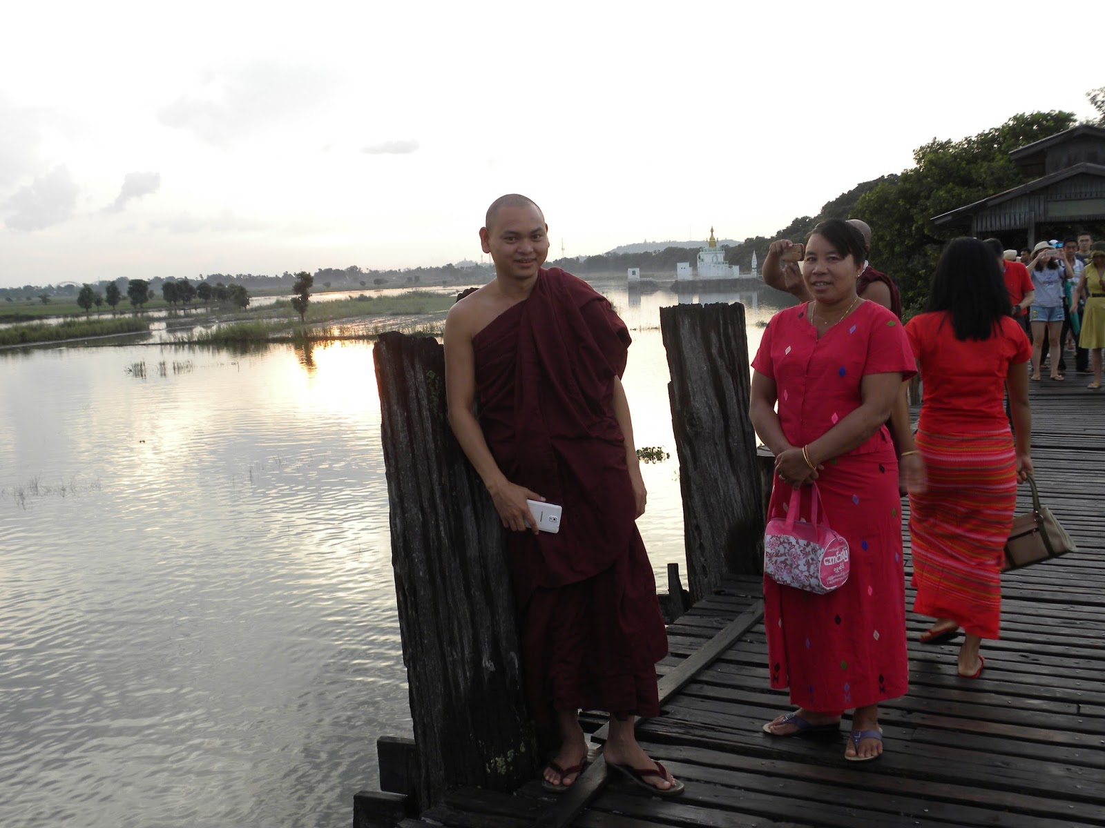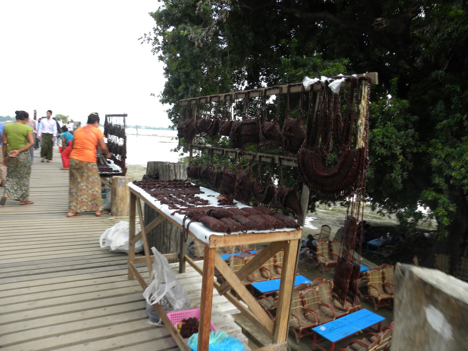 Percorri uma rua repleta de lojas até chegar no início da longa ponte de madeira, conhecida como “U Bein Bridge“, que fica sobre o lago Taungthaman. Tem 1,2 quilômetro de extensão e foi construída em 1.850. Talvez seja a ponte de madeira mais antiga do mundo! O turismo é uma grande fonte de renda para os moradores locais. Não adquiri nada, pois vendiam melancias, colares feitos com os caroços da melancia.