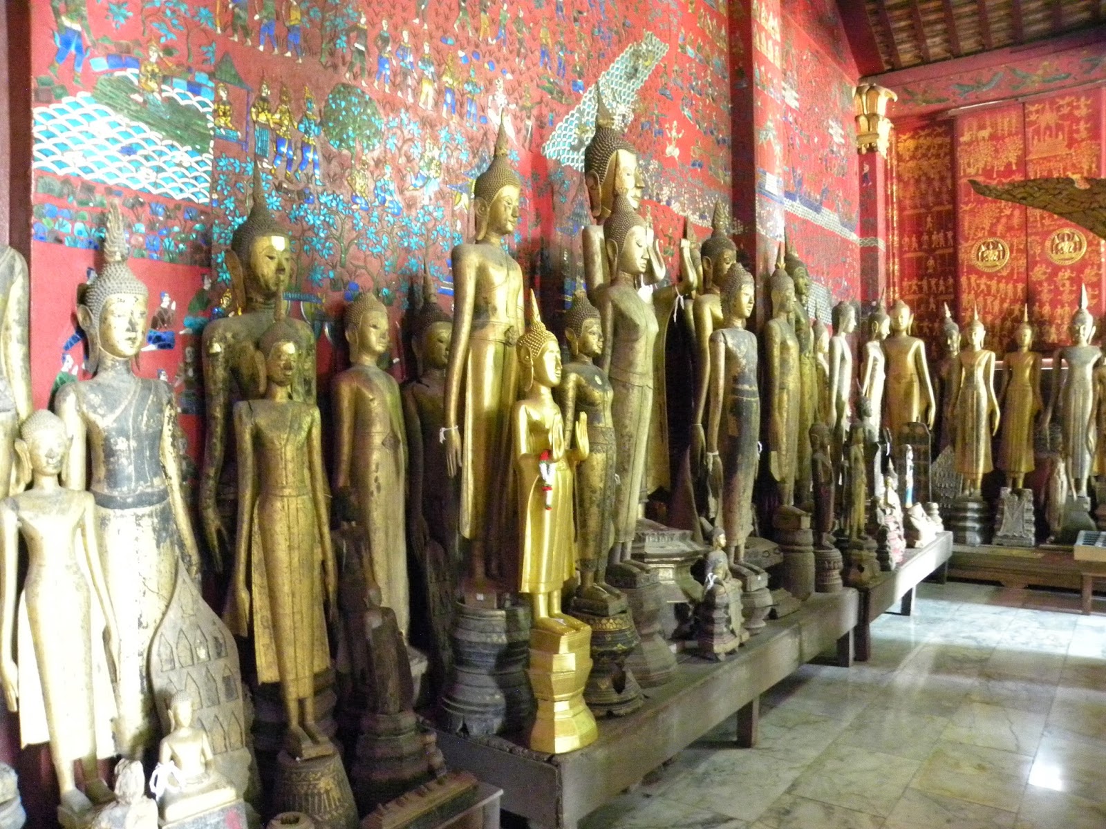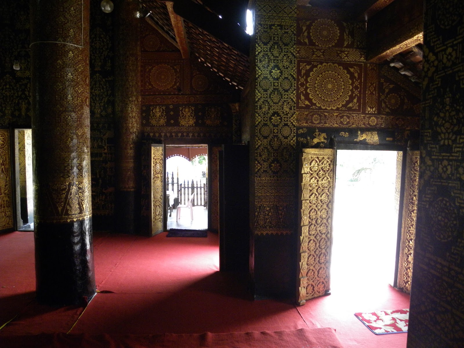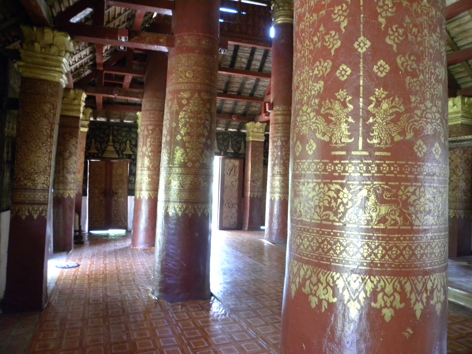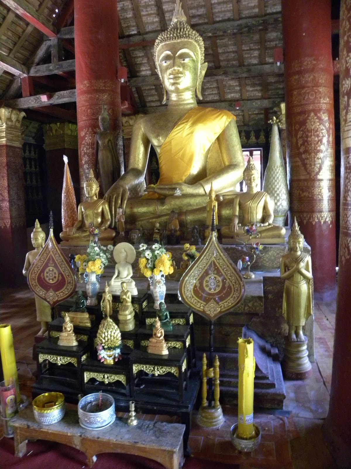 Entrei no templo Wat Sene, que fica próximo ao Museu Nacional, na rua do mercado noturno. Foi construído pelo rei Kitsarath com 100.000 pedras do Rio Mekong, em 1718. Significa “templo de 100.000 tesouros”. A nave interior vermelha com estênceis de ouro sobre as colunas, vigas e paredes, juntamente com a variedade de estátuas de Buda dourada e mesas no altar e a grande estátua de Buda fornecem a evidência da importância religiosa, estética e arquitetônica.