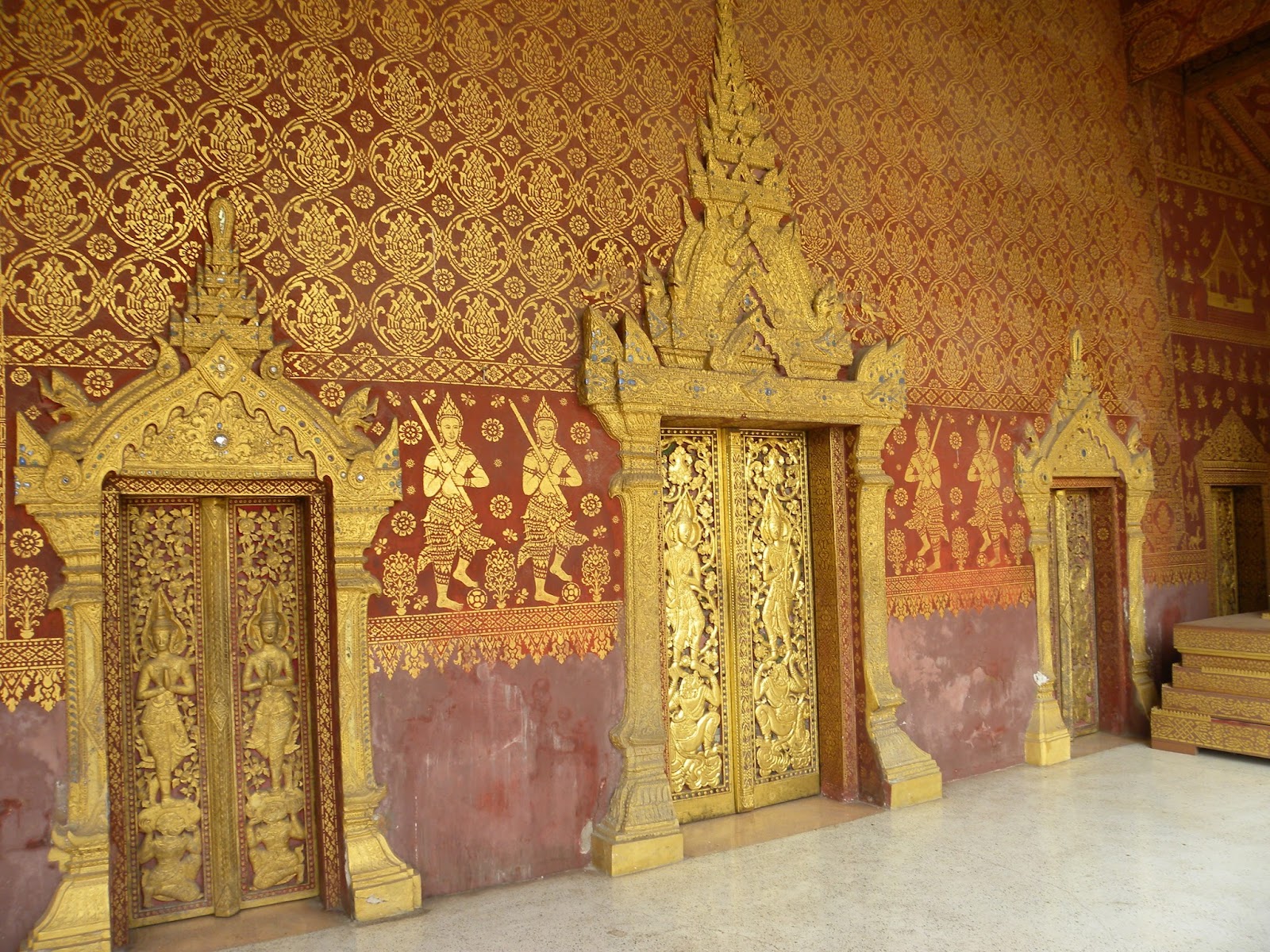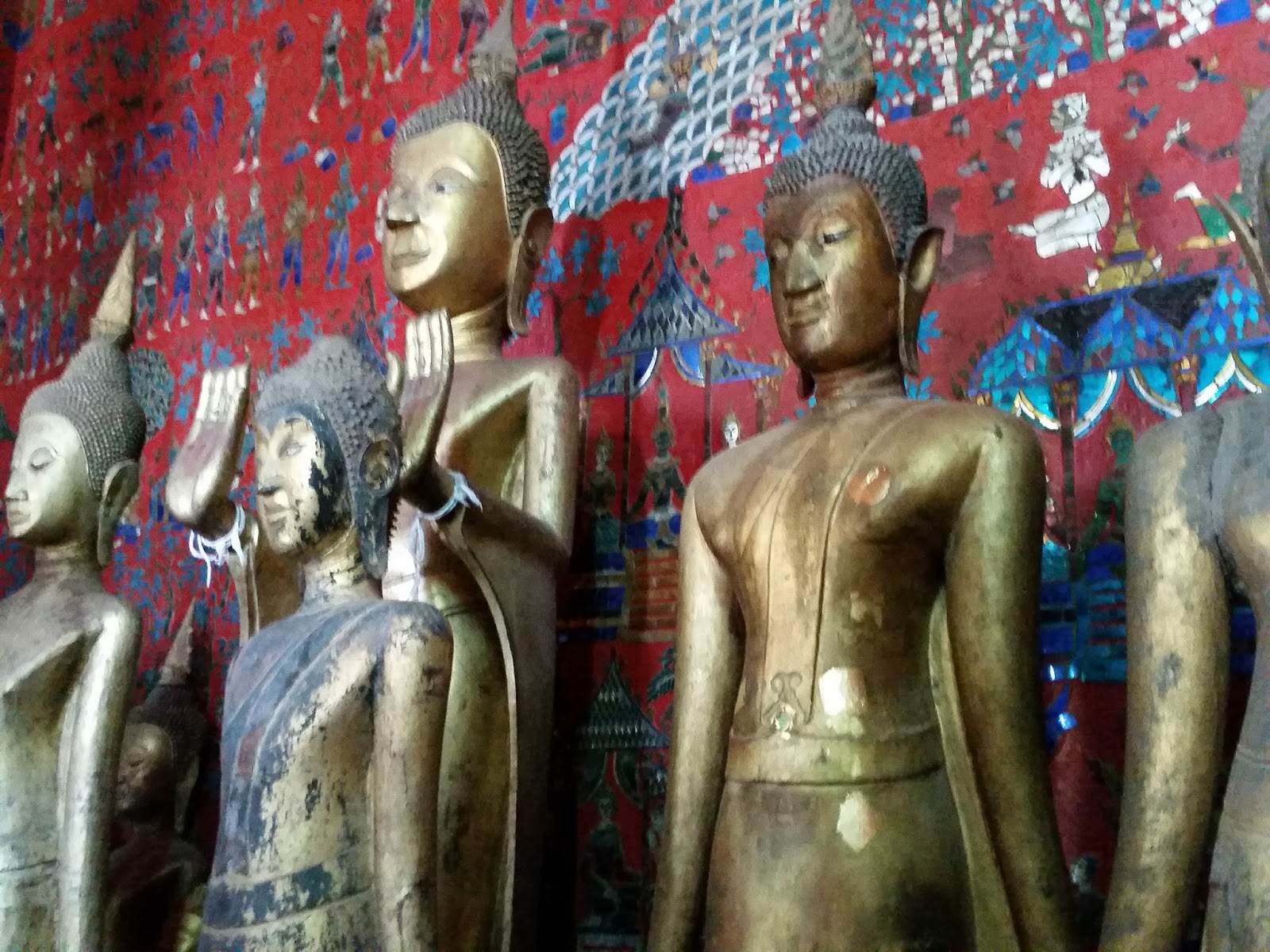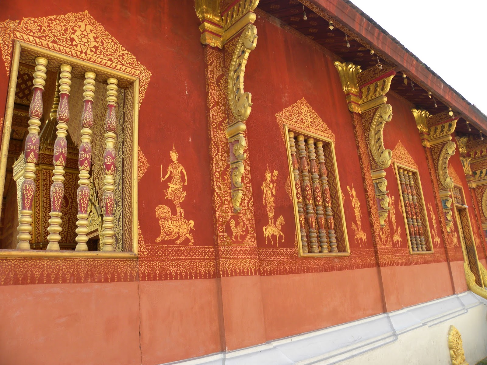 Entrei no templo Wat Sene, que fica próximo ao Museu Nacional, na rua do mercado noturno. Foi construído pelo rei Kitsarath com 100.000 pedras do Rio Mekong, em 1718. Significa “templo de 100.000 tesouros”. A nave interior vermelha com estênceis de ouro sobre as colunas, vigas e paredes, juntamente com a variedade de estátuas de Buda dourada e mesas no altar e a grande estátua de Buda fornecem a evidência da importância religiosa, estética e arquitetônica.