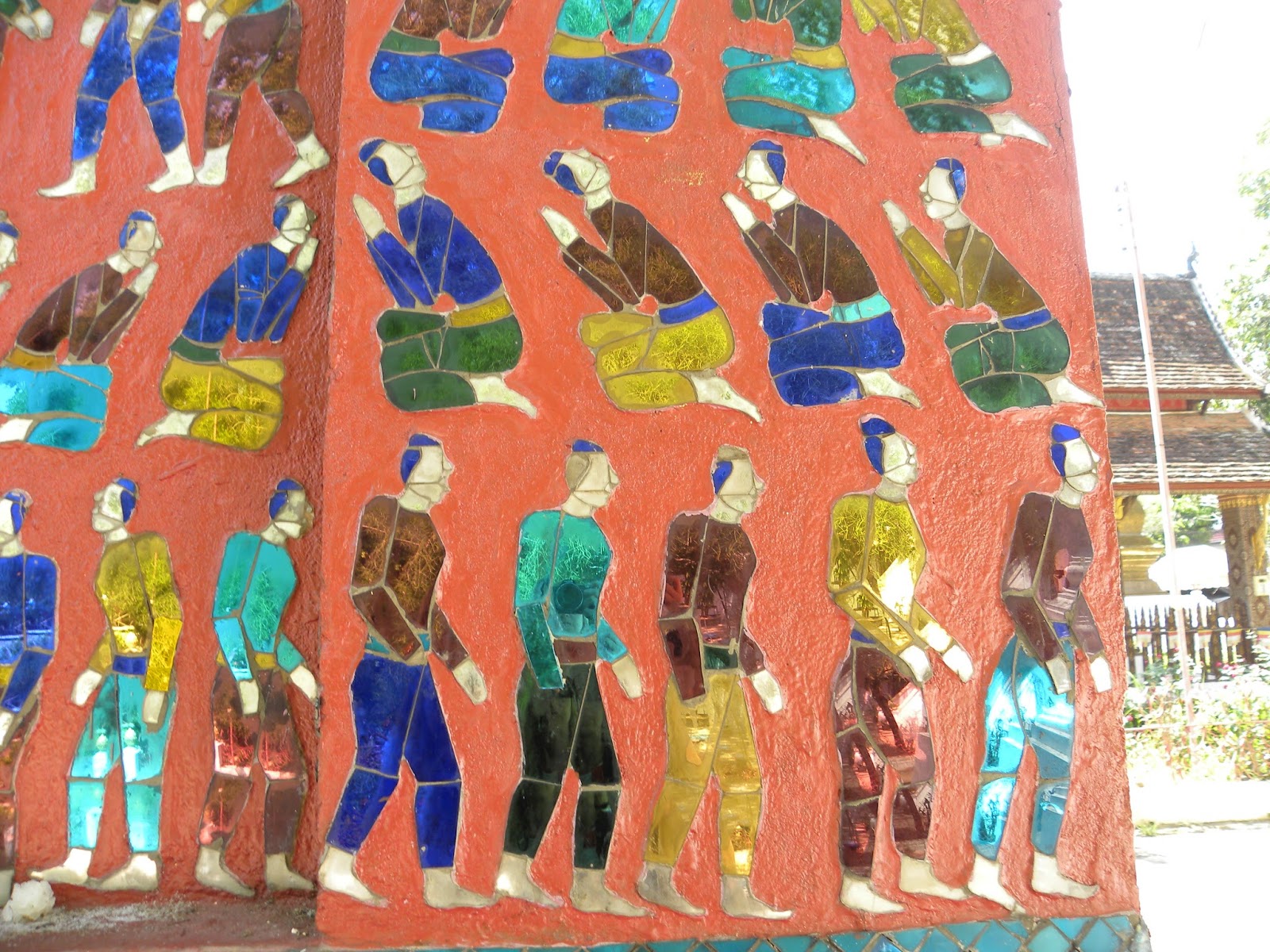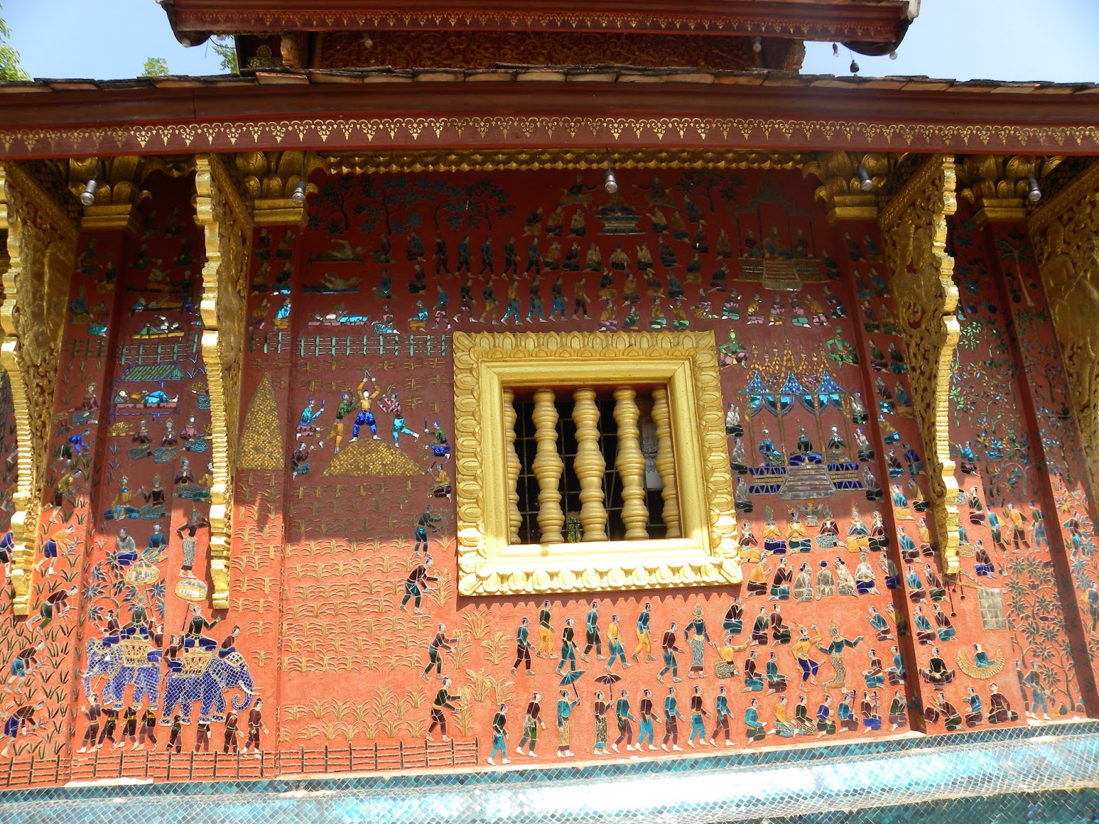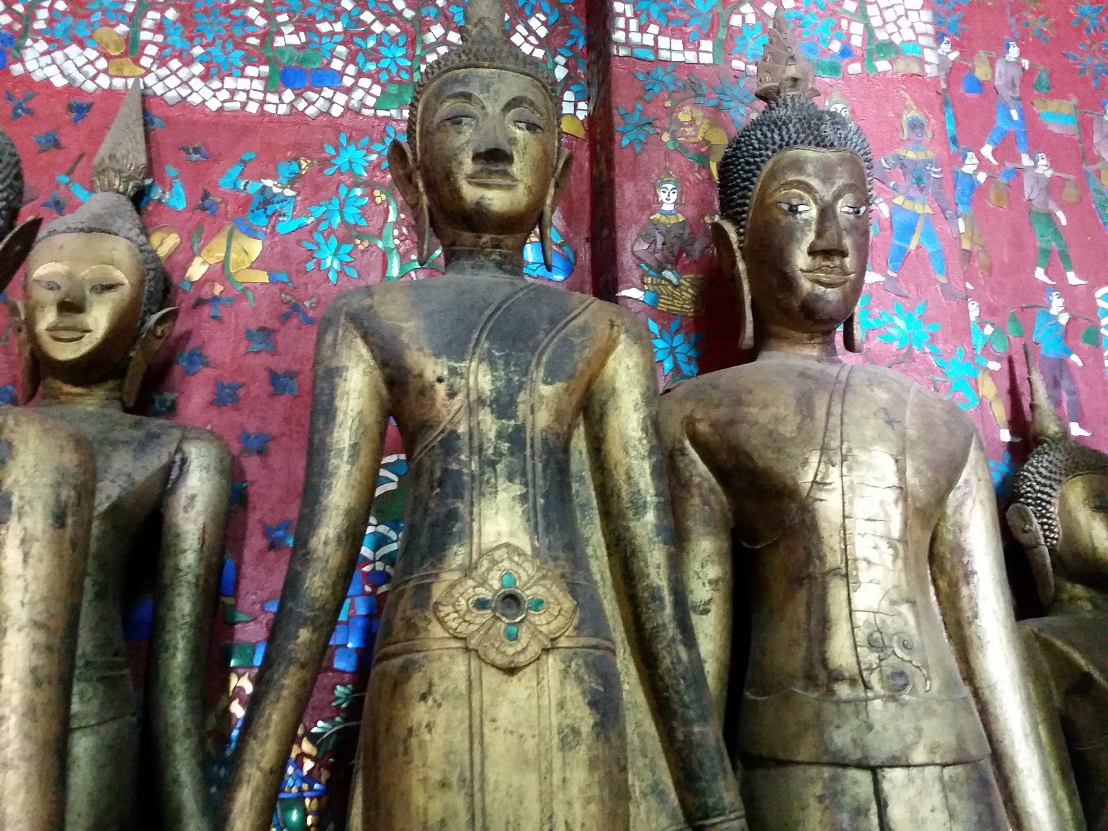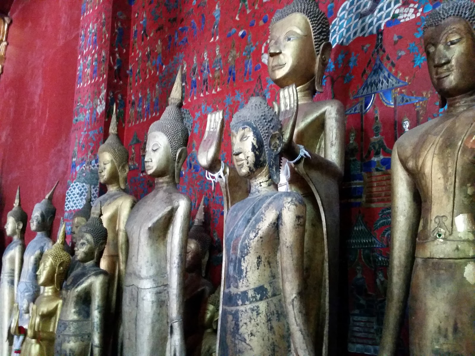 Entrei no templo Wat Sene, que fica próximo ao Museu Nacional, na rua do mercado noturno. Foi construído pelo rei Kitsarath com 100.000 pedras do Rio Mekong, em 1718. Significa “templo de 100.000 tesouros”. A nave interior vermelha com estênceis de ouro sobre as colunas, vigas e paredes, juntamente com a variedade de estátuas de Buda dourada e mesas no altar e a grande estátua de Buda fornecem a evidência da importância religiosa, estética e arquitetônica.