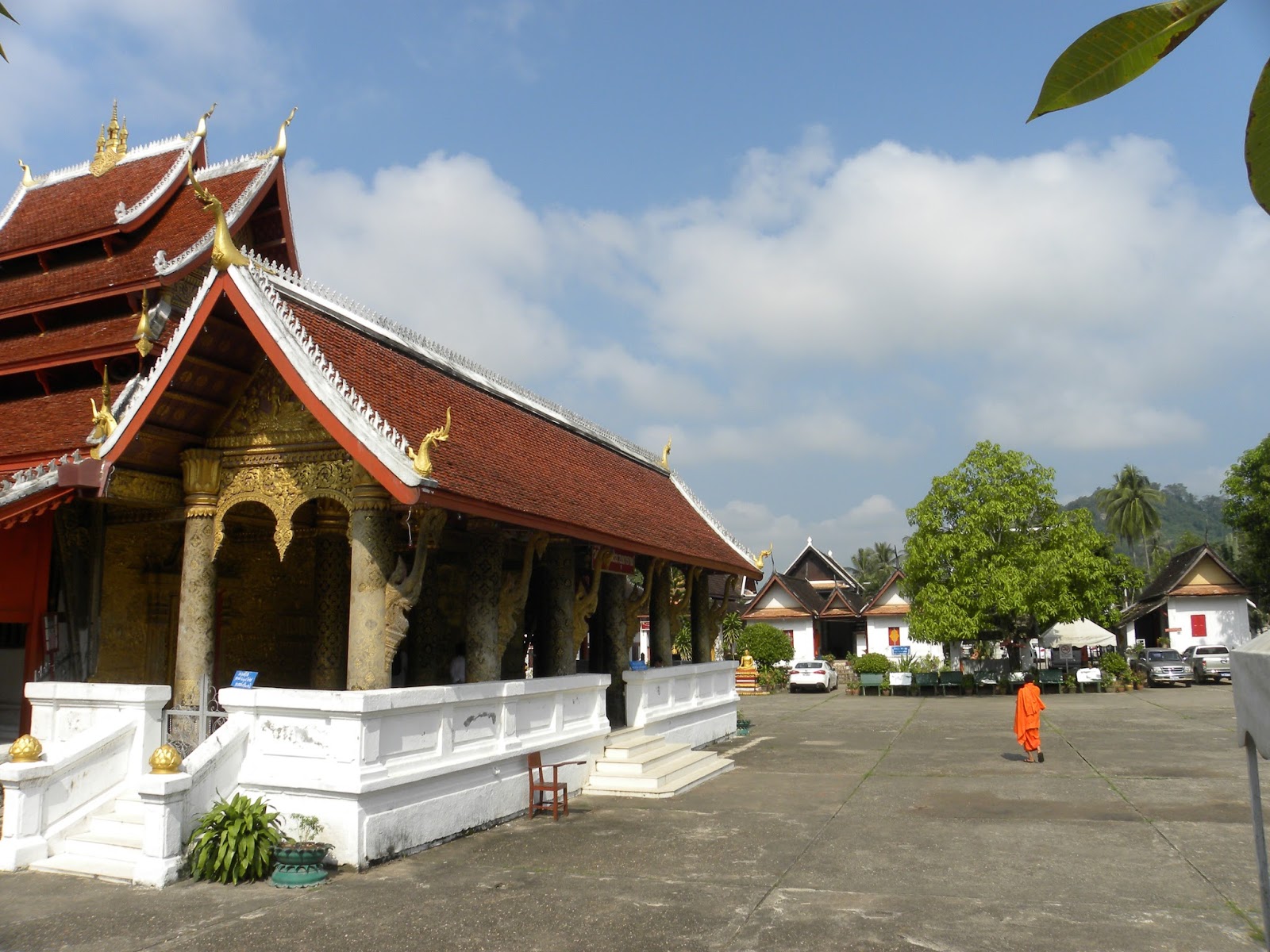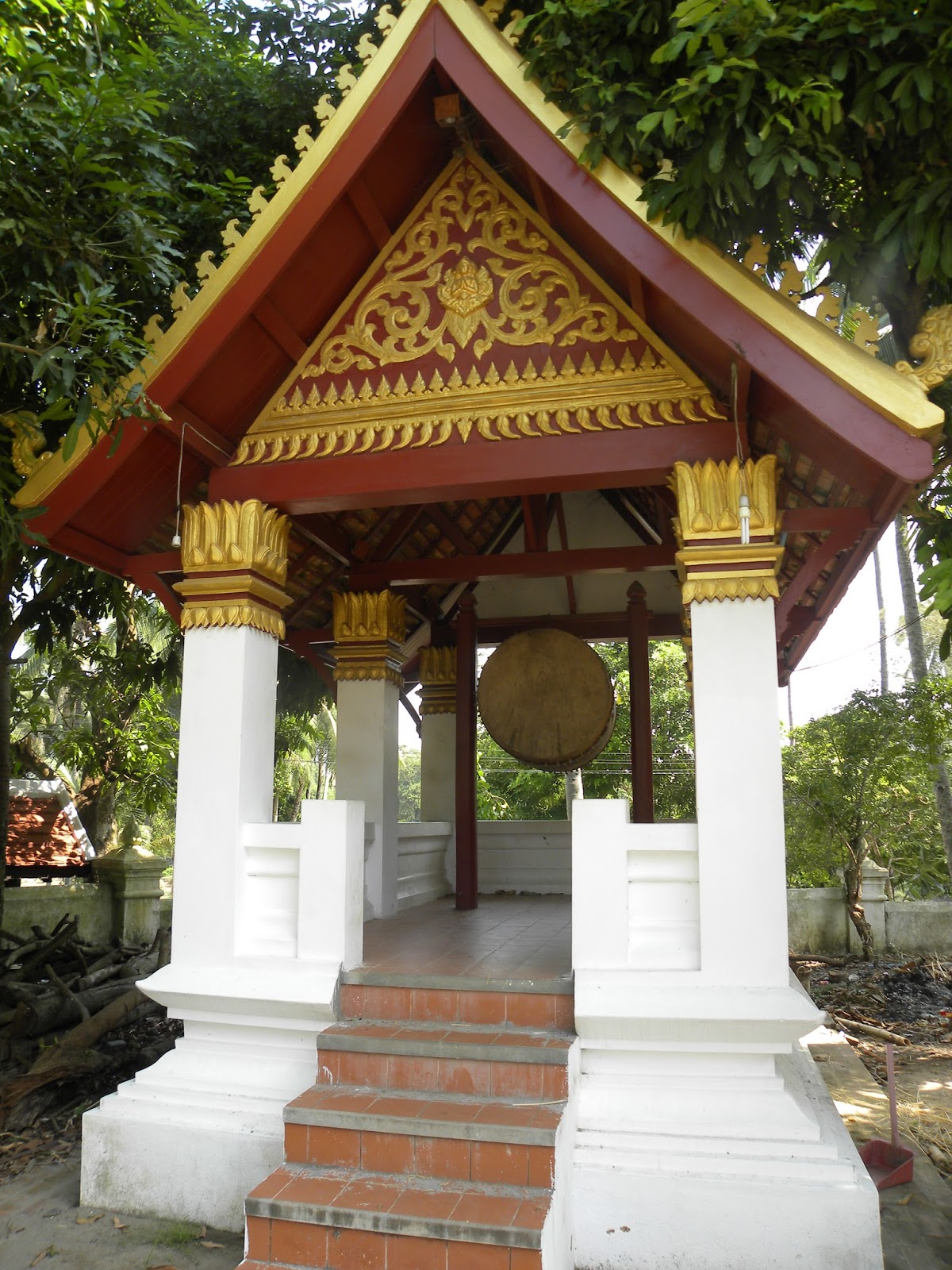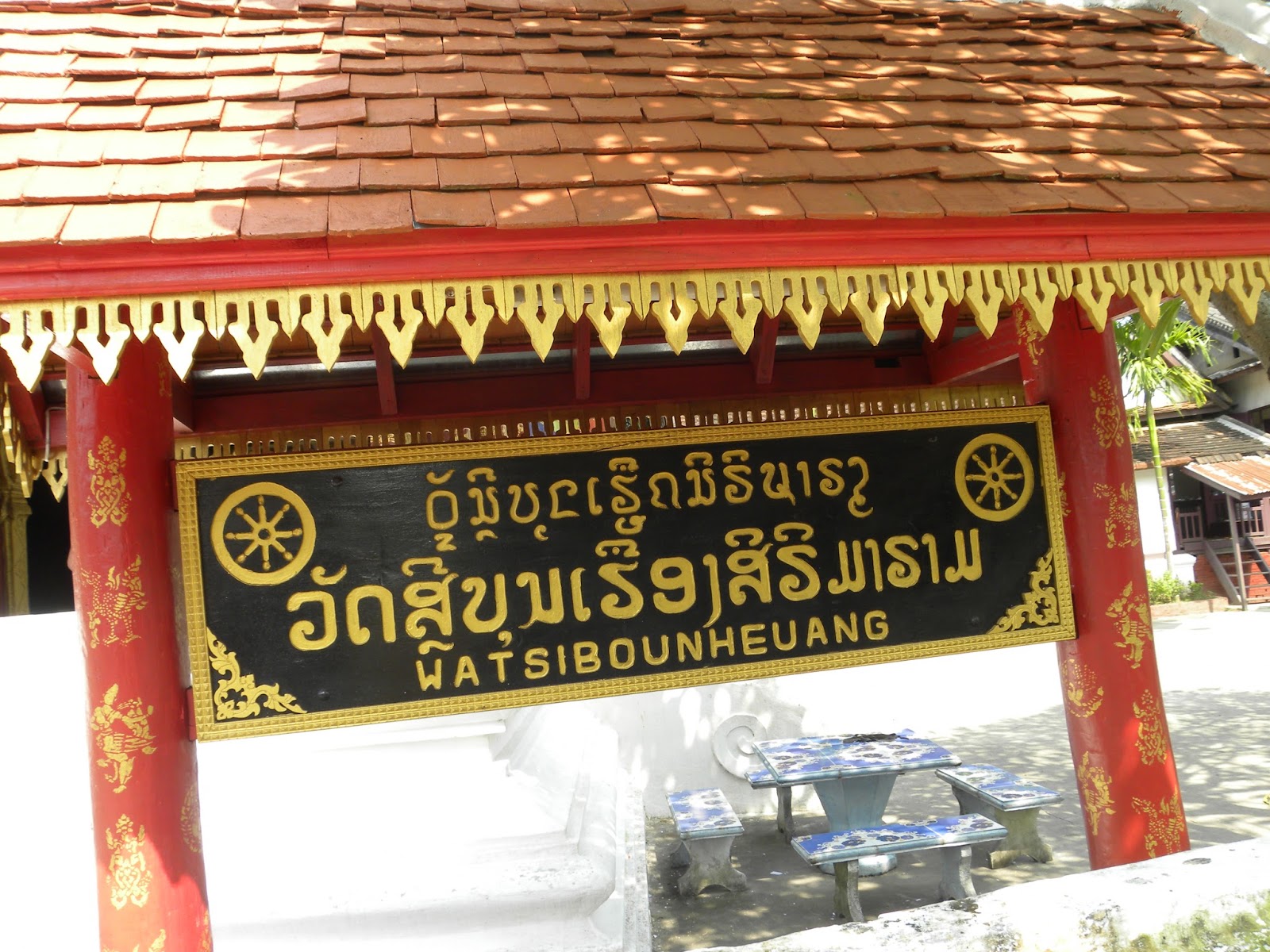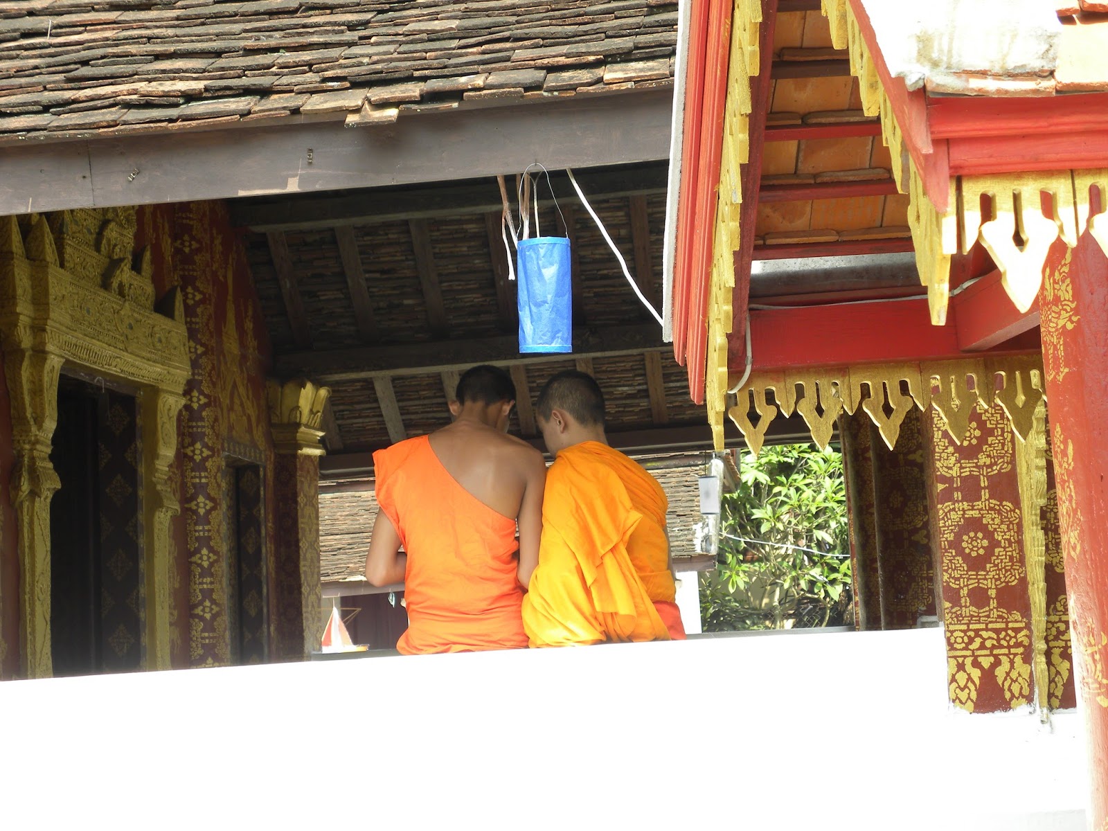 E, por último, o Wat Sibounheuang. O que mais me chamou a atenção nesse templo: na varanda havia dois monges tecnológicos, que utilizavam celular. Não sabia que tinham acesso à tecnologia.