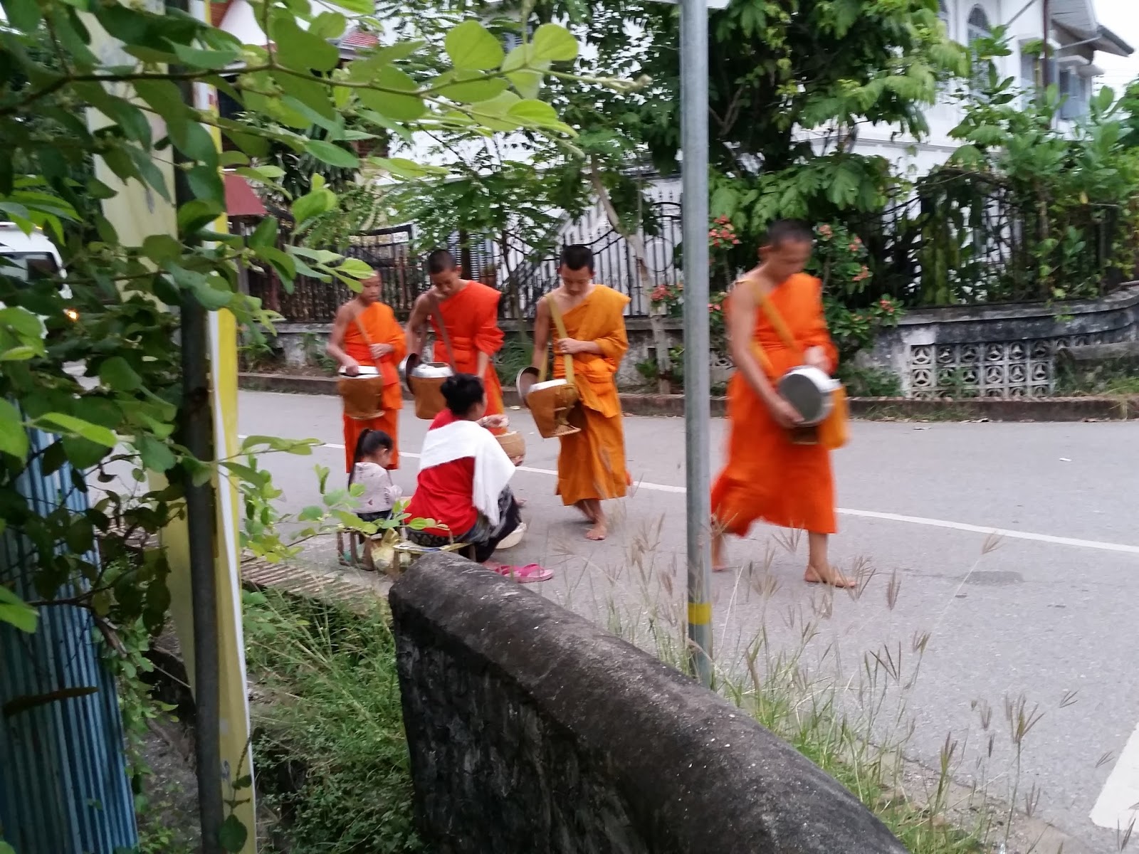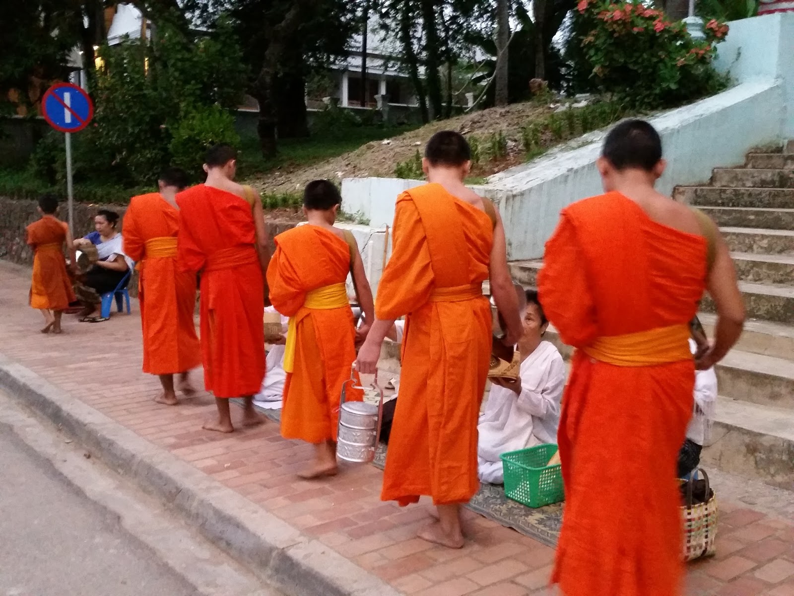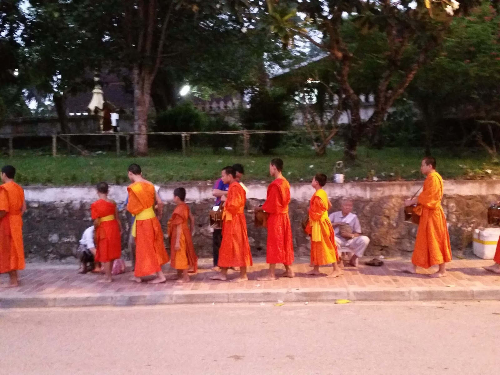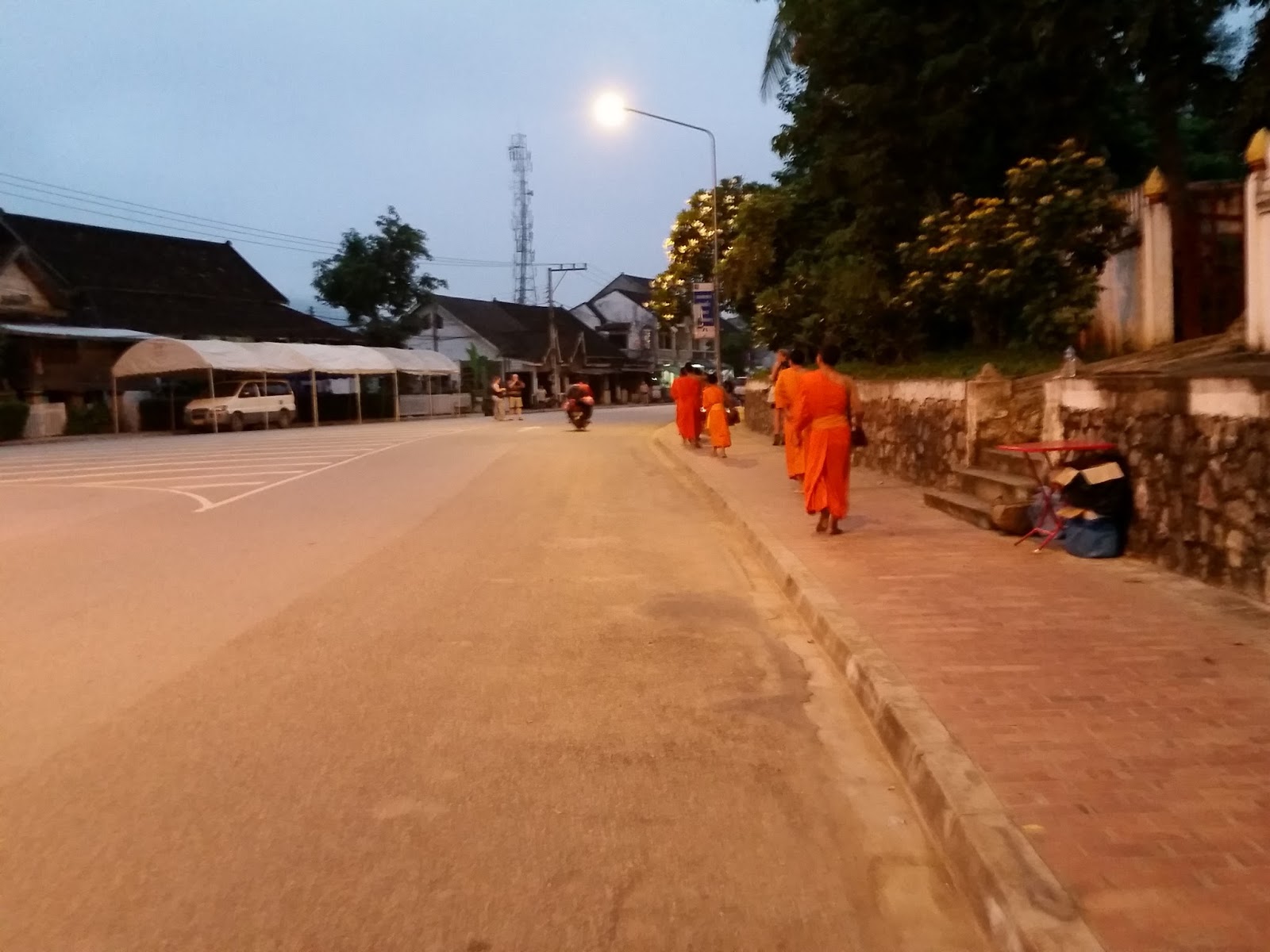 Segui até a rua principal e acompanhei a cerimônia por mais de uma hora. Tentei ficar distante para não atrapalhar e não usei flash (logo, as fotos não ficaram boas). Como relatado no “post” anterior, a “Ronda das Almas” é ritual religioso budista que ocorre todos os dias em Luang Prabang e remonta ao século 14. Cerca de 200 monges recolhem as esmolas, pois só comem alimentos doados. Os moradores saem das suas casas, se ajoelham ou ficam sentados em banquinhos, ofertando arroz, doces, frutas.