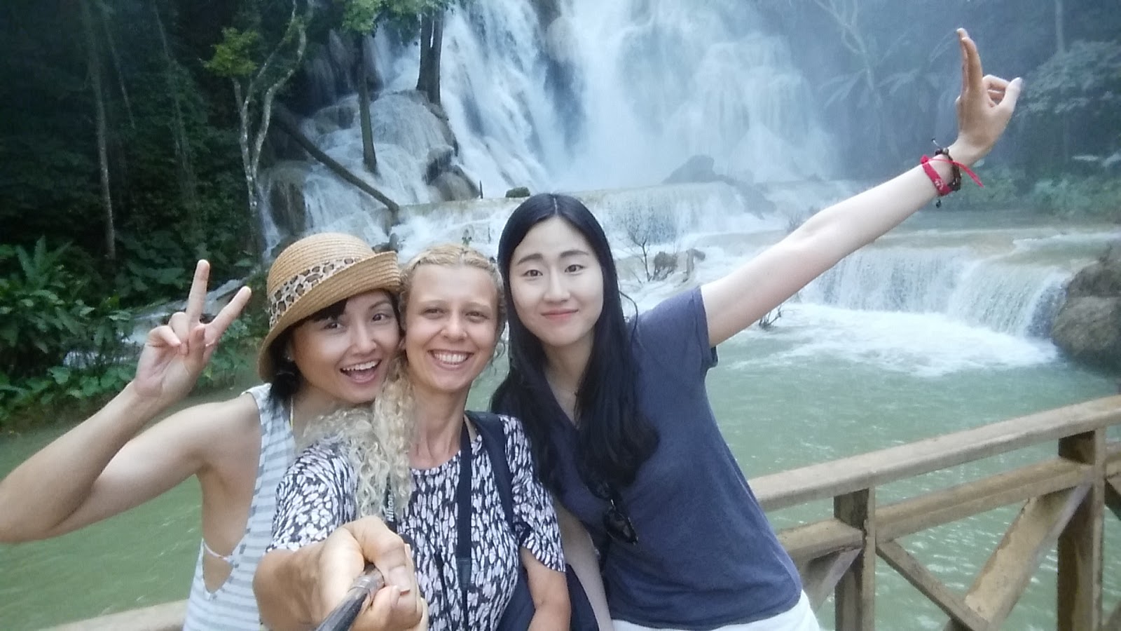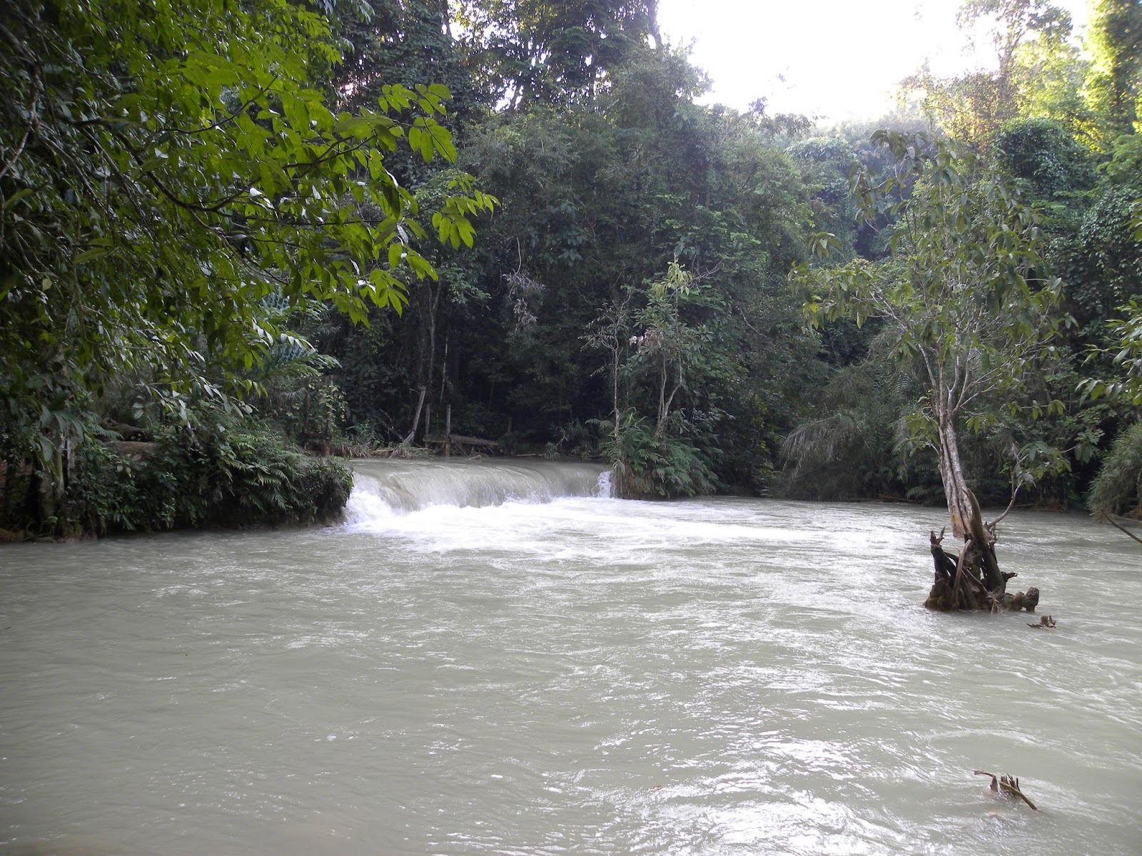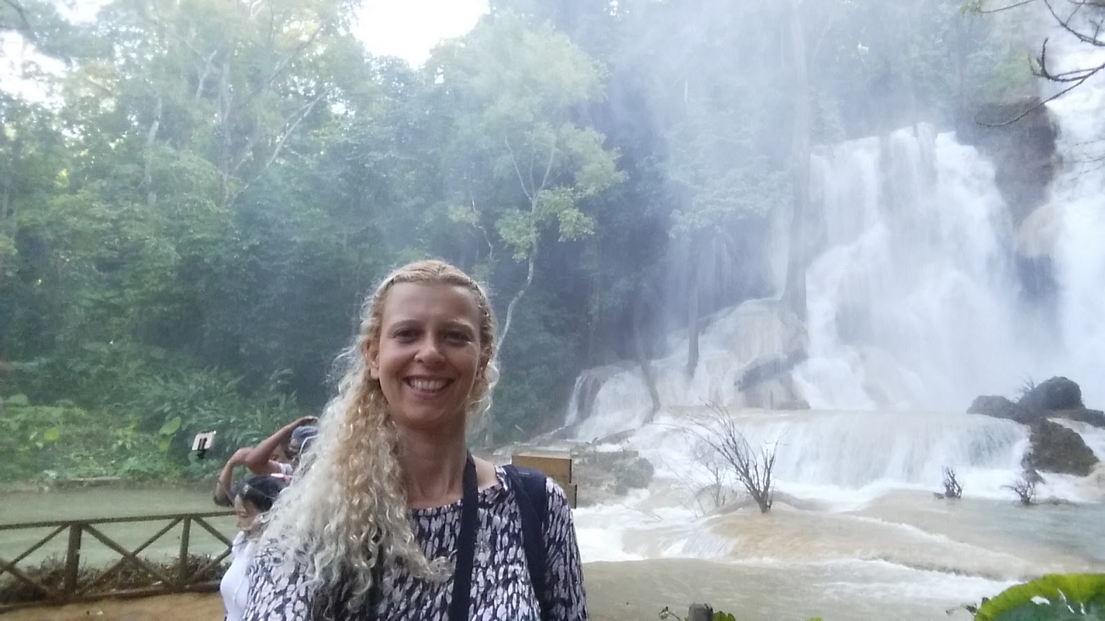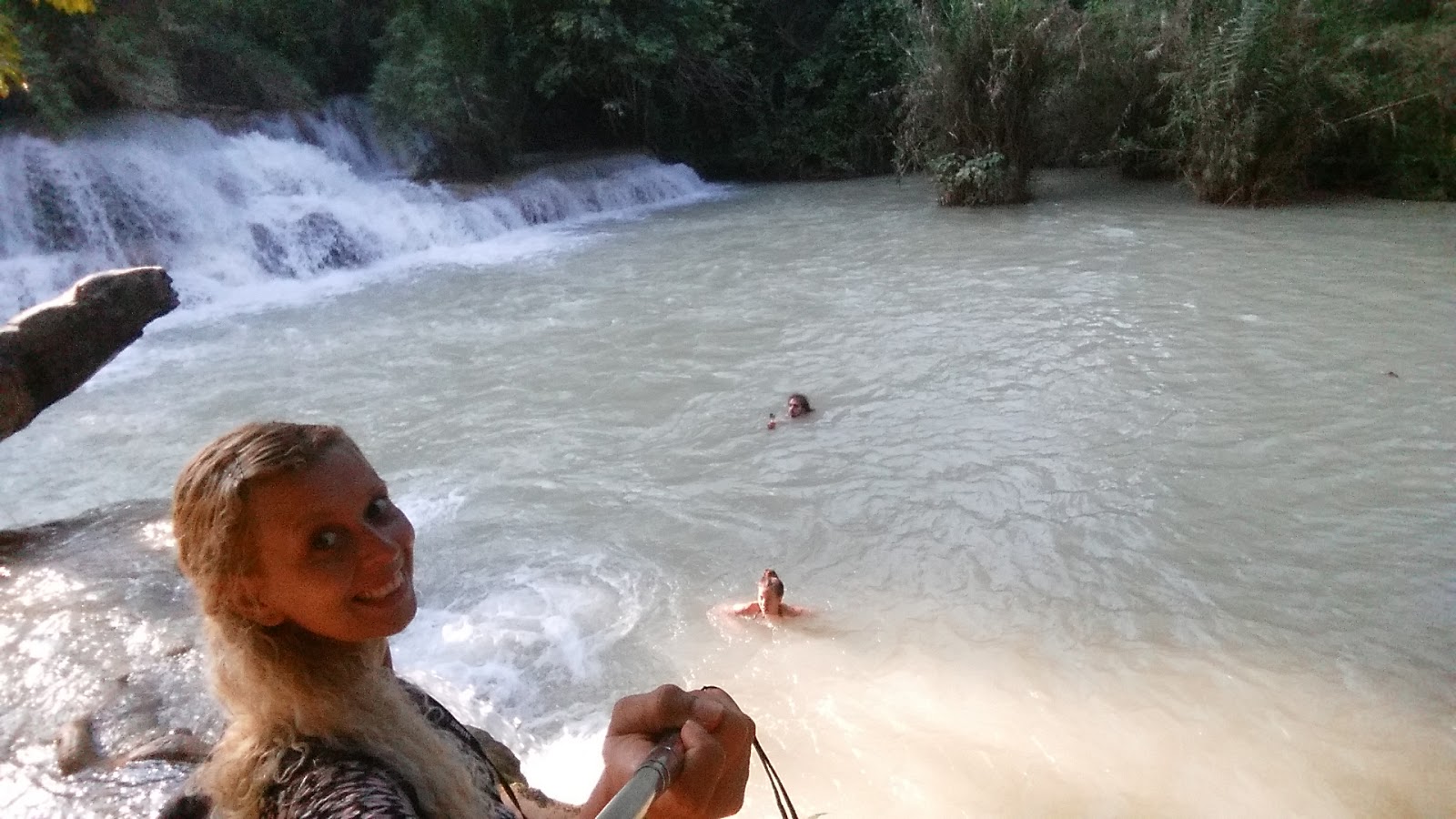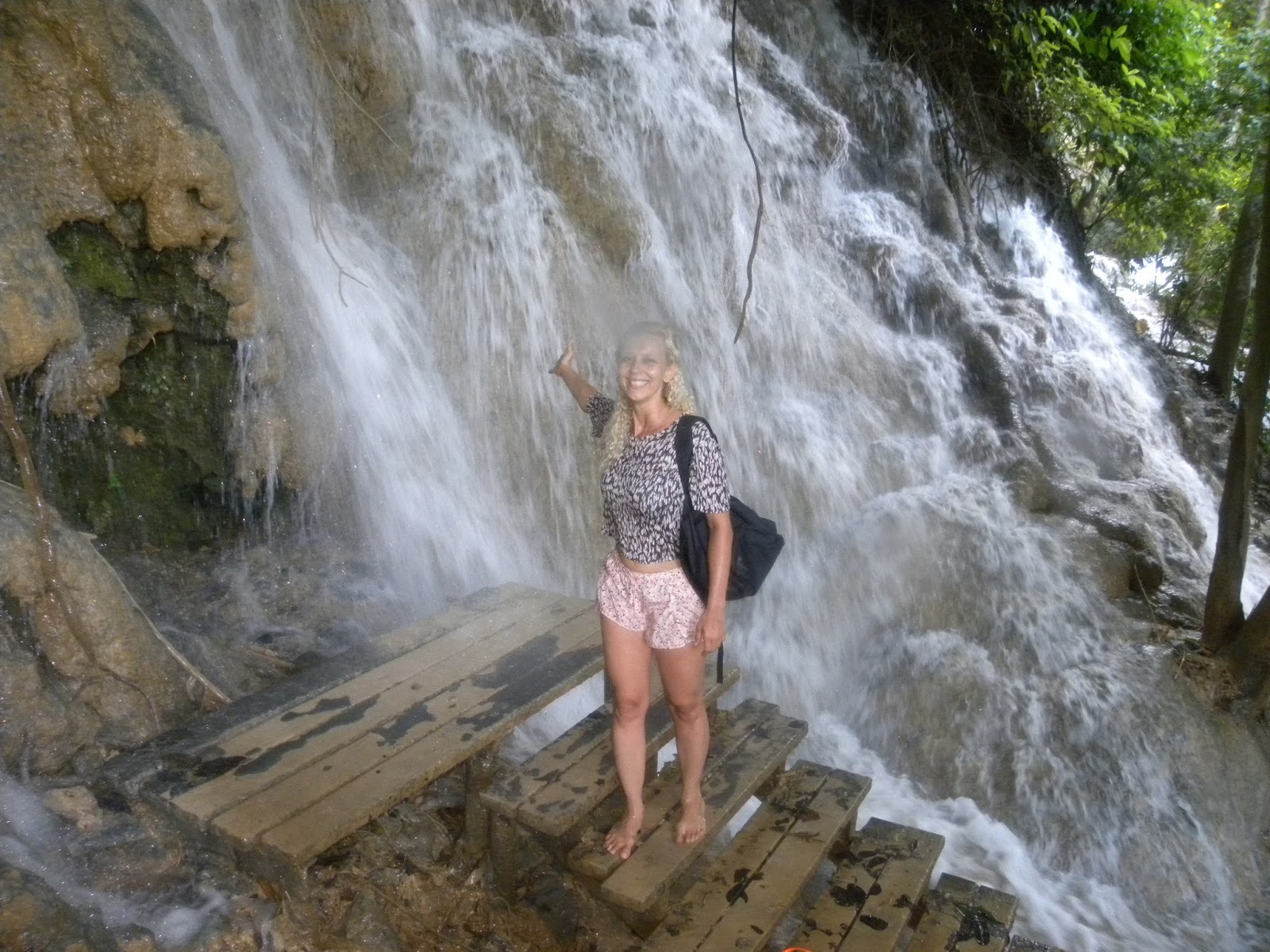 Voltei para o hotel e me arrumei para visitar a “Kuangsi Waterfall“. O gerente do hotel marcou às 14h, o tour custava 16.000 kips. O motorista pega os passageiros no hotel, deixa na entrada do parque e marca um horário de retorno. Olhei para o relógio, que marcava 15h, e ainda não tinha me chamado no quarto. Desci as escadas e o gerente fez uma cara de assustado, pois estava óbvio que tinha esquecido da minha reserva. Pediu pra aguardar e em 20 minutos apareceu uma van, que só tinha um casal dentro. No caminho, entraram duas meninas. A que sentou ao meu lado, a Mimi, era tailandesa e conversamos por todo o percurso.