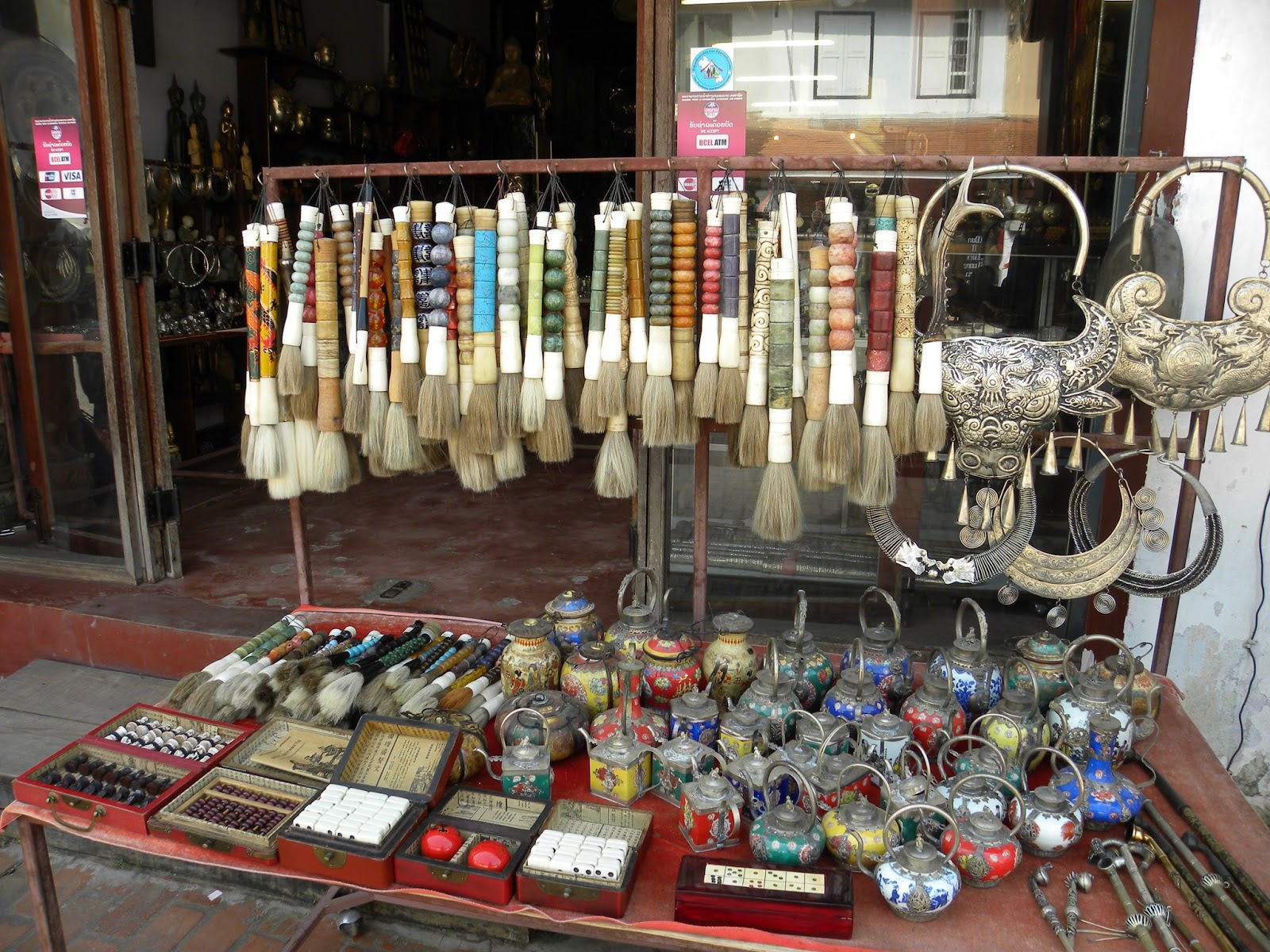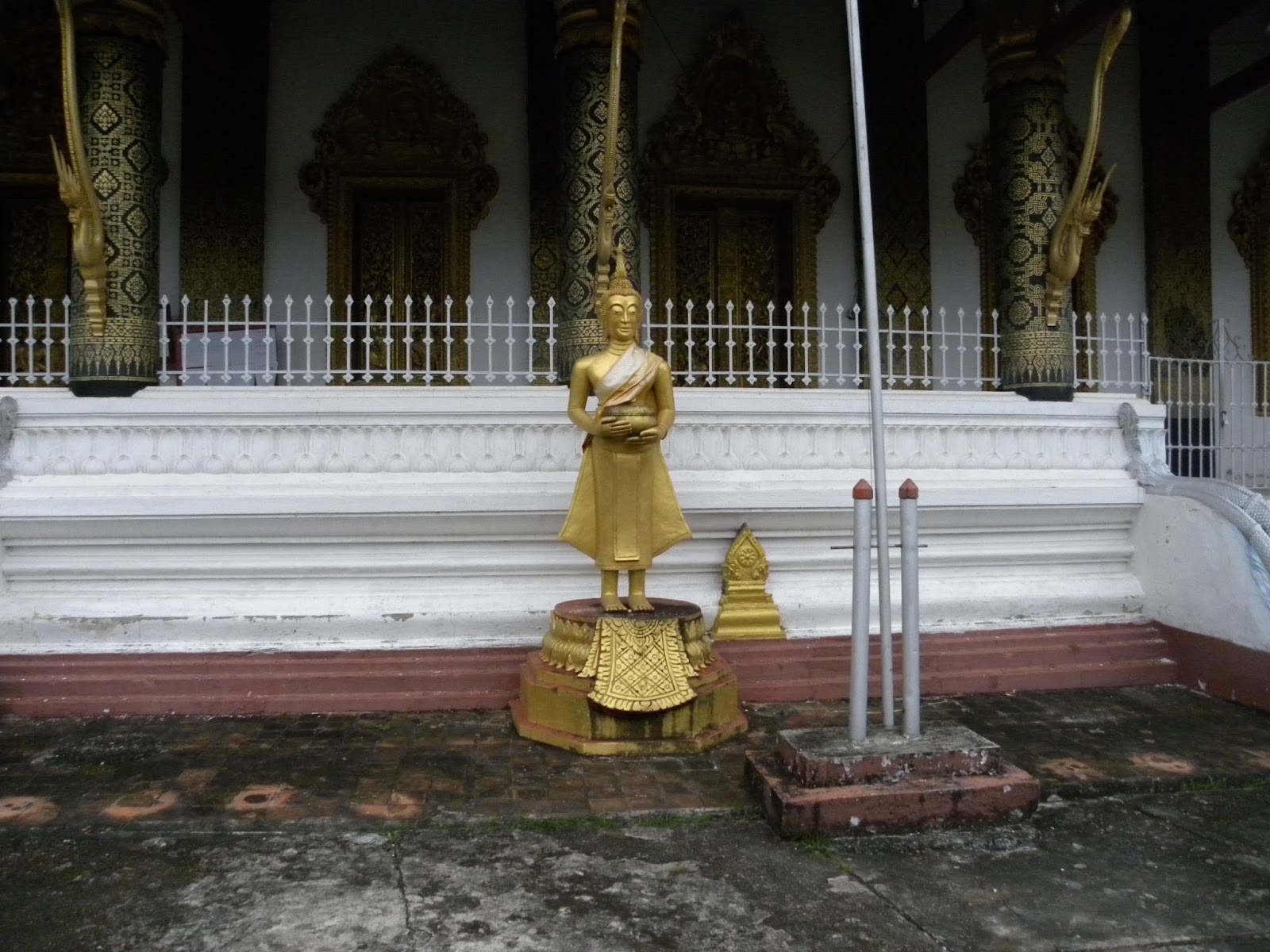 Aproveitei a proximidade para subir as escadas do Wat Mahathat, onde muitos dos monges entraram após a “Ronda das Almas”. Foi fundado pelo rei Say Setthathirath (governador de Chiang Mai, na Tailândia) em 1548. As escadas com serpentes douradas de sete cabeças seguem o modelo de um dos templos da cidade de Chiang Mai.