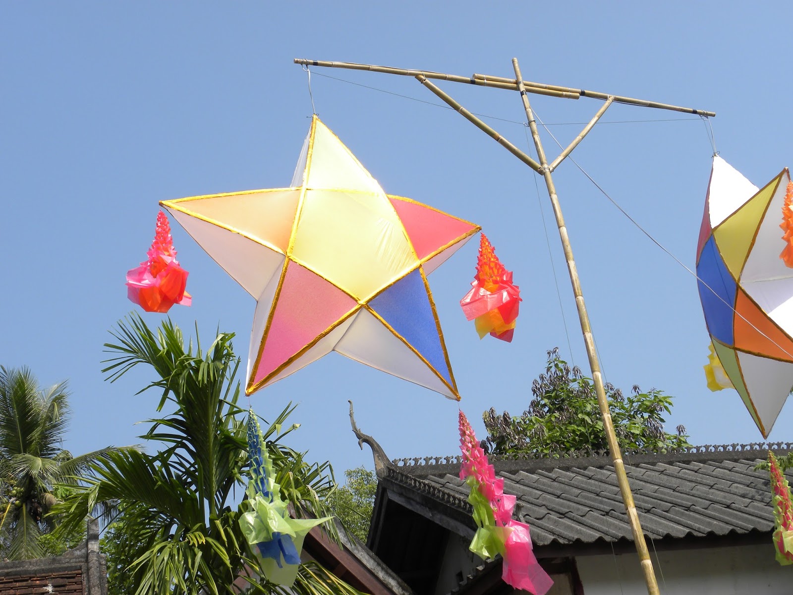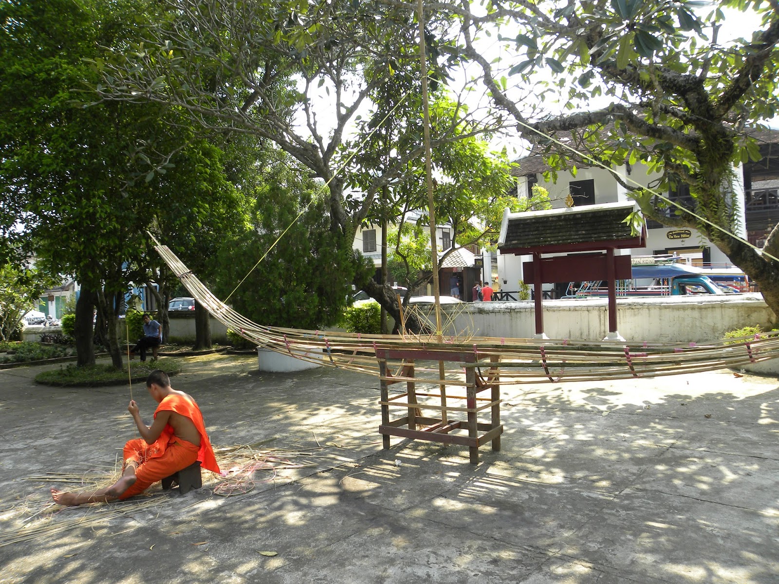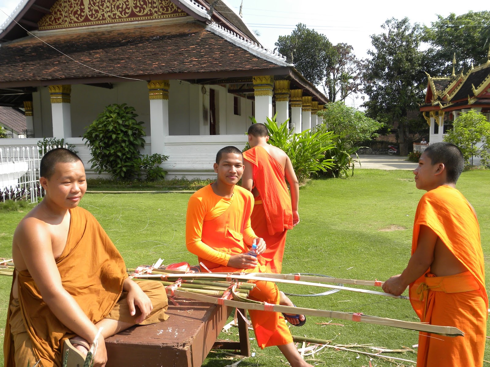 Passei pelo Wat Sop Sickharam, que tinha alguns monges no pátio, construindo objetos com bambu e papel de seda.