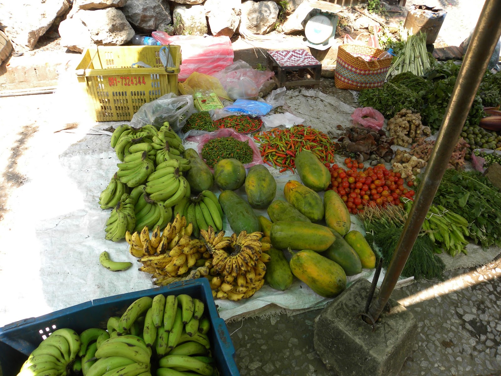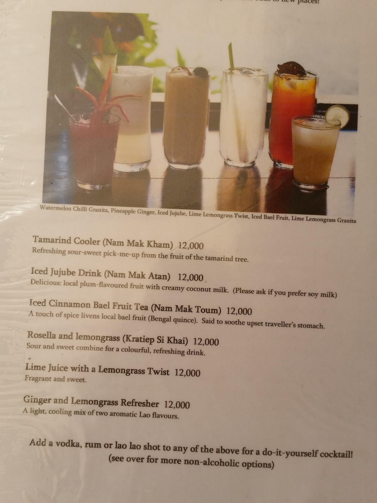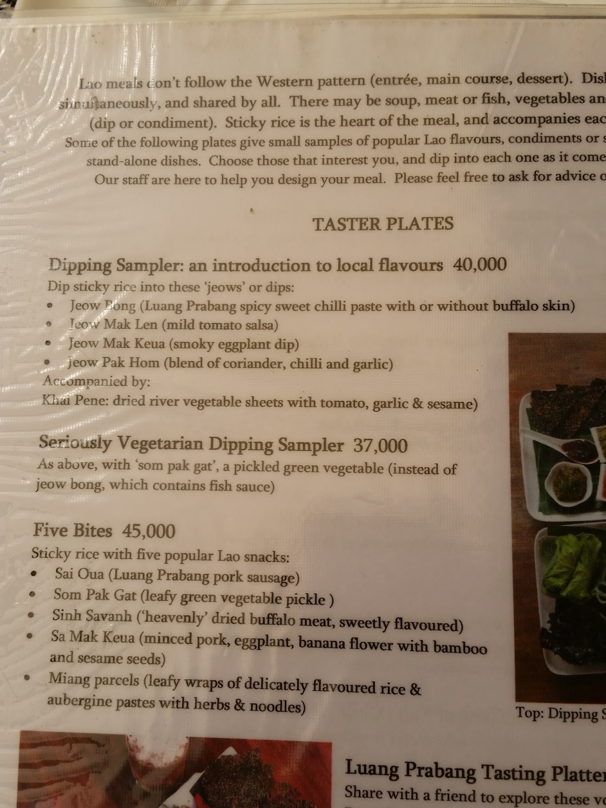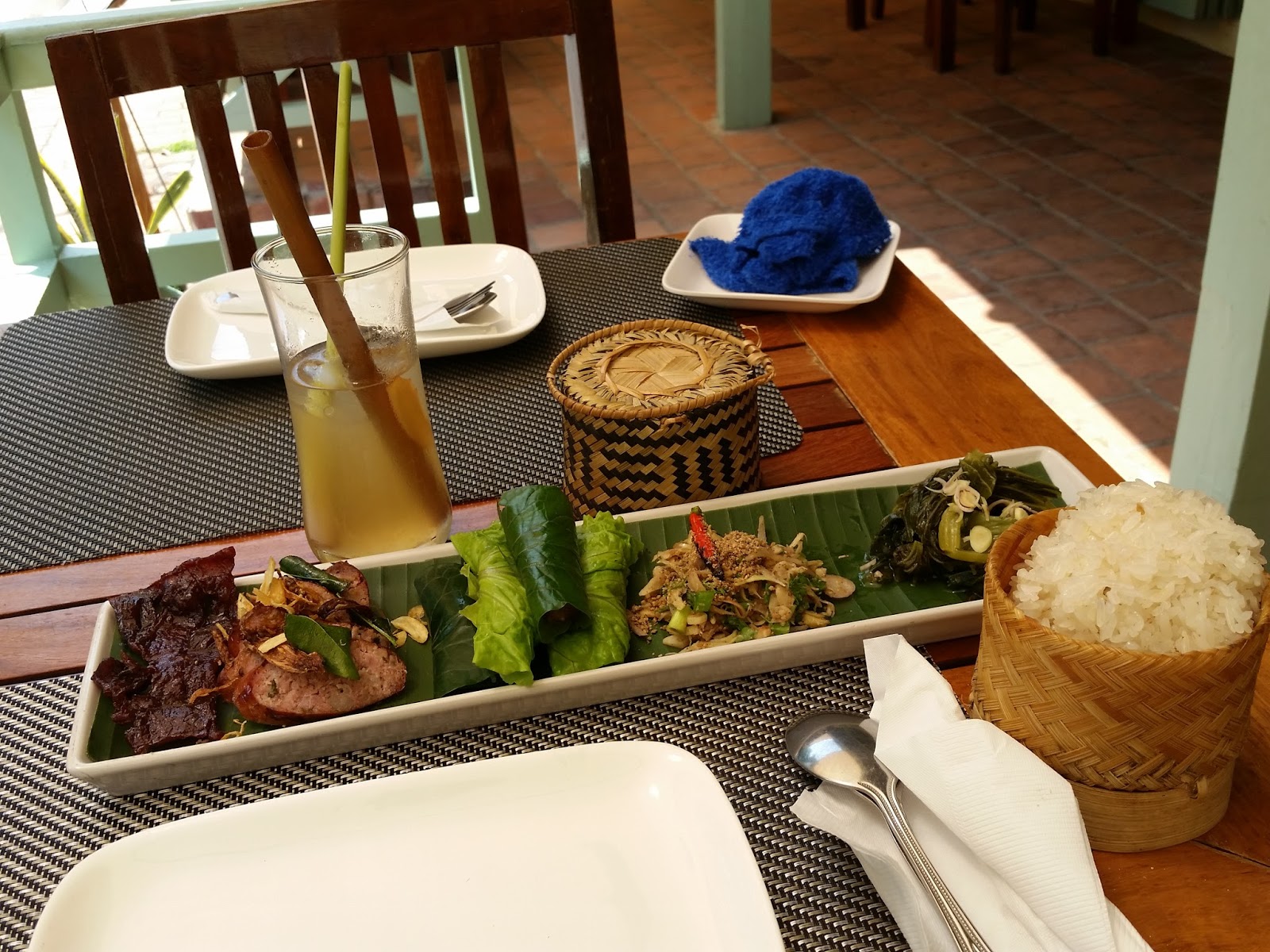 A bebida (12.000 kips) era incrível, feita com água, capim-limão e gengibre, servida com um canudo de bambu. O cardápio tinha outras que deveriam ser igualmente saborosas, com tamarindo, limão, entre outros ingredientes. A comida (45.000 kips) se resumia em cinco petiscos típicos do Laos servidos com sticky rice (o arroz grudento). O garçom me serviu e me ensinou como comer o arroz com a mão (limpar a mão com a toalhinha e fazer bolinhas de arroz com as palmas das mãos). Depois pedi para tirar uma foto. Não achei a comida saborosa e me esforcei para comer tudo, mas a experiência foi válida.
