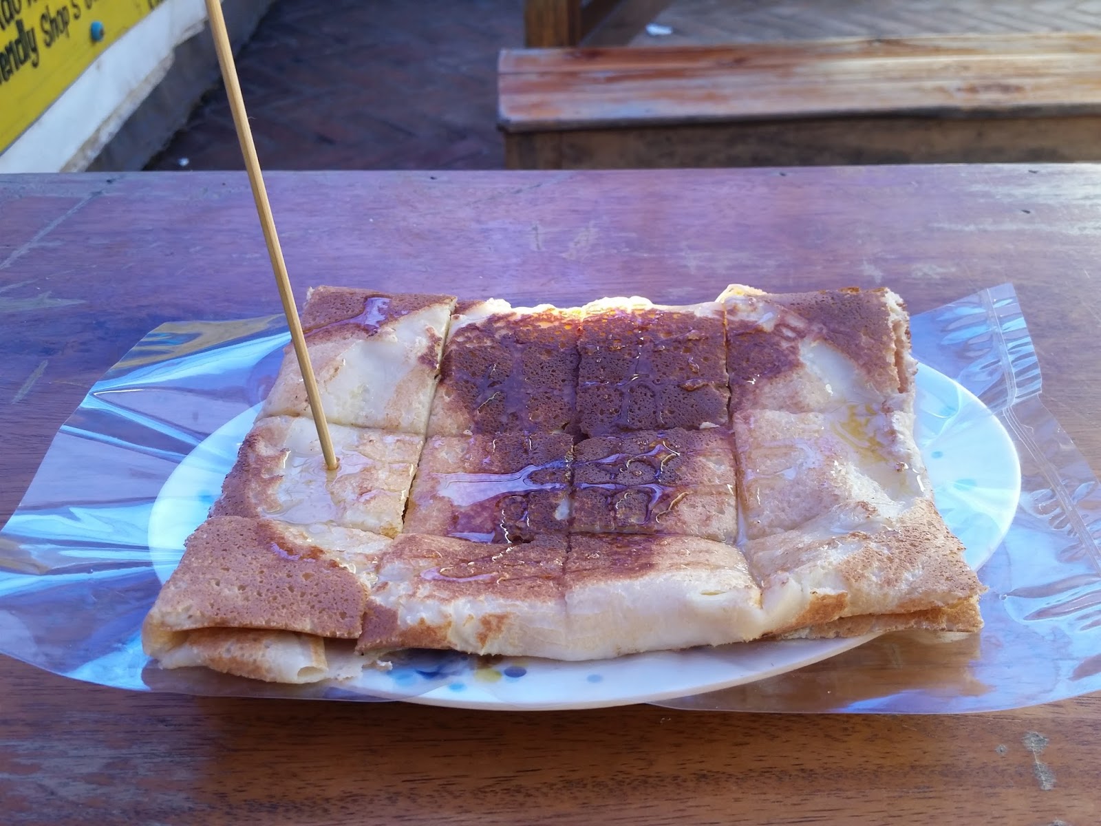 Naquele dia, no Mercado Noturno, comprei os últimos badulaques, como capa de almofadas pra minha mãe, tomei um suco natural (10 mil kips), novamente jantei no “self-service” (15 mil kips) e comi “coconut pancake” (5 mil kips). Mimi depois me contou que a panqueca de coco é um clássico da culinária tailandesa, mas não vi por lá. Em razão do problema no dia anterior, como contei no primeiro post (uma moto me seguiu na rua enquanto caminhava sozinha no retorno do mercado noturno), mudei a rota pra voltar o hotel. Tinha visto duas turistas usando a lanterna do celular e copiei a ideia, me iluminei no caminho e segui um homem local, mas inacreditavelmente duas motos apareceram e foram embora assim que joguei o facho de luz sobre eles.