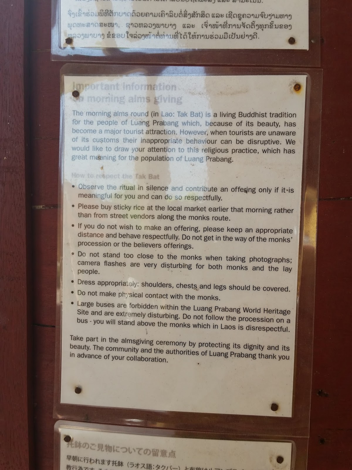 | Outro templo que pede aos turistas respeito durante a cerimônia de “Alms Giving” |
