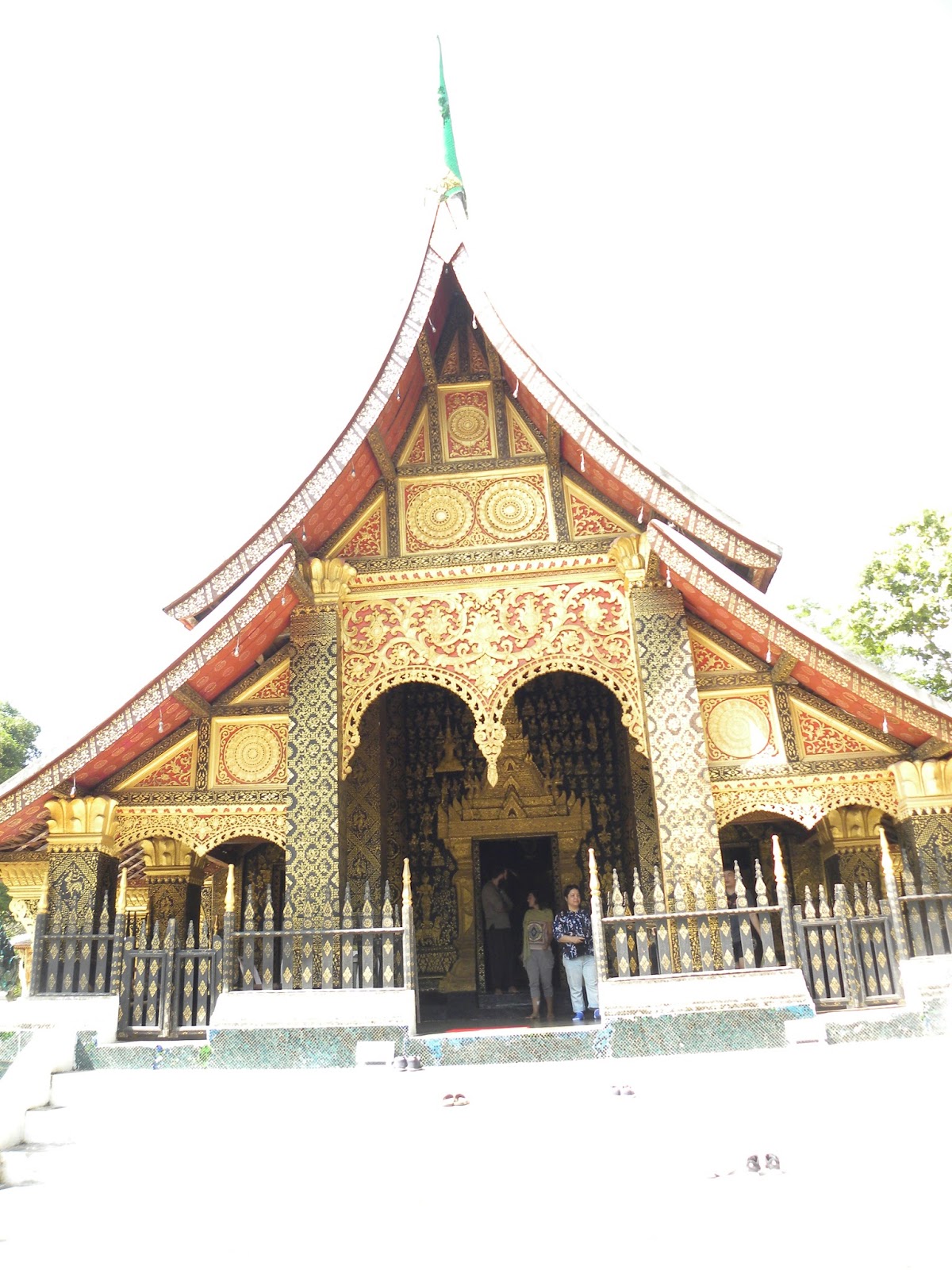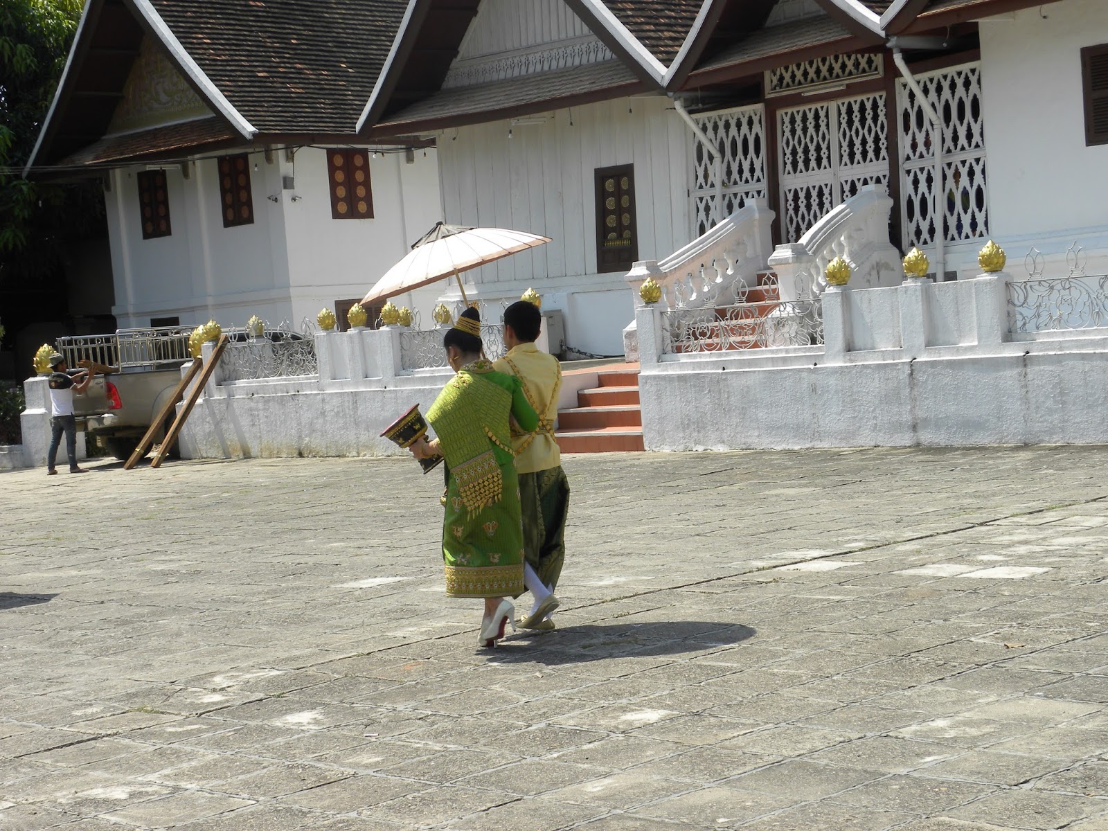 Finalmente cheguei no Wat Xieng Thong, que cobra 20.000 kips pelo ingresso (apenas os templos mais procurados cobram entrada). Assim que subi as escadarias, observei que era um complexo formado por três grandes construções e outras pequenas. Ao contrário dos templos que visitei anteriormente, esse tinha turistas. Um casal local posava para fotos de casamento com roupas típicas.