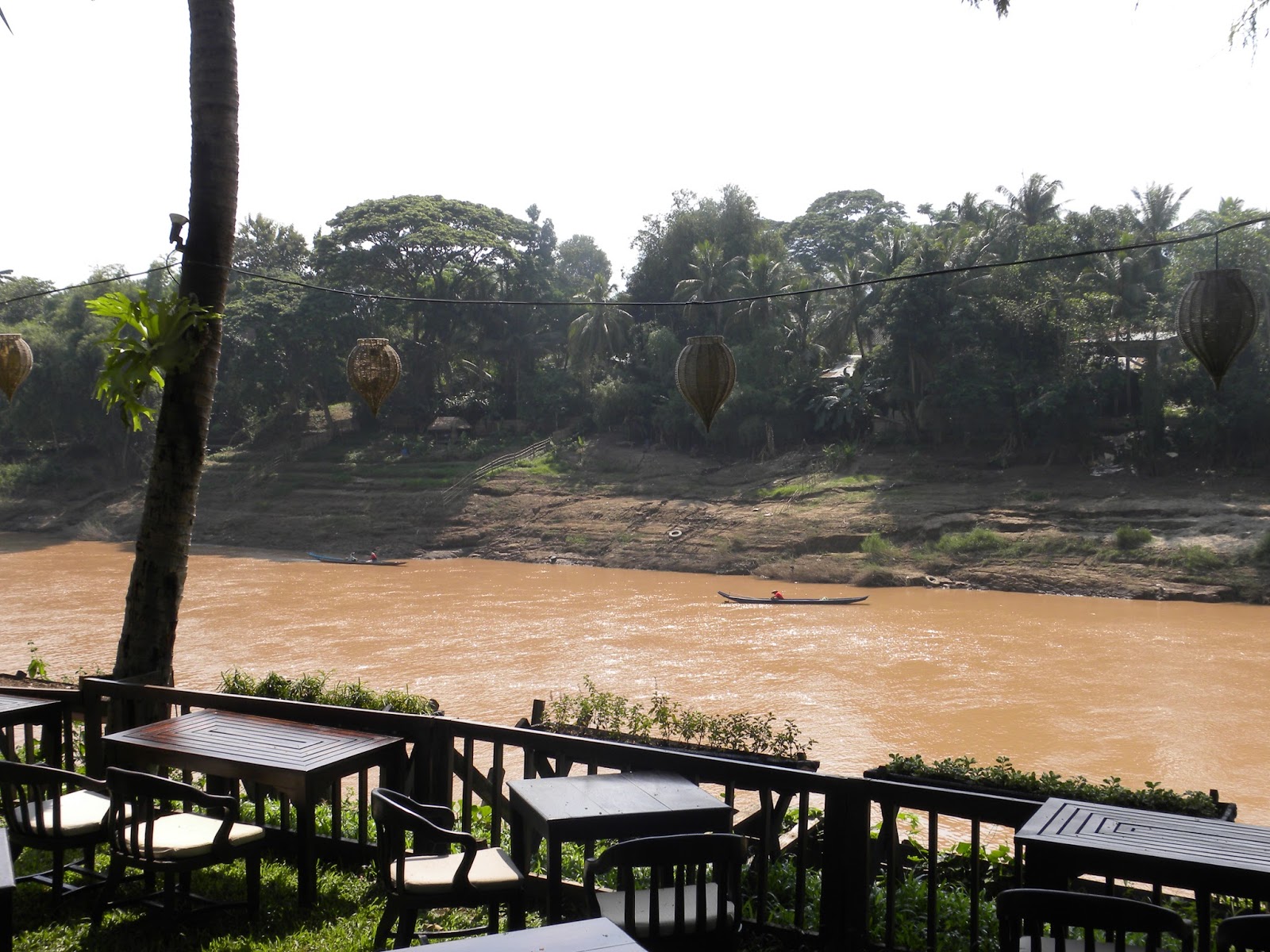 Quando cheguei na barraca que a tailandesa ficou almoçando, conclui que já tinha ido. Resolvi caminhar pelas margens do Mekong River e vi um restaurante rústico construído sobre as margens do rio. Entrei e pedi um macarrão vegetariano e uma limonada. O dono disse que estava sem energia elétrica, logo, teria que optar por outra bebida. Avisou-me que conseguiria fazer um smoothie (o gosto era de limonada, mas custava mais caro!). O noodles (16.000 kips) estava maravilhoso! Um simples macarrão de arroz com alguns vegetais! Fiz questão de cumprimentar a cozinheira.