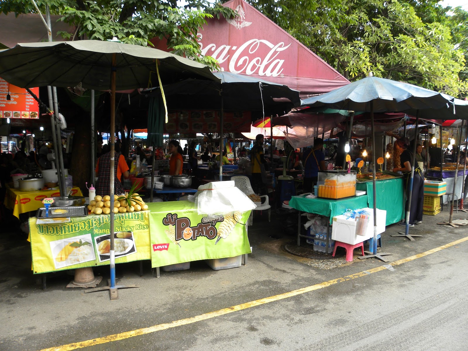 Por volta das 13h, percebi que estava faminta e tonta, pois não tinha tomado sequer café da manhã. No exterior do mercado, existe uma feirinha com diversas opções de comidas. Primeiro comprei uma melancia no palito. Depois sentei numa barraquinha e pedi o Pad Thai com camarões. Admito que não tive coragem de experimentar lula, ovos de lula, etc. As comidas tailandesas são muito apetitosas.