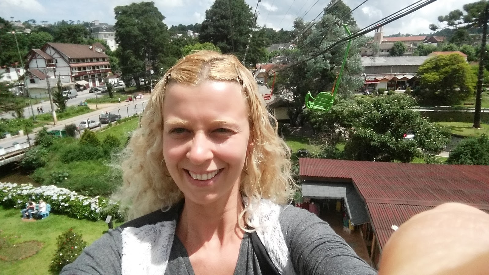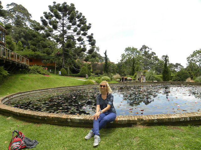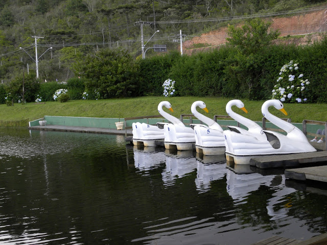 Minha mãe e irmã quiseram passear no comércio popular local para visitar as lojas (tudo o que não gosto de fazer durante uma viagem). Em seguida, pegamos o táxi na praça até o hotel (R$12,00) para almoçar. O tempo começou a ficar nublado, mas seguimos para o Parque Capivari, pois queria andar no teleférico. Minha sobrinha seguiu para o pedalinho em formato de cisne (R$14 por 10 minutos), mas o teleférico foi fechado, pela iminência da chuva. Fiquei frustrada.