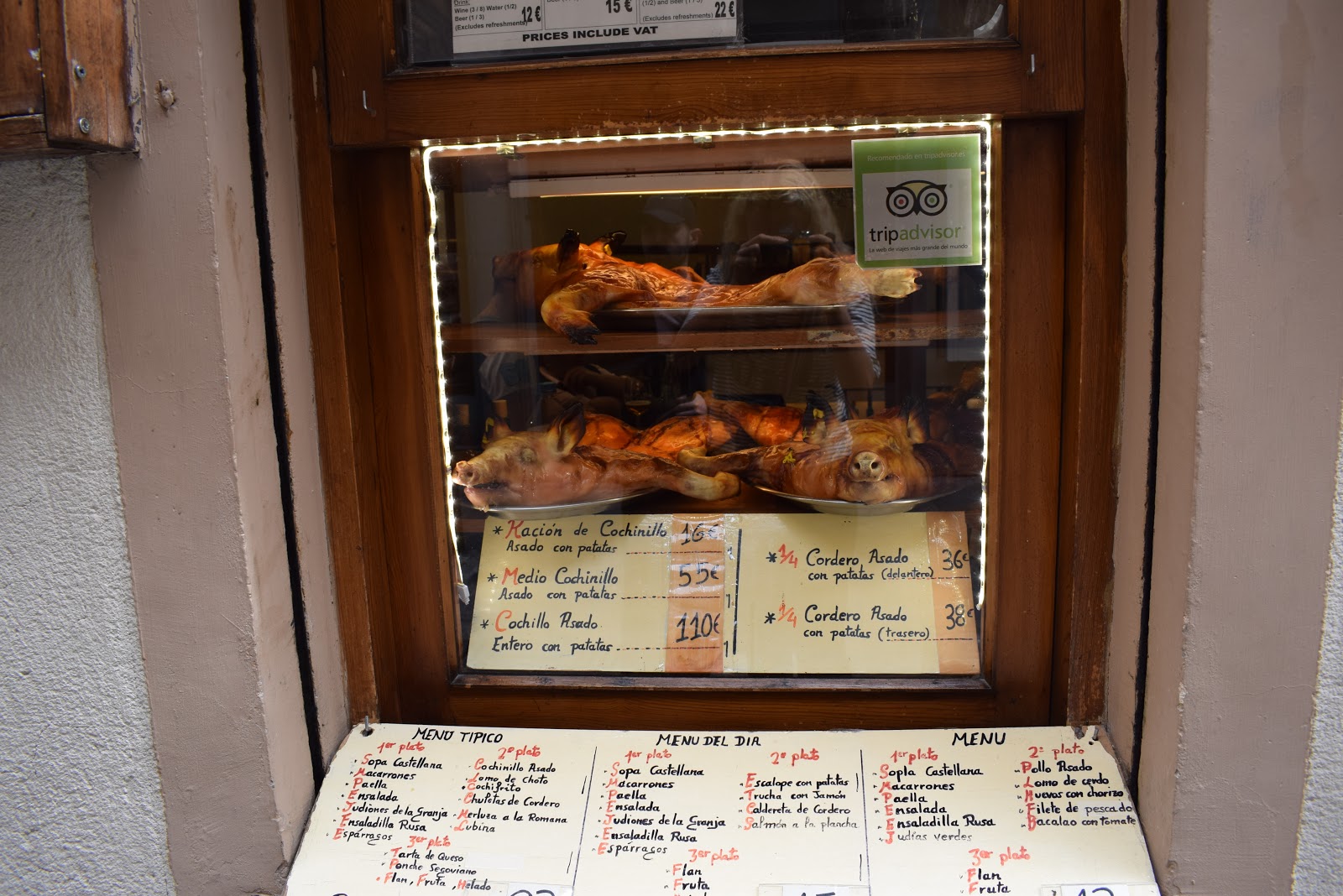 O outro símbolo da cidade é gastronômico: el cochinillo, uma espécie de “leitão à pururuca” que tem destaque em quase todos os restaurantes. Preferimos procurar um lugar com menu completo e barato. Optamos pelo Restaurante Lázaro. Dois pratos, vinho, café e sobremesa por 12 euros. Pedi a famosa Paella com frutos do mar – estava deliciosa, além de croquetes de jamón, que vieram acompanhados com batatas fritas. Trouxeram uma garrafa grande de vinho, para dividirmos, eu e meu amigo, e a sobremesa foi flan. Aproveitamos para descansar e usar o banheiro.
