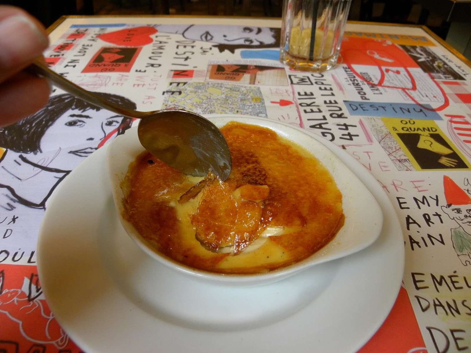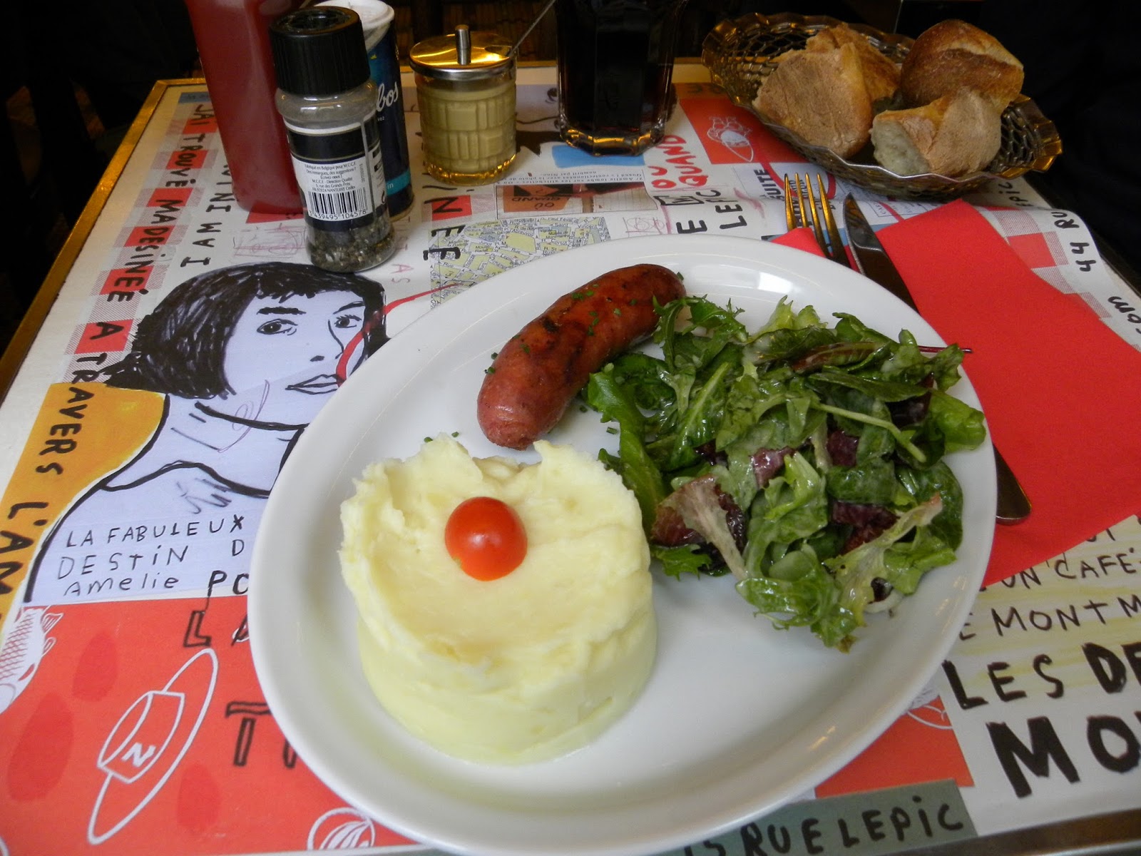 Dizem que estão acostumados com os turistas que entram apenas para tirar fotos, mas preferi almoçar. Pedi uma salsicha acompanhada de purê de batatas e salada. E a sobremesa não poderia ser diferente! Queria ter o prazer de quebrar a camada dura do crème brûlée como a Amélie fazia!!!